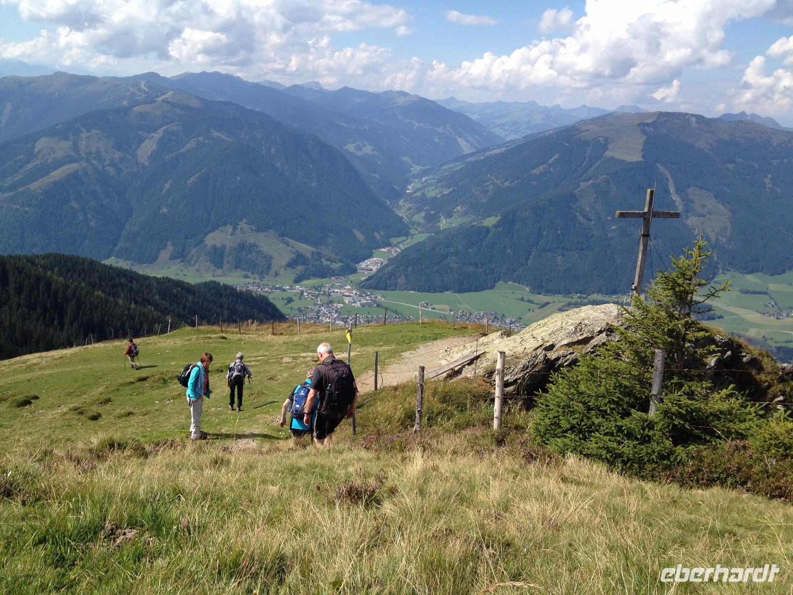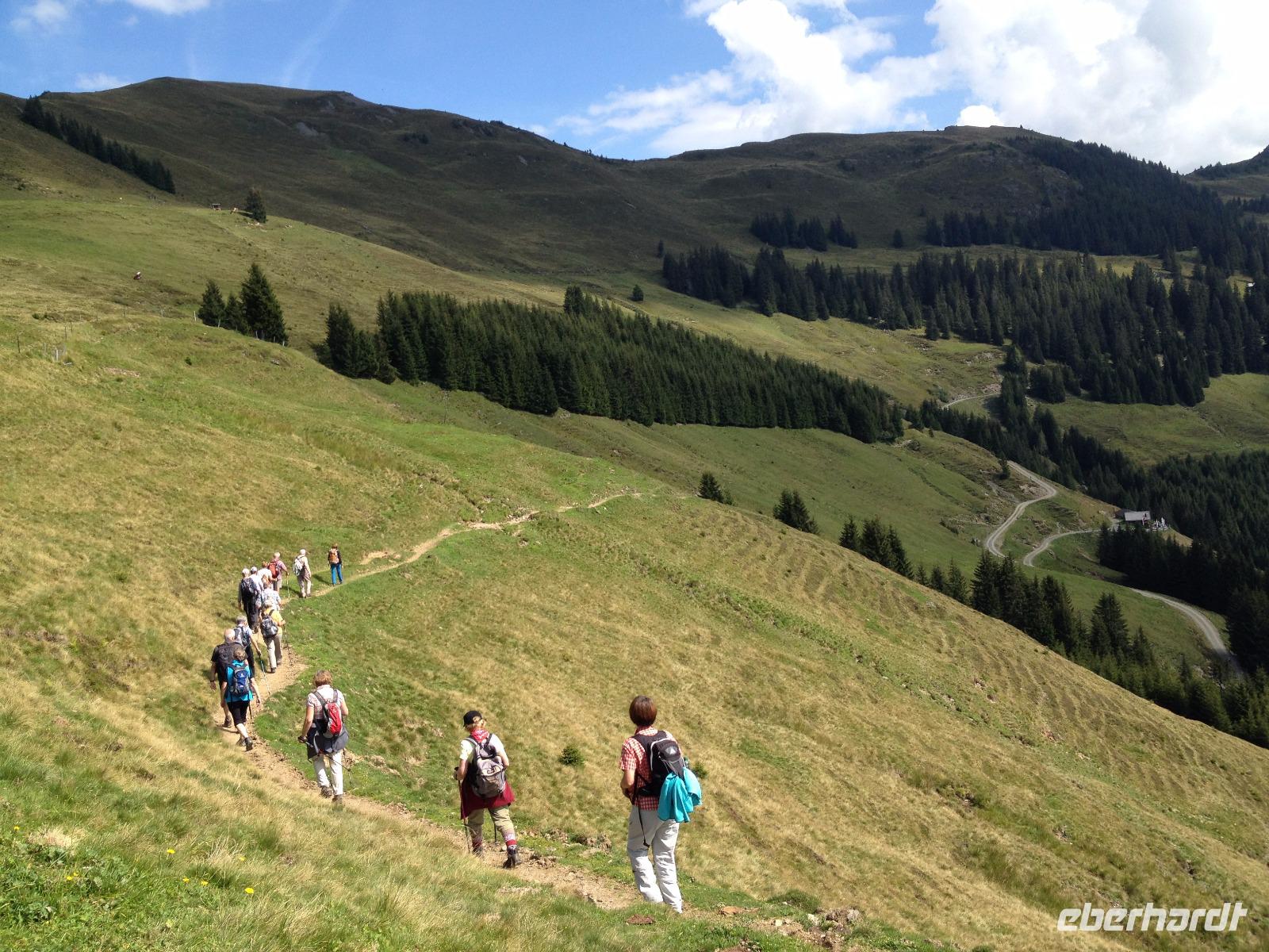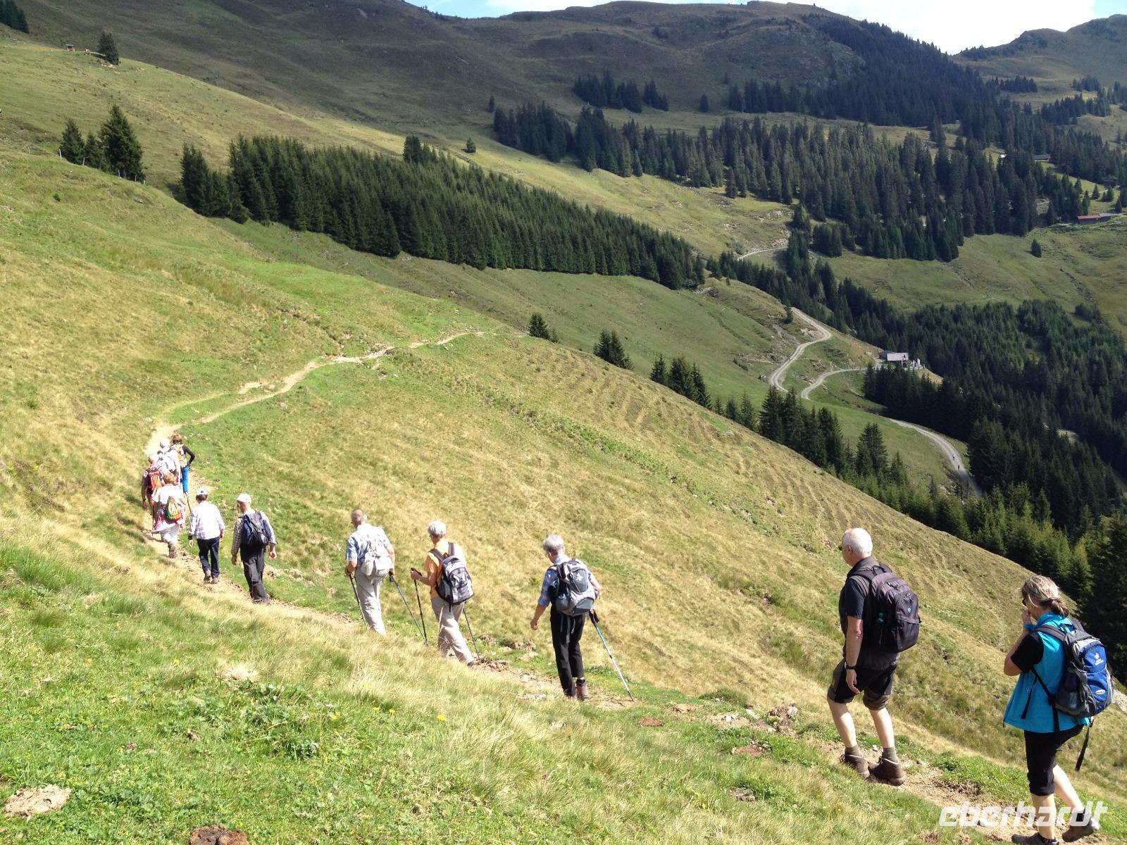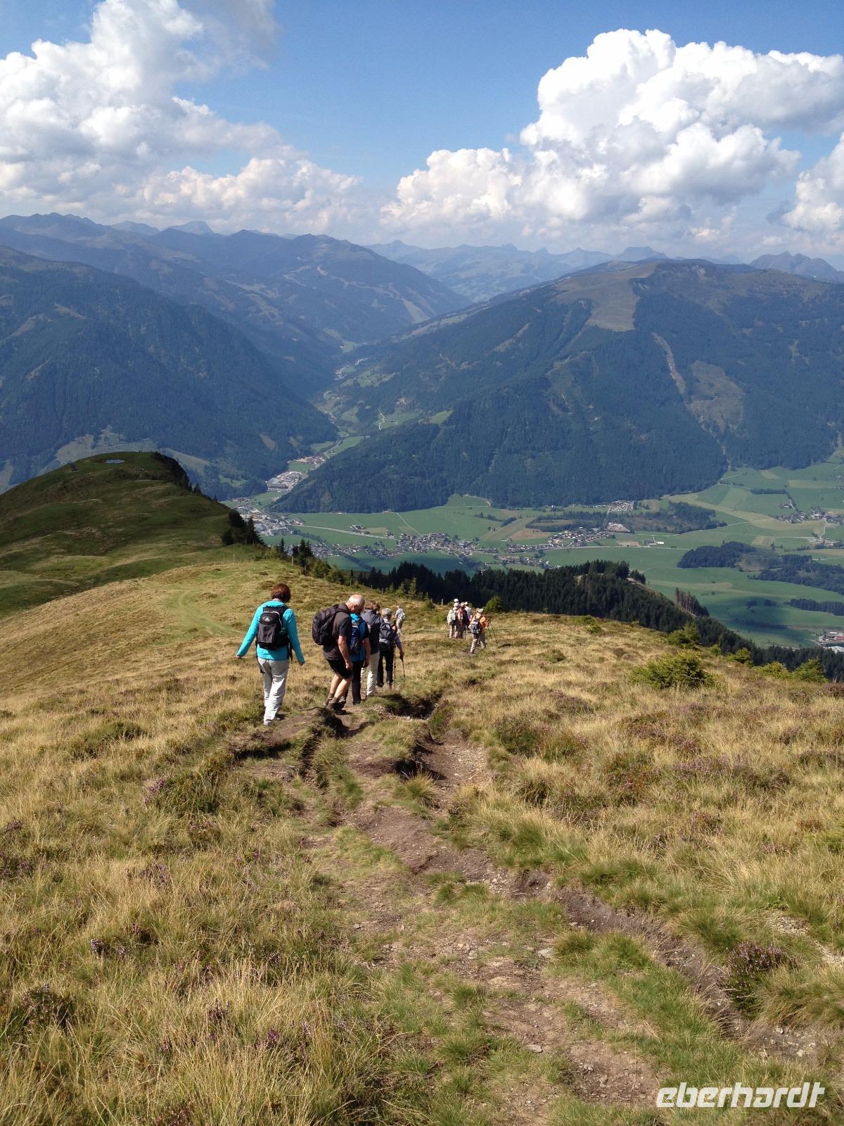 Der Mittwoch verlief nach Plan, Sonnenschein, der Pinzgauer Spaziergang und gute Laune waren unsere heutigen Wegbegleiter. Nach dem Frühstück fuhren wir wieder mit der Schmittenseilbahn auf die Schmittenhöhe, wie bereits am Montag und liefen diesmal aber einen anderen, schwierigeren Weg. Es ging bergauf und bergab und um 11:30 Uhr war für uns erstmal die Zeii gekommen Mittagsrast einzulegen. Wir verzehrten unsere Brote und pflückten noch viele Heidelbeeren, welche überall am Weg zu finden waren. Weiter ging es zur Hochsonnbergalm in der wir uns erneut niederließen und bei Buttermilch oder einem kühlen, isotonische Hopfengetränk den Ausblick ins Tal genossen. Im Anschluss gingen wir zurück zur Schmittenbahn und fuhren wieder hinab zu unserem Hotel wo wir wieder etwas Freizeit hatten bis uns das Abendbrot erwartete.