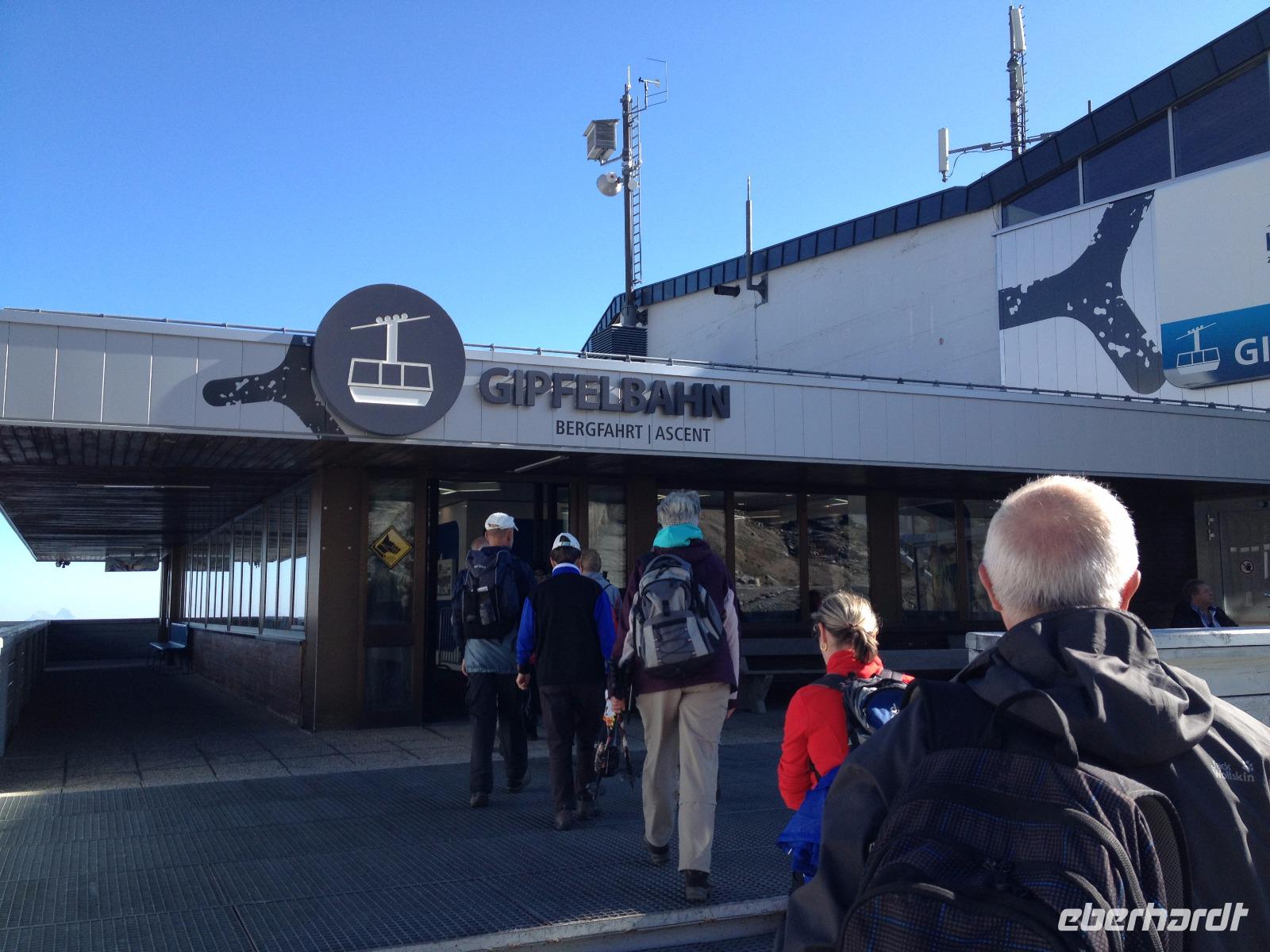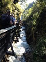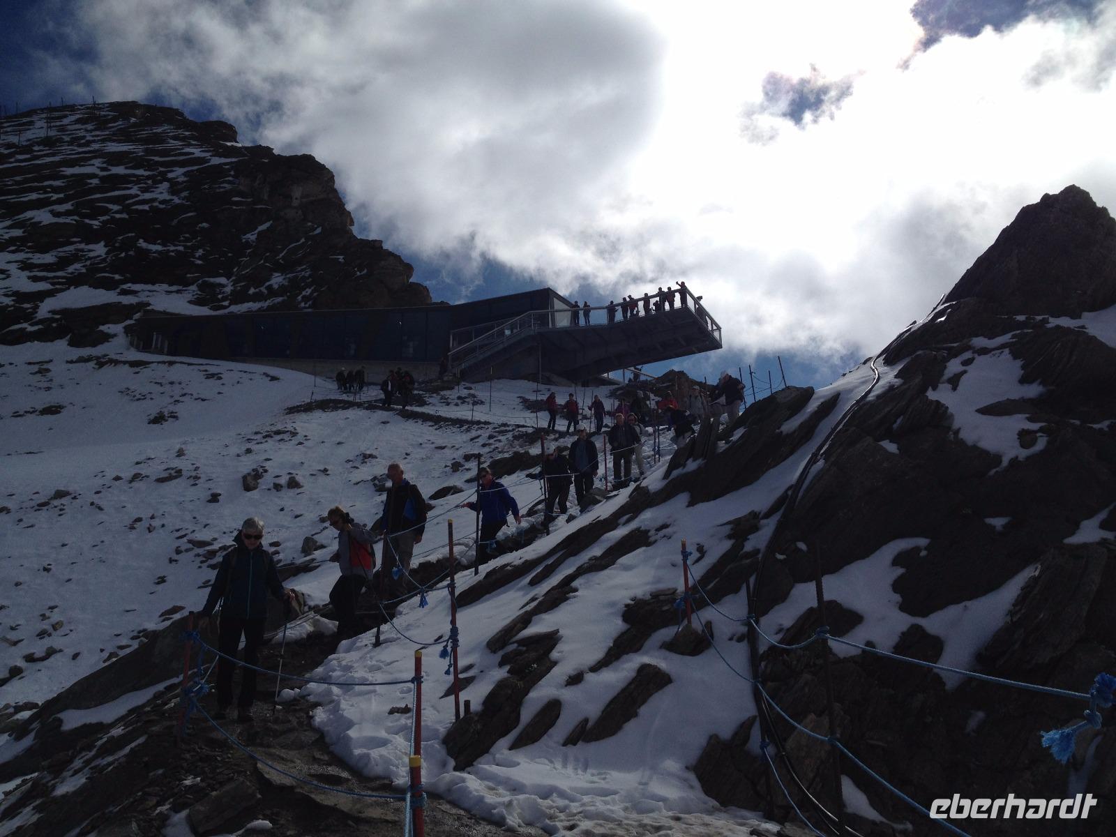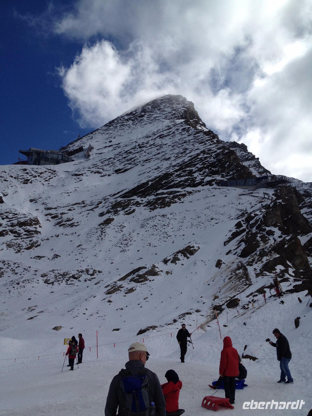 Heute, am Donnerstag, war es soweit und die Tour auf das Kitzsteinhorn stand uns bevor. Nachdem wir uns beim Frühstück gestärkt und die Schuhe geschnürt hatten kamen wir um 9:30 Uhr mit dem Taxi an der Talstation am Kitzsteinhorn an. Nun ging es hinauf über drei Lifte bis auf 3029 Meter über dem Meeresspiegel. Als wir oben ankamen legten wir eine kurze Pause ein um sich an die Höhe und die merklich dünner gewordene Luft zu gewöhnen. Währenddessen kümmerte sich Herta darum die Uhrzeit für die nächste Führung herauszufinden und zu unserem Glück startete diese im Anschluss an unsere Pause. Durch einen Gang welcher in das Gestein der Felsen geschlagen war führte man uns vorbei an einigen erklärenden Exponaten welche zum Teil aus der Bauzeit des Tunnels stammen. Weiterhin führte man uns an einer Wand entlang, von der uns gesagt wurde, dass es nur einen Meter hinter dieser Wand 500 Meter in die Tiefe ging, was doch sehr beeindruckend und zum Anderen auch beängstigend war. Aber da wir alle gut auf der Aussichtsplattform angekommen sind entschlossen wir uns das Gruppenfoto gleich hier, mit dem Großglockner im Hintergrund zu schießen. Danach gingen wir entlang des Schnees über einen schmalen Weg bis zum Schlittenhang an dem wir uns nicht zweimal bitten ließen und uns den nächsten Schlitten schnappten und den Hang hinabrodelten. Als wir unten angekommen sind traten wir den Rückweg zur Seilbahn an und kamen um 13:30 Uhr an der Talstation wieder wohlbehalten an. Aber damit war der Tag noch nicht abgeschlossen und wir wanderten entlang eines kleinen Gebirgsbachs bis zur Sigmund-Thun-Klamm welche wir mit der Sommer - Karte auch kostenlos besichtigten durften. Mit einigen schönen Fotos und etwas nassen Füßen gingen wir zurück bis zum Umspannwerk der Hochgebirgsstauseen, von denen uns am Dienstag bei der Führung erzählt wurde. Nachdem wir kurz auf die Taxen gewartet haben wurden wir zurück zum Hotel gebracht und hatten noch etwas Freizeit bis zum Abendessen. Nach dem Abendessen saßen wir noch gemütlich zusammen und erzählten von bisherigen Erlebnissen und allem was uns in den Sinn kam.