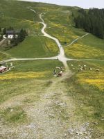 Wir wurden aber entschädigt, der Blick von der Gondel auf den See, die Schnee bedeckten Berge in der Ferne und die vielen Blumenwiesen mit den Rindern waren schon atemberaubend.