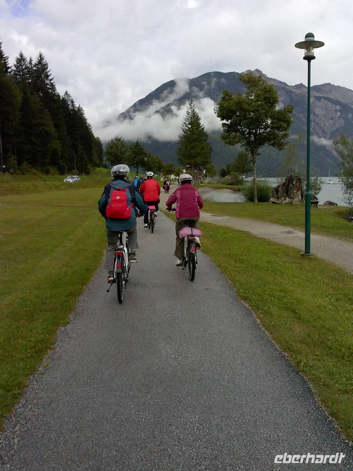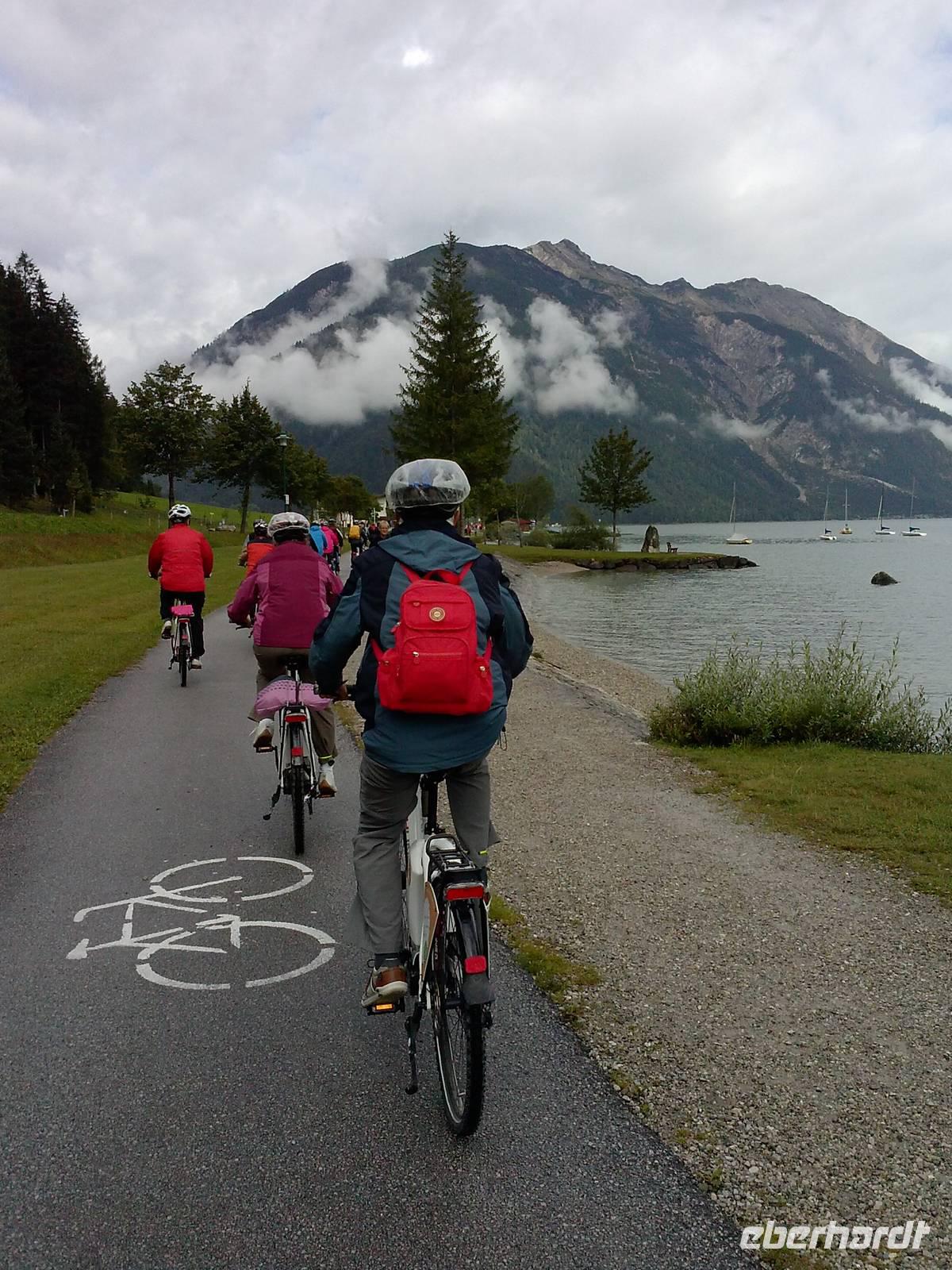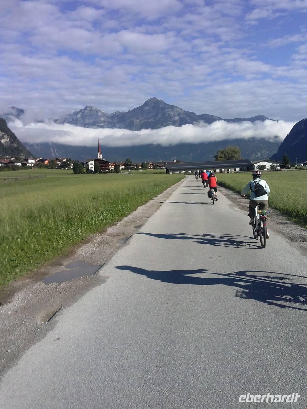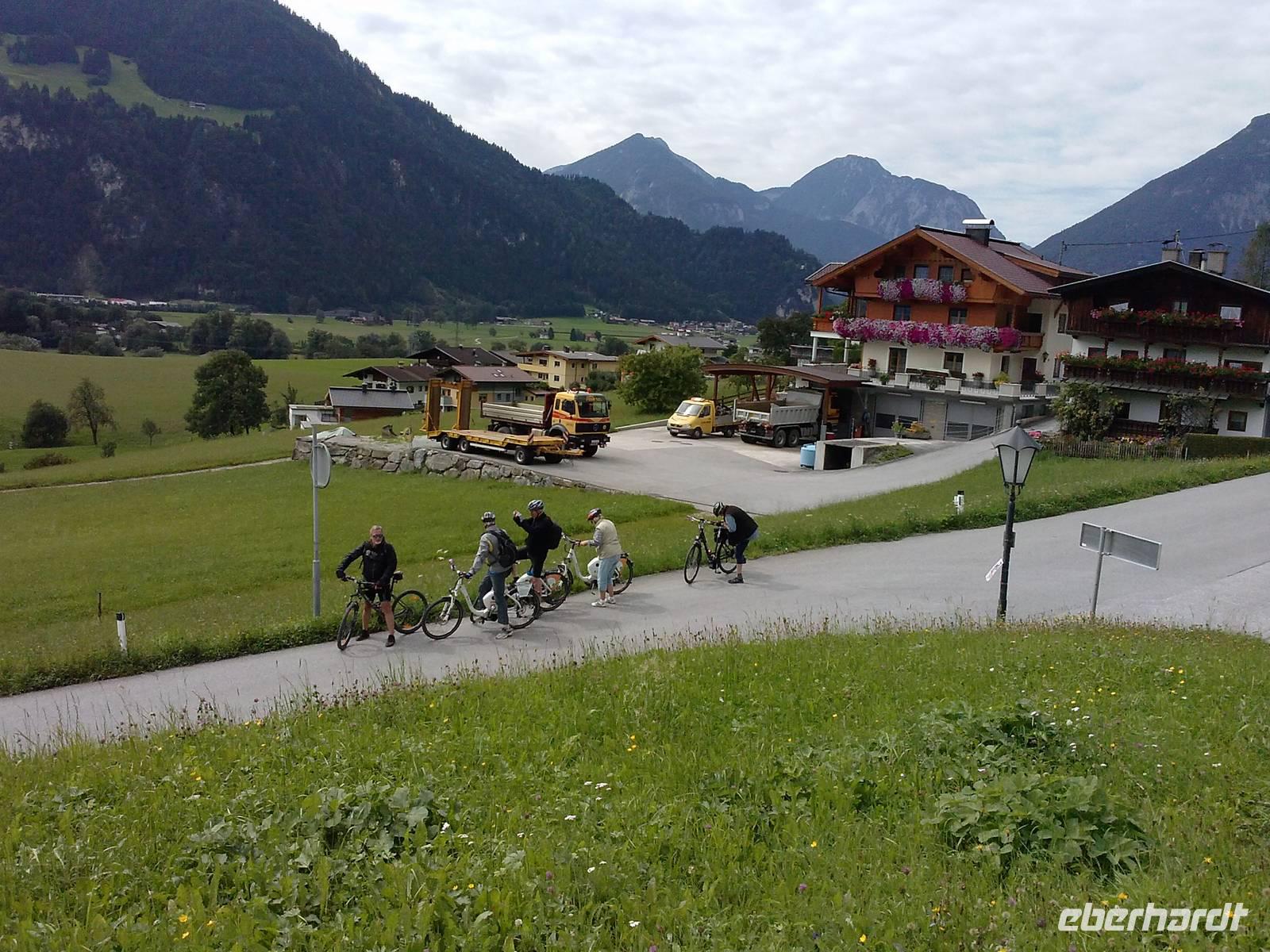 Früh am Morgen starten wir mit unserem Bus gen Zillertal. Da wir als Radgruppe nicht die Einzigen sind, die in diese schöne Ecke Tirols möchten, ist der Bus ordentlich gefüllt und wir haben mehrere Haltepunkte anzufahren. Gen Süden wird auch der Verkehr immer dichter und so entschließen wir uns, die Inntal-Autobahn zu verlassen und den schönen Weg über den Tegernsee und später über den Achensee zu fahren - hier sparen wir zwar nicht wirklich Zeit, aber dafür ist es schön! Dementsprechend spät kommen wir im Hotel an. Wir beziehen unsere Zimmer und können schon wenig später unsere E-Bikes begutachten. Die Sattel werden angepasst, die neue Schaltung ausprobiert und natürlich fährt jeder von uns eine kleine Proberunde. Etwas ungewohnt, aber wir haben ja eine Woche Zeit, um mit den Rädern warm zu werden. Am Abend kommen wir das erste Mal in den Genuß des hervorragenden Essens vom "Zillertaler Grillhof" und lassen dann den Tag in gemütlicher Runde ausklingen.