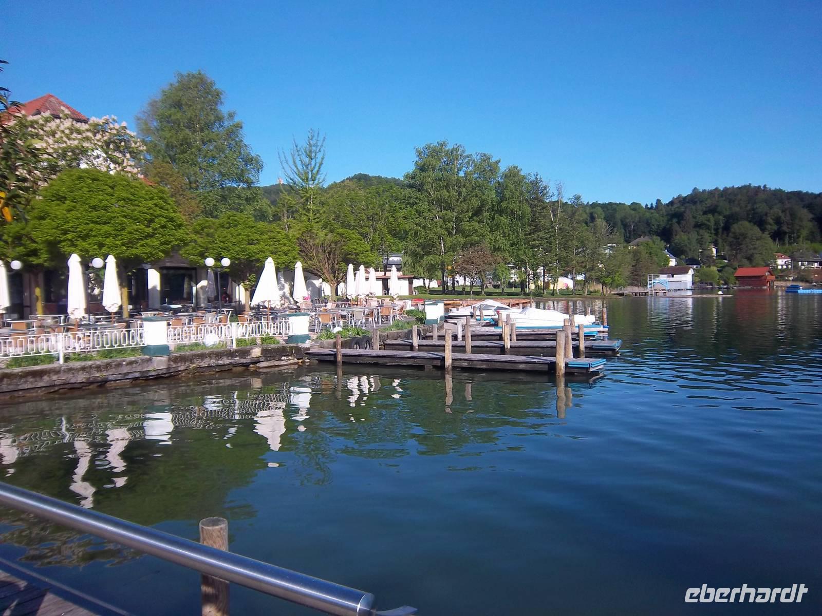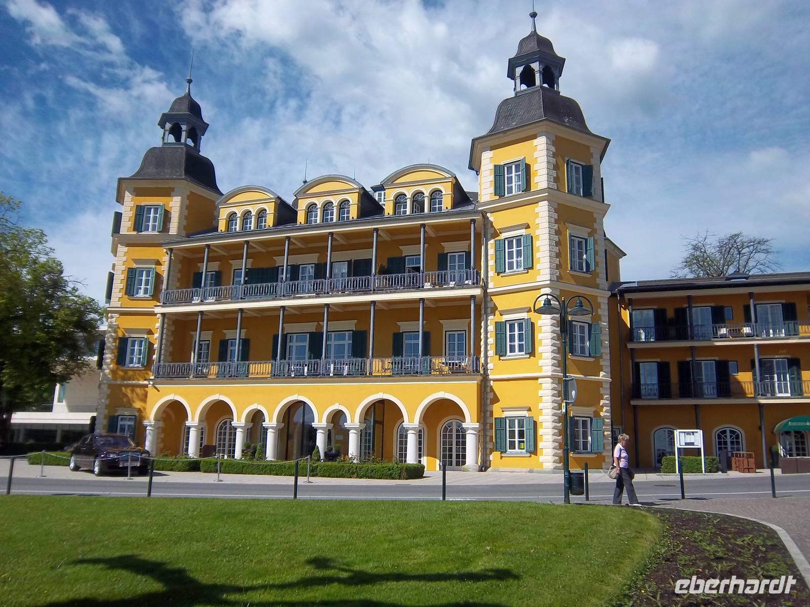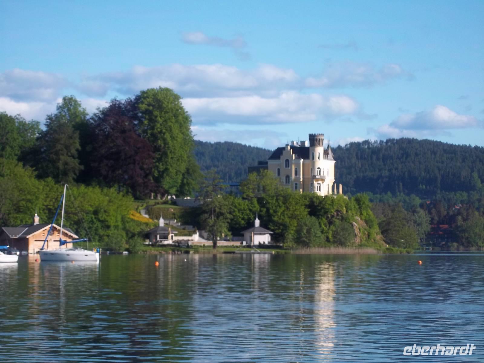 Der Bus brachte uns bei trübem Wetter zunächst nach Maria Wörth. Sehr fotogen zeigte sich trotzdem das Ensemble Winterkirche, Sommerkirche und Karner. Weiter ging es die Süduferstraße entlang nach Velden, wo wir das „Schloss am Wörthersee" aufsuchten, nach umfangreichem Umbau heute ein Hotel der gehobenen Klasse, in welchem man das preiswerteste Zimmer „schon" für etwa 250 Euro pro Nacht buchen kann. Nach oben sind die Preise selbstverständlich offen. Das Casino darf man betreten, wenn man 27 Euro löhnt. Dafür kann man einen Chip zu 30 Euro einlösen, den man dann auch verspielen darf. Wir haben unserem Glück nicht getraut und begaben uns lieber wieder zur Bushaltestelle.