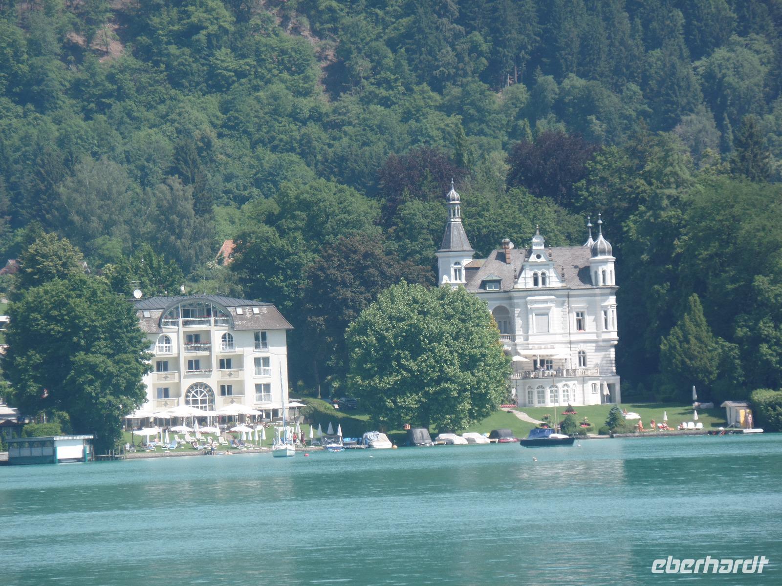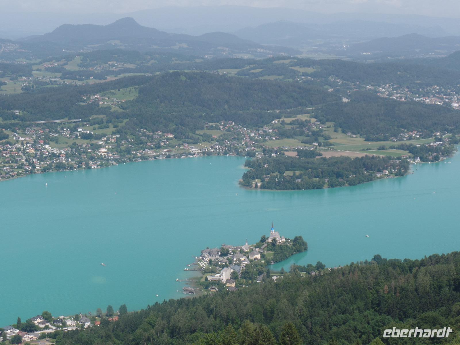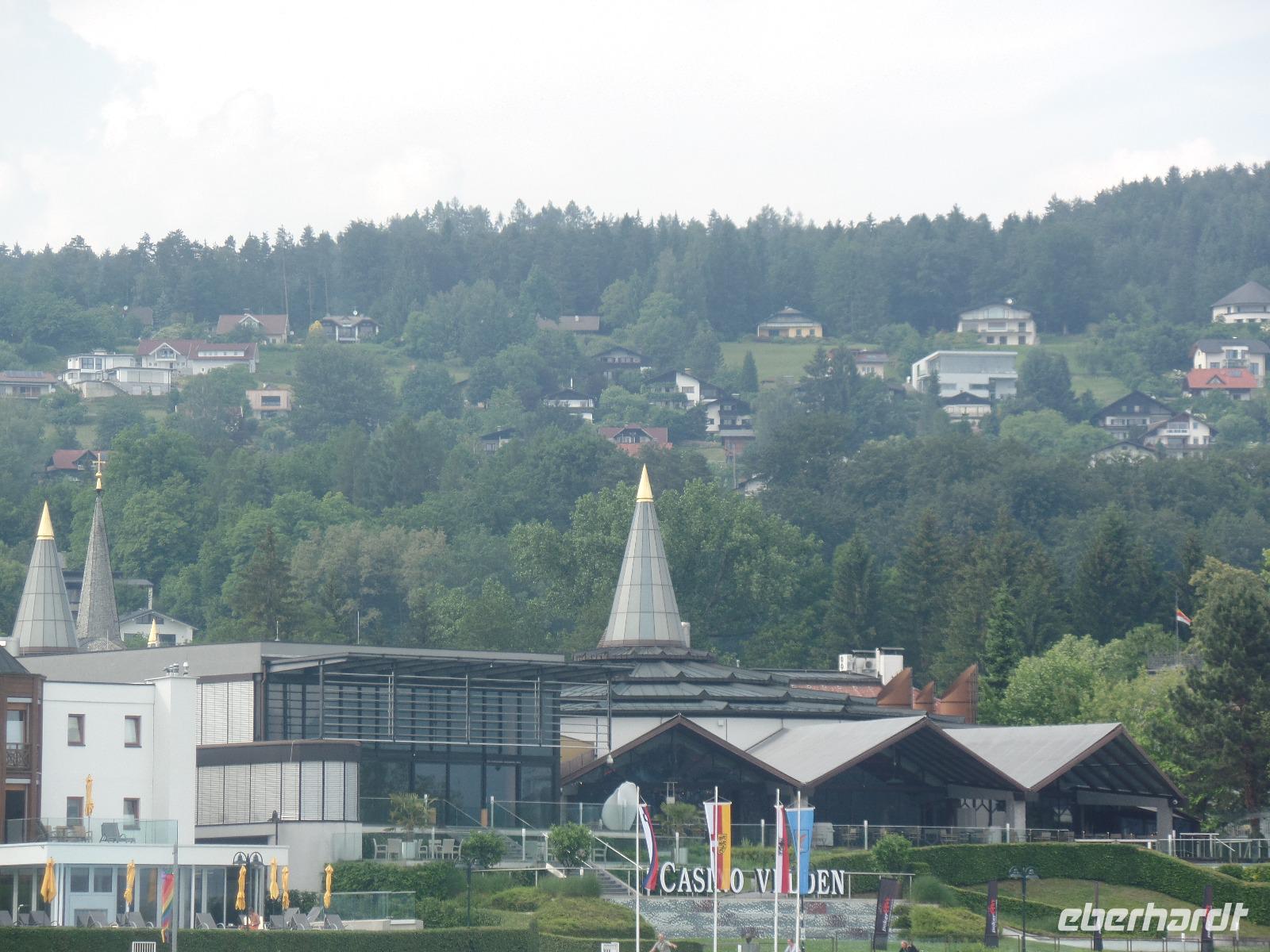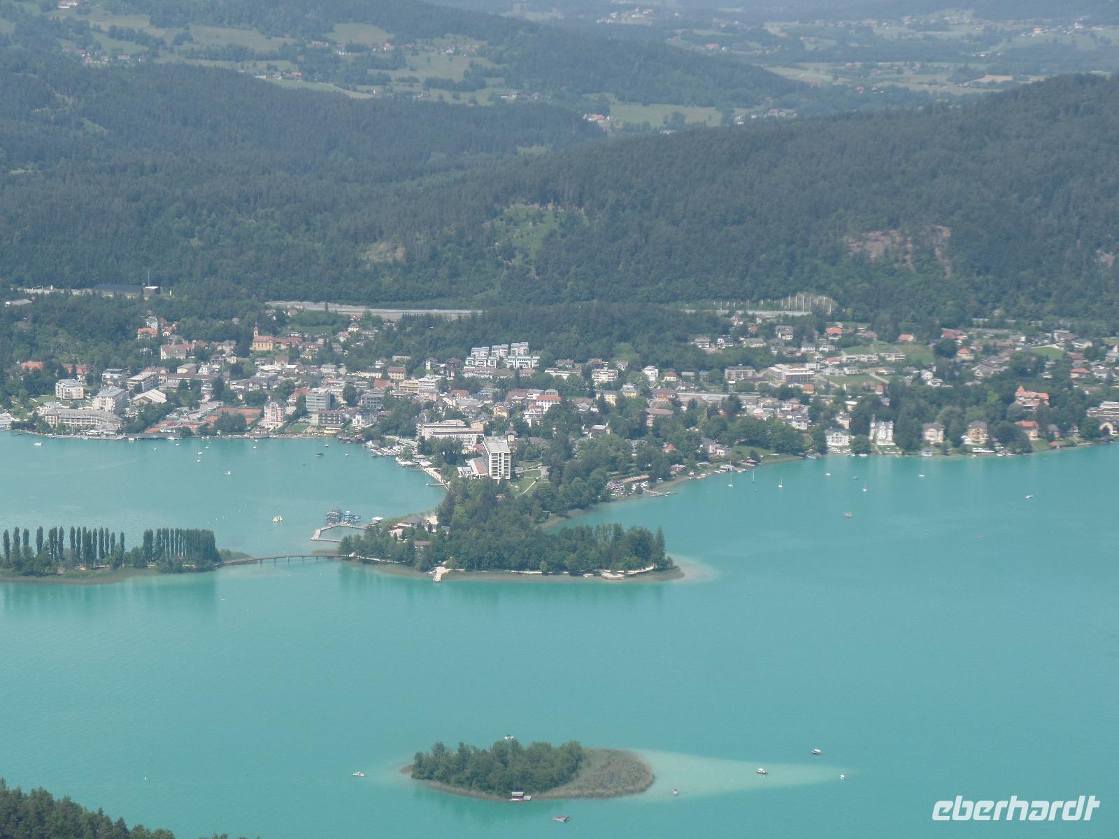 Der größte See Kärntens sollte entdeckt werden. In Velden unterhalb des Schloss am Wörtersee legte das Schiff zu einer Seerundfahrt ab. Auch heute bei schönem Wetter konnten wir die Fahrt genießen. Entlang der Seeufer hatten wir den Blick auf einige tolle Villen der „Schönen und Reichen". Unser Kapitän erzählte dazu so einige Anekdoten und Geschichten. Die 2- stündige Fahrt verging wie im Flug. Aber es stand ja noch ein besonderes Ziel bevor, der Pyramidenkogel. Schon während der Schifffahrt war er zu sehen. Auf dem Aussichtsberg Pyramidenkogel 851m befand sich ein Aussichtsturm. Er wurde abgerissen und 2013 der neue Aussichtsturm eröffnet. Mit 100m Höhe ist er der höchste Aussichtsturm der Welt aus Holz. Ein imposantes Meisterwerk. Der Fahrstuhl brachte uns bequem nach oben. Ein phantastischer Rundumblick erwartete uns. Der Wörthersee war in seiner vollen Schönheit zu sehen und der Blick auf die Karawanken bis hin zu den Julischen Alpen liessen auch keine Wünsche offen. Auch heute nutzen wir noch einmal die Gelegenheit für ein Bad im Ossiacher See.