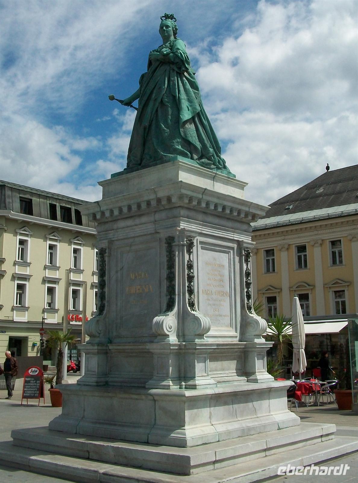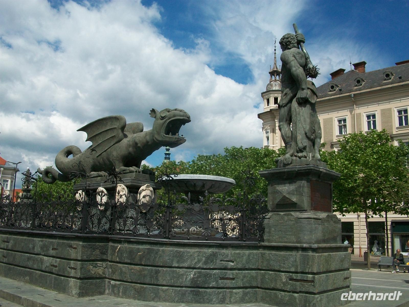 Ein kurzer Spaziergang und wir sind schon im Zentrum angelangt. Hier, am Neuen Platz, beginnt dann für unsere Gäste die Freizeit in diesem schönen Ort. In der Mitte des Platzes stehen zwei schöne Denkmäler, eins von Maria Theresia und das andere vom Lindwurm. Dieser wurde der Legende nach von einem Riesen besiegt und sollte der Stadt bis dahin viel Unglück gebracht haben.