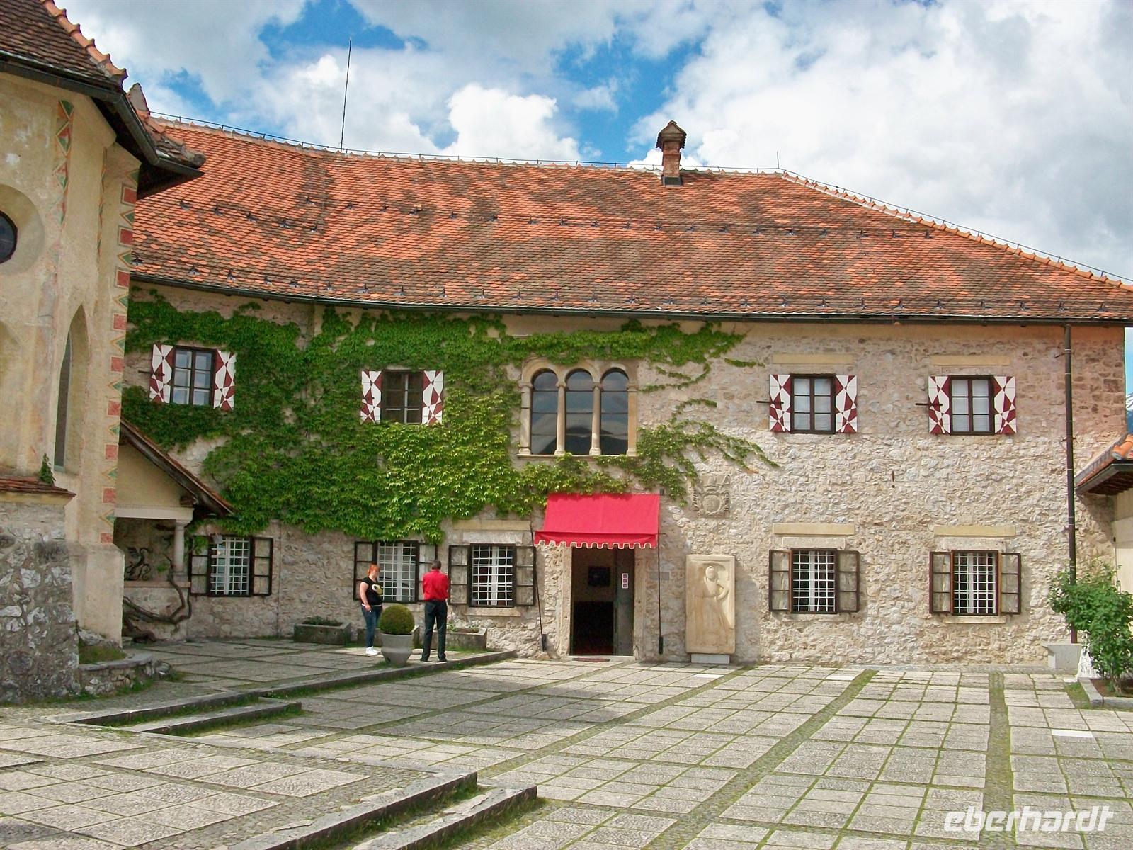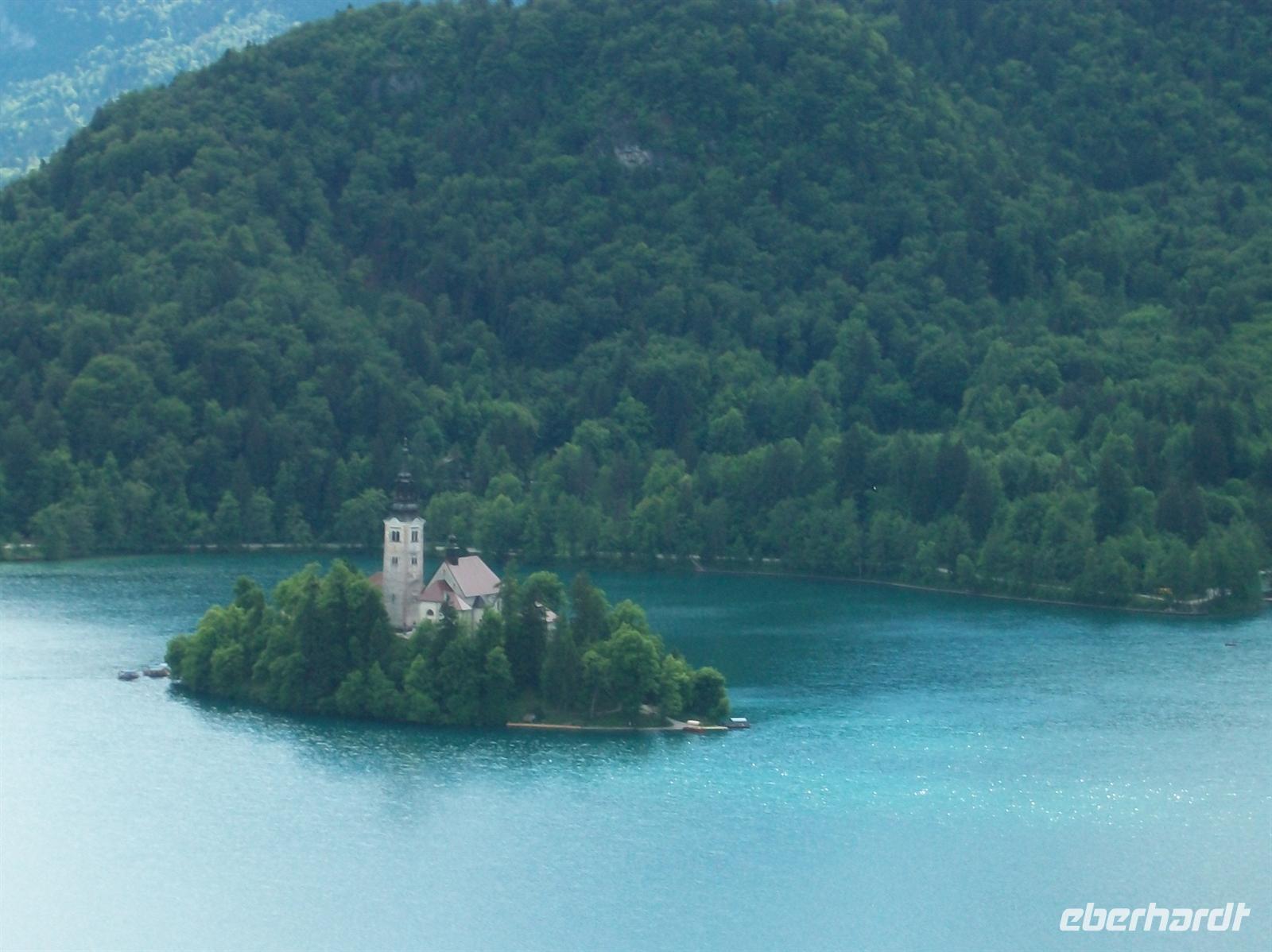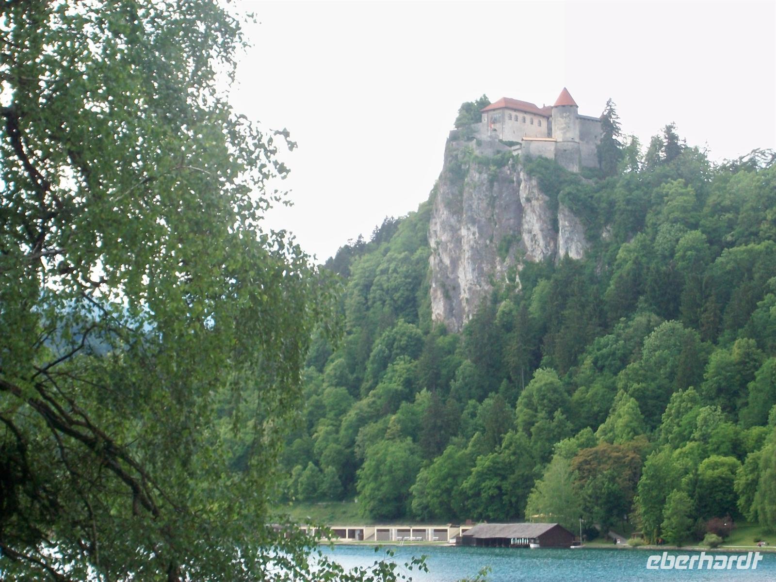 Nicht ohne Anstrengung, aber lohnenswert, ist der Aufstieg zur Burg. Ich bin mit einem Teil unserer Reisegruppe auf dem Weg hinauf, von hier oben hat man einen phantastischen Ausblick auf den See und die Insel mit Kirche. Vor uns ist ein Taleinschnitt zu sehen, dorthinein führt eine Straße in den Nationalpark Triglav; rechts ist die dreizackige Spitze dieses höchsten slowenischen Berges zu sehen und links zieht sich der Hauptkamm der Karawanken hin. Das Auge möchte sich gar nicht satt sehen an dem schönen Blick, egal wohin man schaut.