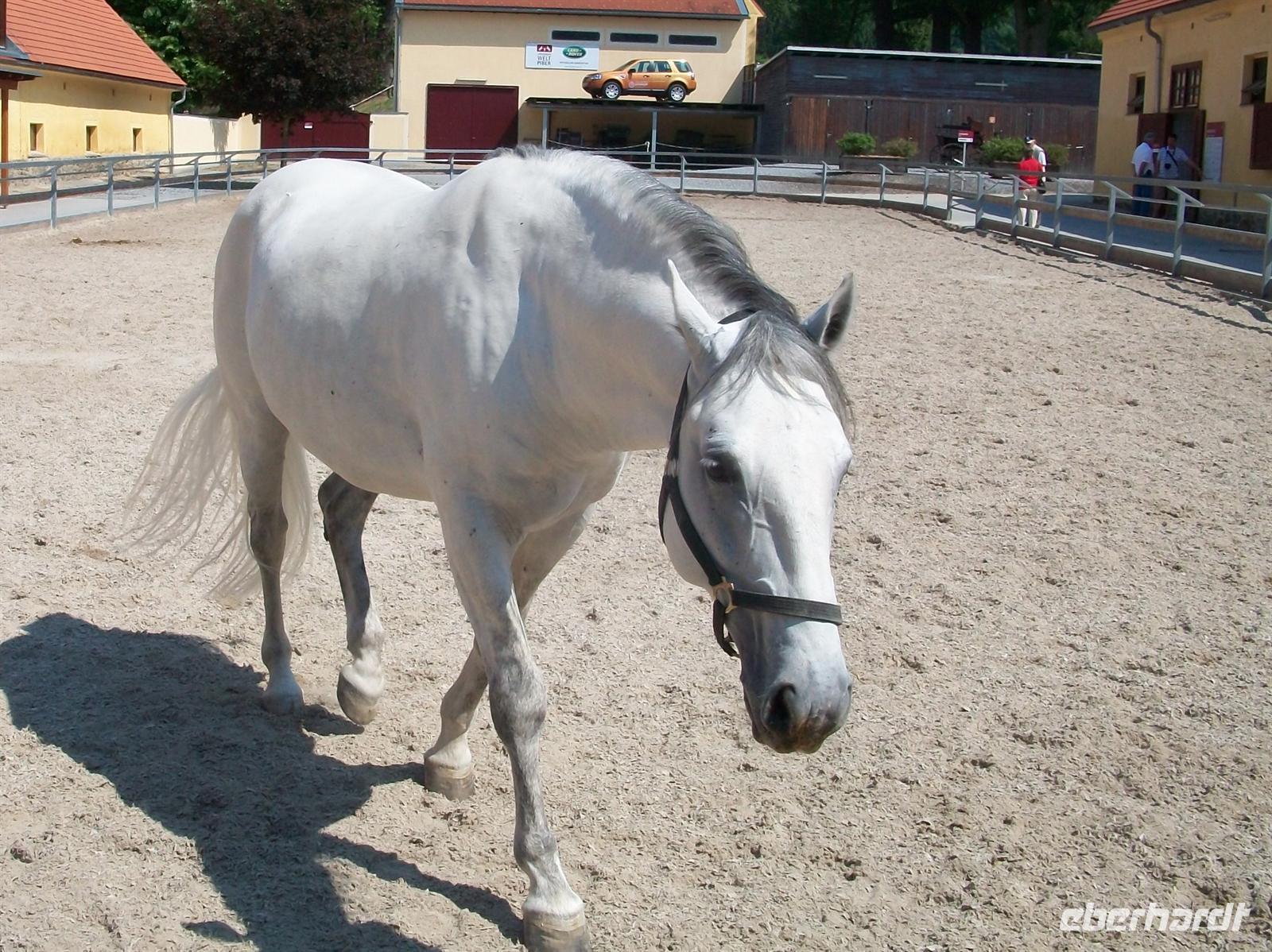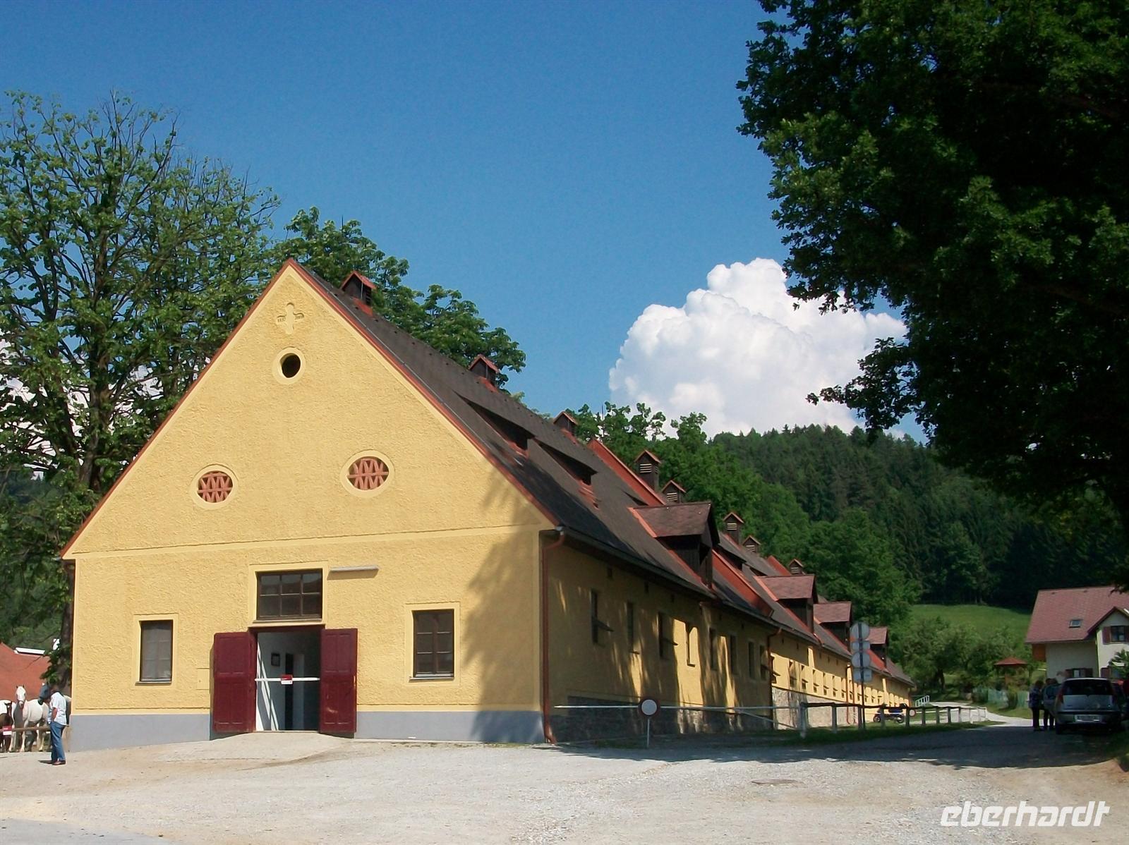 Unser Ziel heute Vormittag ist das bekannte Lipizzanergestüt Piber. Gegen 10.10 Uhr taucht vor uns auf einem Hügel das graublaue Gebäude eines Schlosses auf. Dieser malerische Anblick sagt uns dass wir fast am Ziel sind. Es ist das Schloss Piber das seine barocke Form zu Beginn des 18. Jahrhunderts bekam. Dahinter liegt das Gestüt, ein kleiner Fußweg bergauf bringt uns zum Eingang. Dieses Gestüt gibt es hier seit 1918, der Ursprungsstandort in Lipizza ging nach dem ersten Weltkrieg an das Königreich der Serben, Kroaten und Slowenen und man begründete hier in Piber zu dieser Zeit das neue Gestüt. Bei der nun folgenden Führung können wir mit eigenen Augen sehen welch prachtvolle Anlage das ist. Mit unserer Führerin gehen wir hinauf zur Reithalle und können zwei Pferde beim Training beobachten. Das sieht alles sehr elegant aus wie unter Anleitung die Tiere Schrittkombinationen einüben.