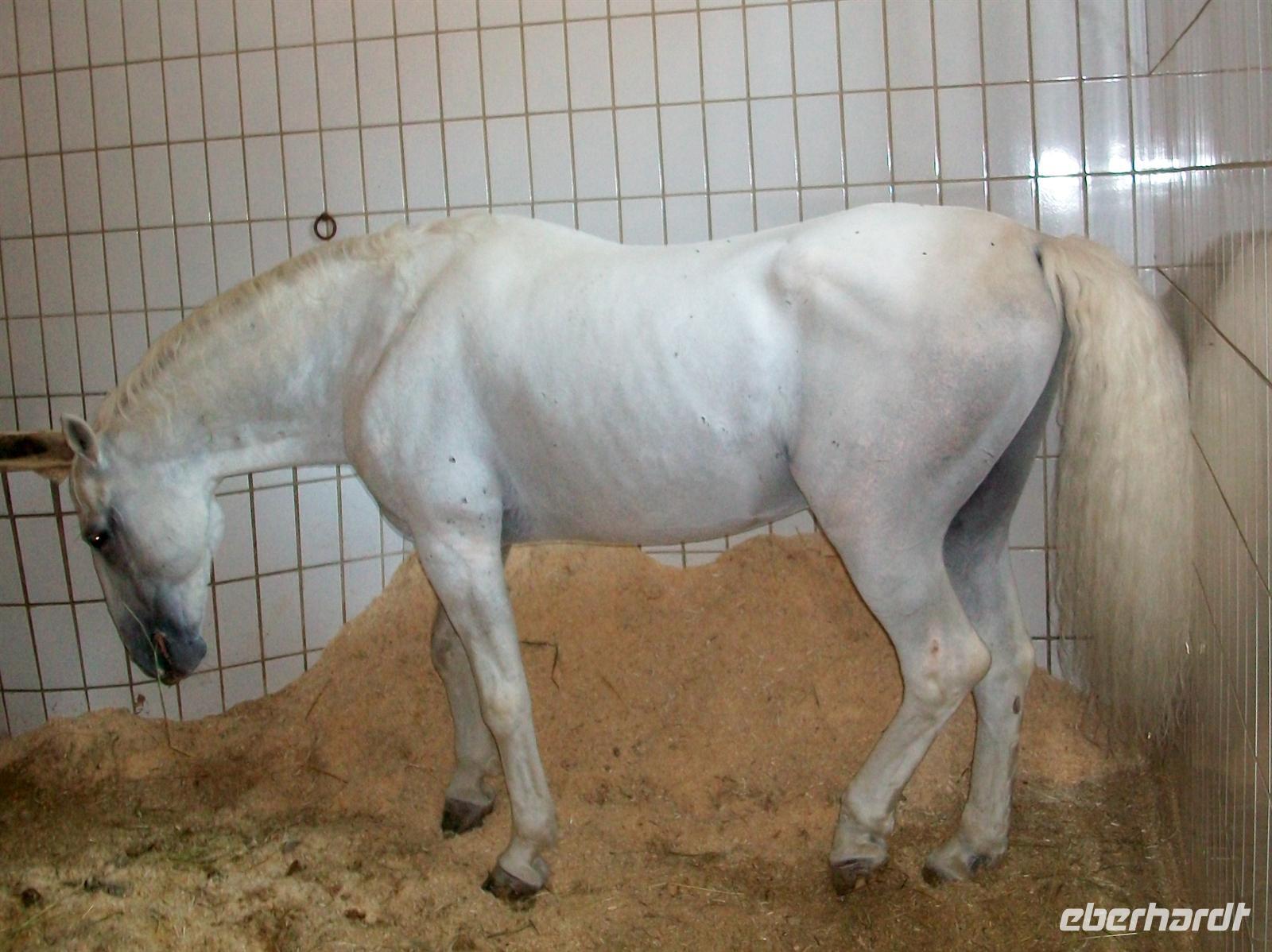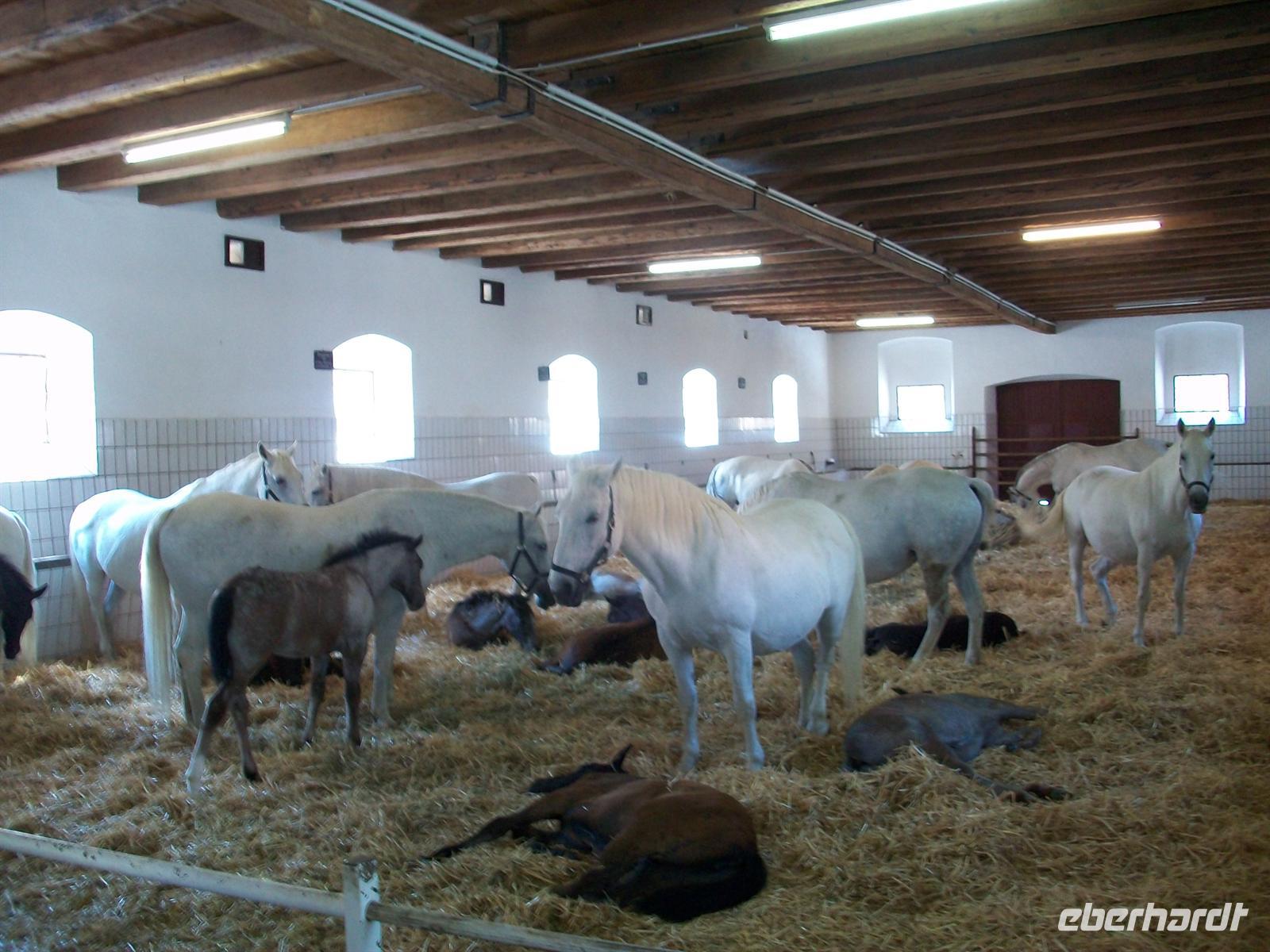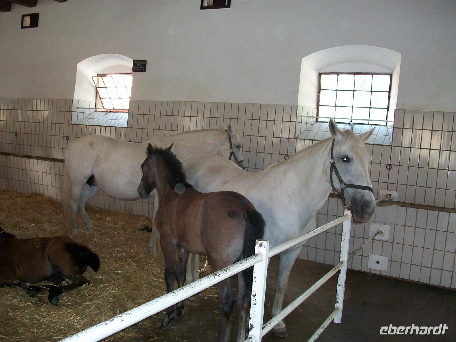 Dann gehen wir weiter und beobachten wie eine Pferdeherde über den Platz zur Koppel geführt wird. Einige Fohlen sind auch dabei, sie haben noch eine dunkle Farbe die dann später weiß