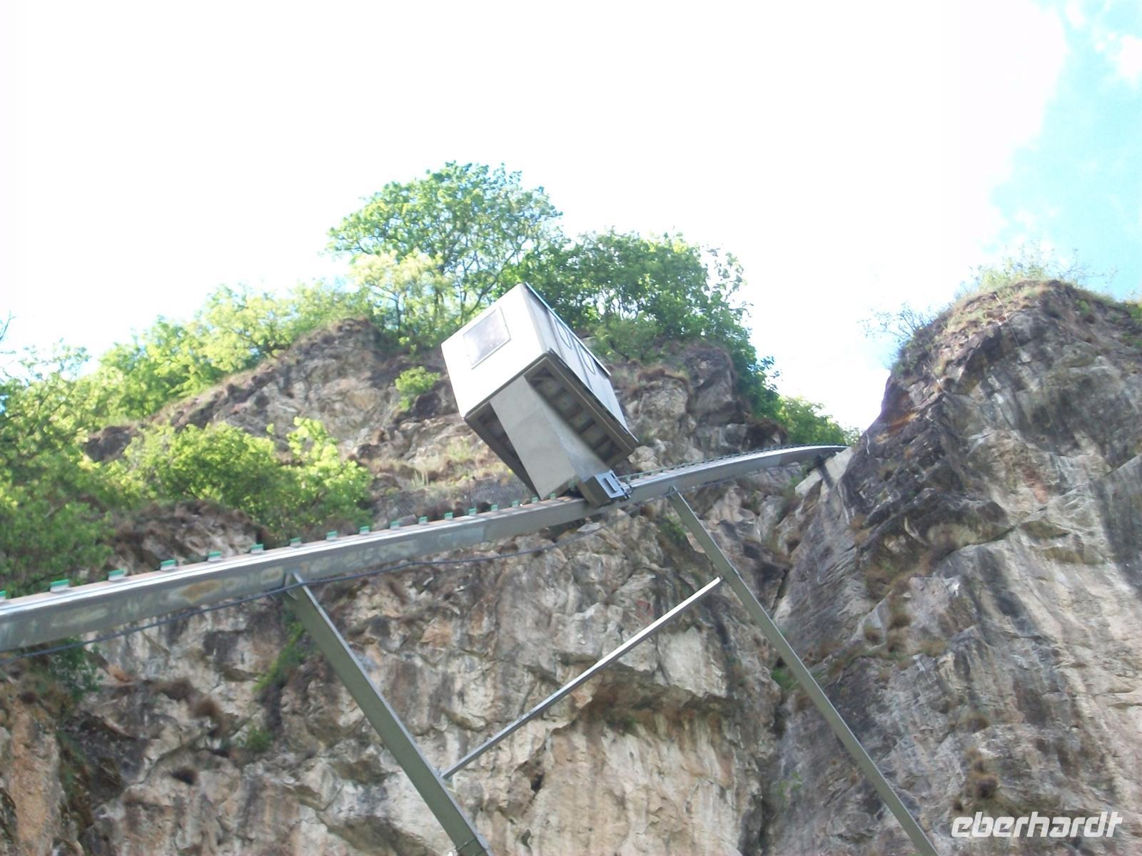 14.00 Uhr. Abenteuerlich ist auch die Auffahrt mit dem Schrägaufzug. Direkt an der Felsenkante angebracht, macht er einen etwas instabilen Eindruck, aber das ist nur eine Täuschung, sicher kommen wir oben an.