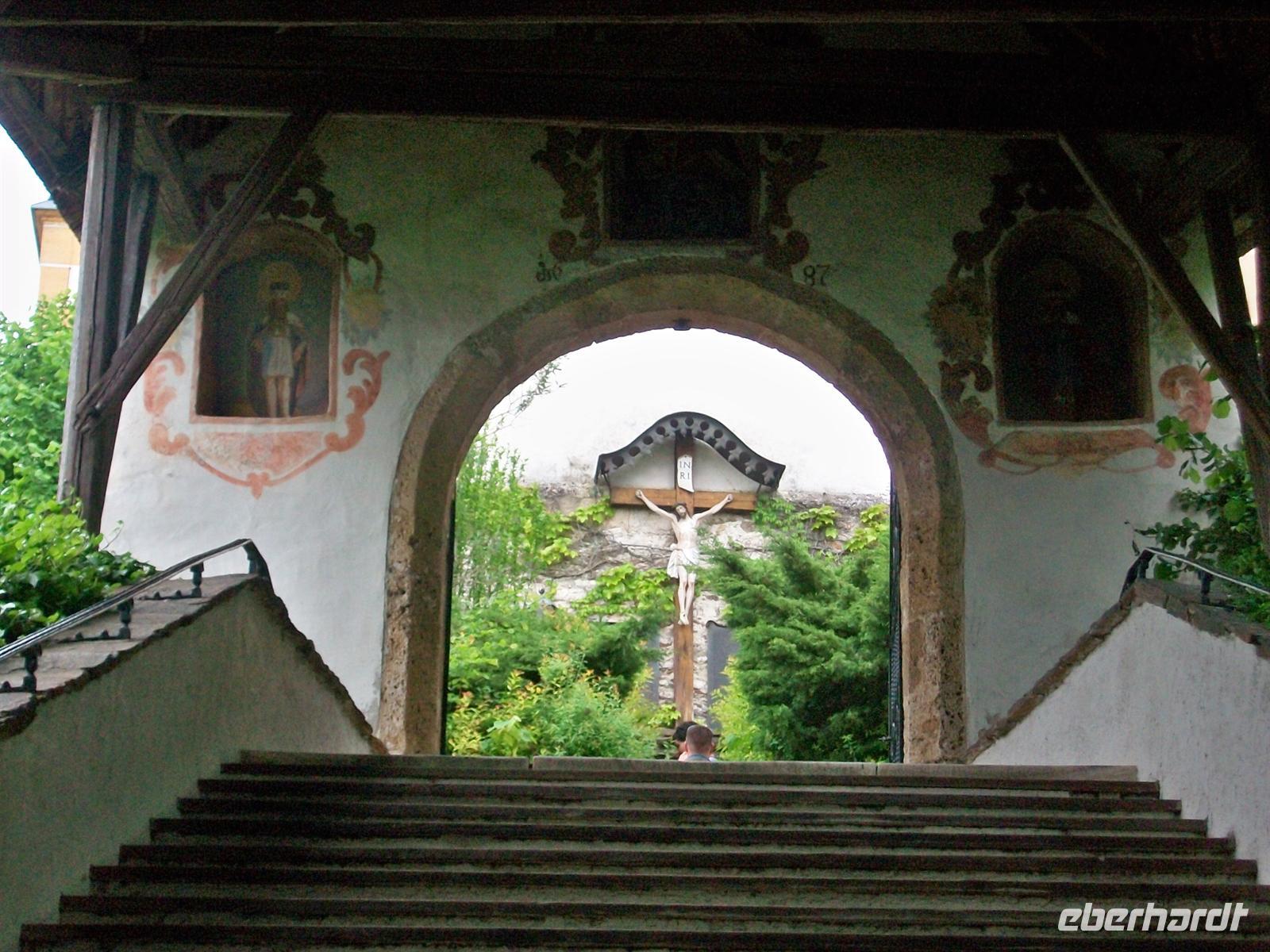 Am Parkplatz angekommen sind wir in gut fünf Minuten schon an den zwei Kirchen angelangt. Die Lage könnte malerischer nicht sein, über eine Treppe erreichen wir das Hauptportal der