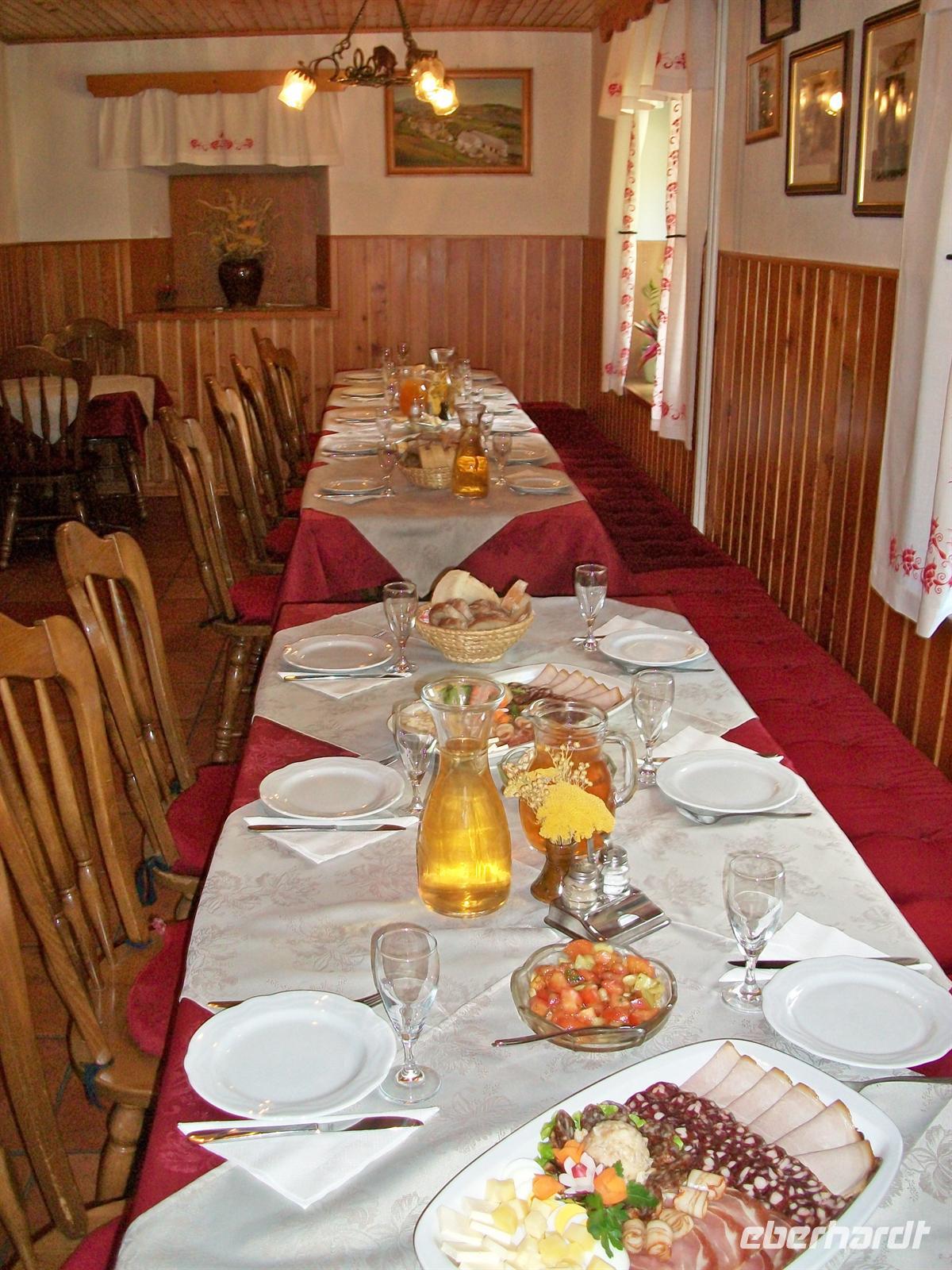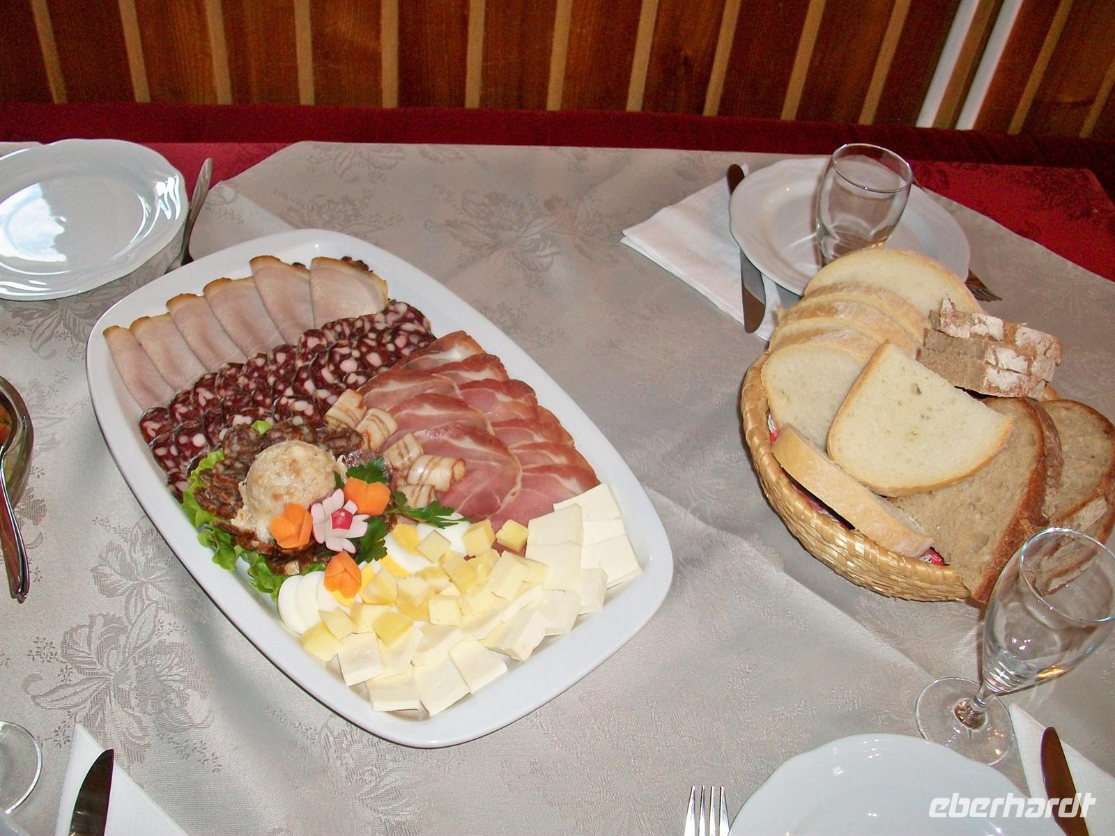 Auf den Tischen stehen Teller mit slowenischen Spezialitäten, lecker angerichtet so dass einem das Wasser im Munde zusammenläuft. Da gibt es Schinken, Käse und Salat aus der Region, dazu frisches selbstgebackenes Brot. Slowenien ist ein Weinland und so fehlt auch dieser gute Tropfen nicht der uns diese bäuerlichen Spezialitäten zum Genuss werden lässt.