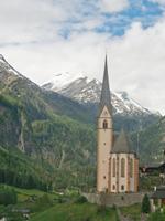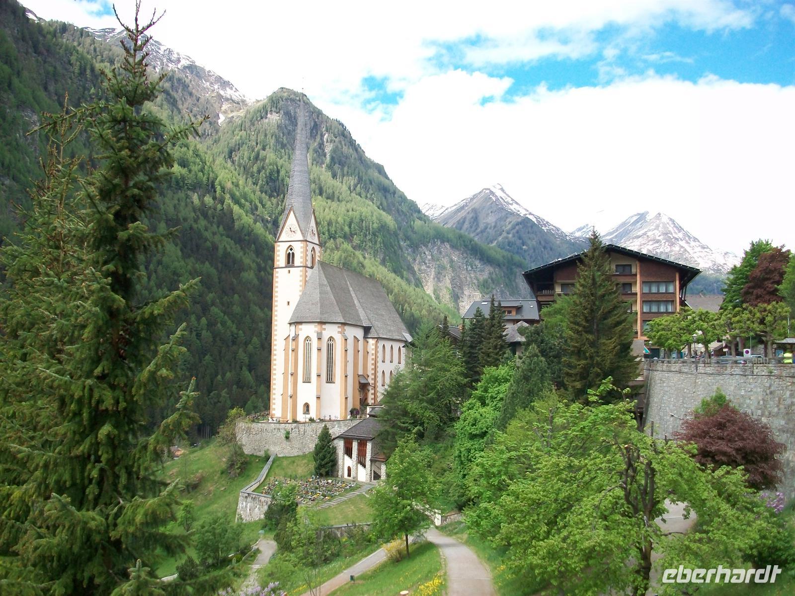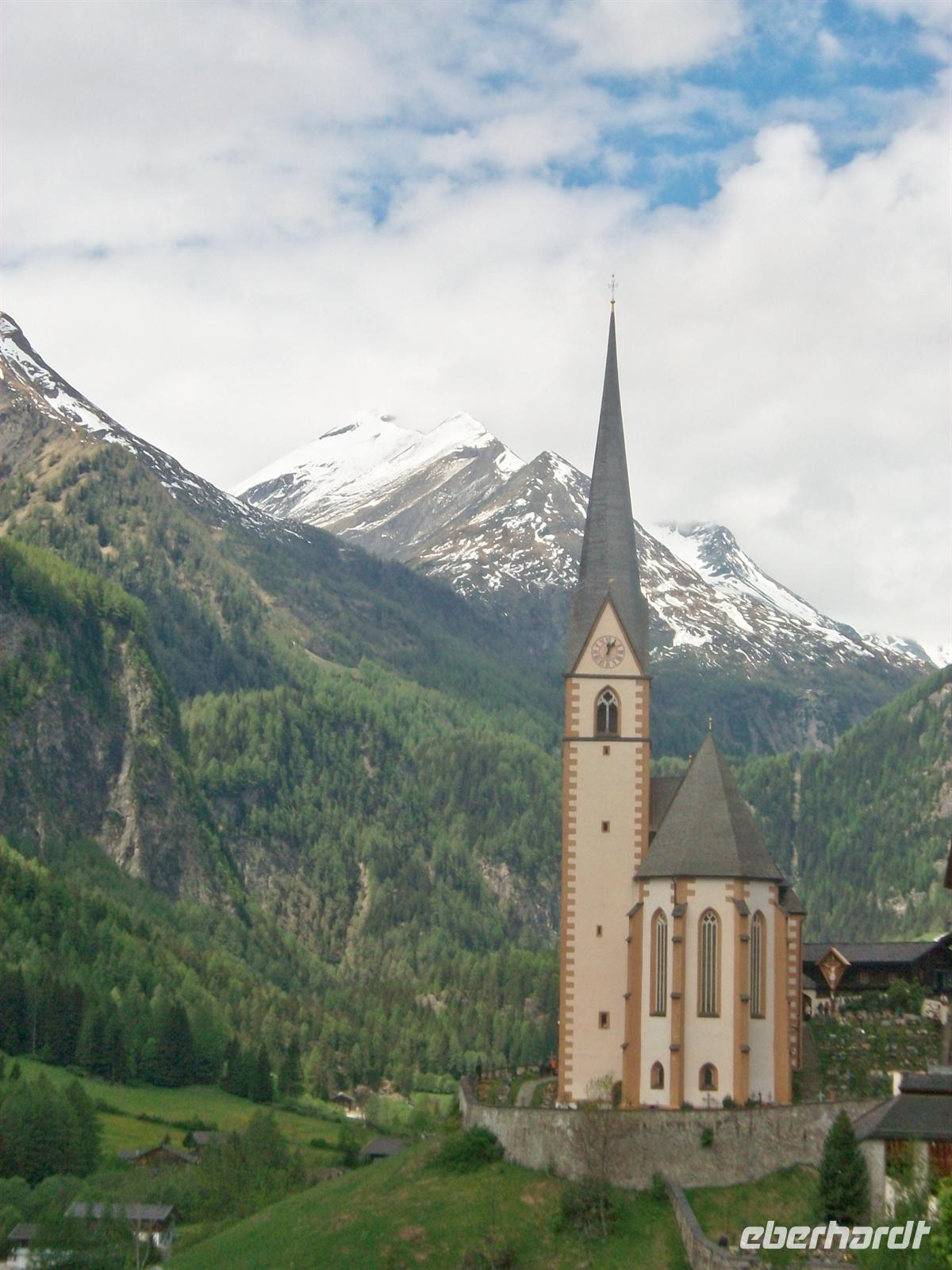zahlreiche Stauseen die der Elektroenergieerzeugung dienen. Links die Kreuzeckgruppe, beides wichtige Skigebiete zu denen einige Seilbahnen hinaufführen. Bei Winklern macht die Möll einen Knick nach rechts, wir folgen dem Straßenverlauf und fahren bergauf bis nach Heiligenblut. Auch dieser Ort hat eine sehr malerische Lage, etwas oberhalb eines Taleinschnitts ist er angelegt. Erster Blickfang ist die gotische Kirche mit dem spitzen Turm. Unmittelbar dahinter steigen die Berge steil zum Großglockner- Massiv bis auf fast 3 800 Meter an, ein gewaltiger Blick.