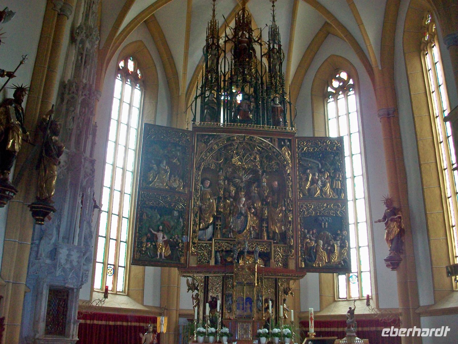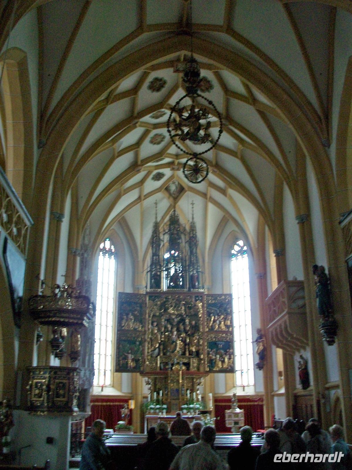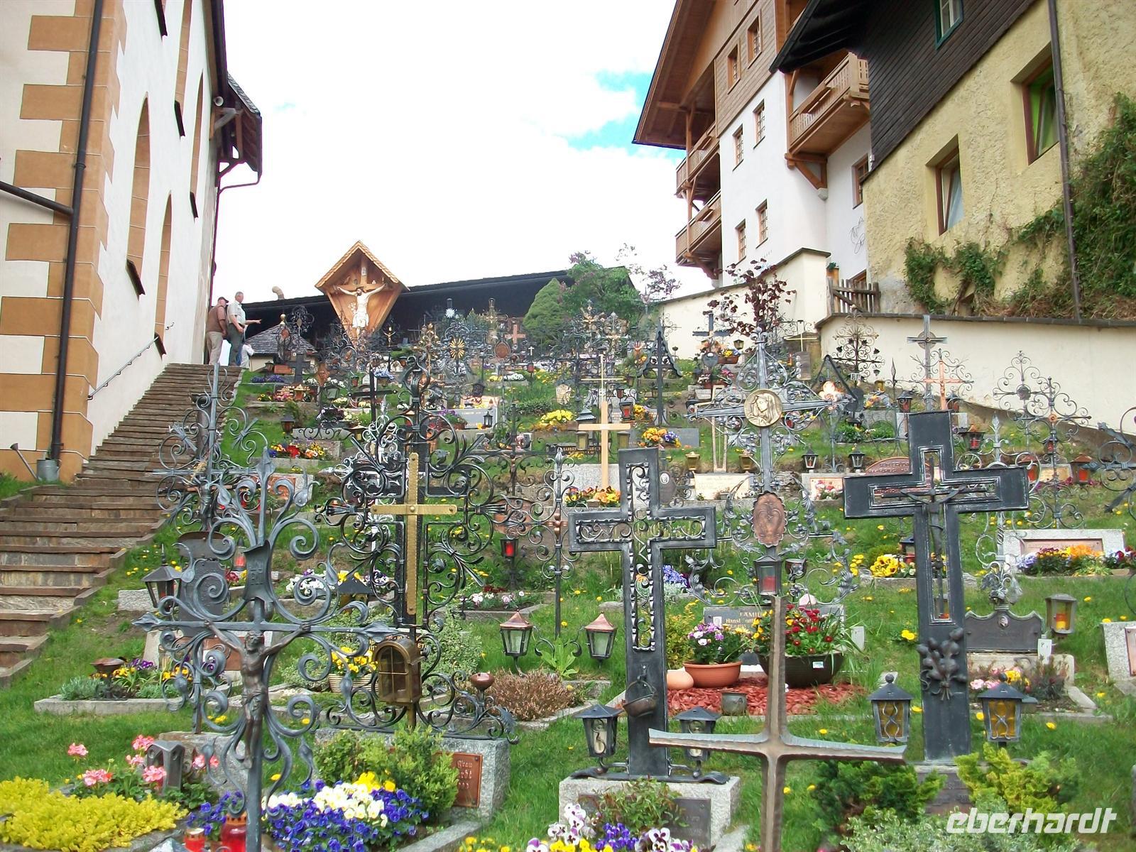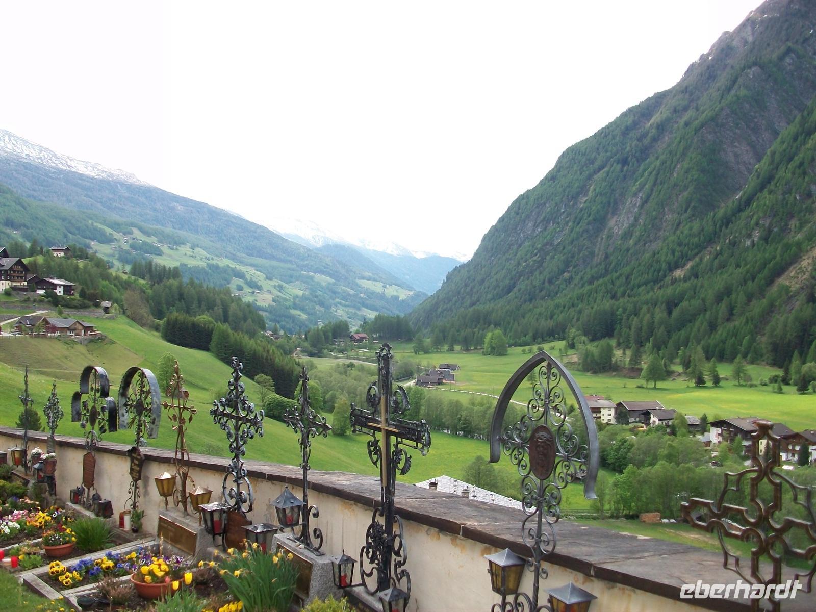 Die oberen Spitzen der Berge sind schneebedeckt und bilden zum Grün des Tales einen schönen Kontrast. Nur wenige Minuten und man gelangt vom Parkplatz zum Zentrum des Ortes. Der Besuch der Kirche lohnt sich, sie ist in ihrem Innern nicht so prunkvoll eingerichtet was auf den Betrachter einen angenehmen Eindruck macht. In der Krypta befindet sich auch das Grab des heiligen Briccius, der der Legende nach ein Fläschchen des heiligen Blutes in seiner Wade, die er zu diesem Zweck aufschnitt, verborgen hatte. Auch hier lohnt der Rundgang über den Bergfriedhof mit seinen zahlreichen gusseisernen Kreuzen, eine Abteilung ist den verunglückten Bergsteigern vorbehalten.