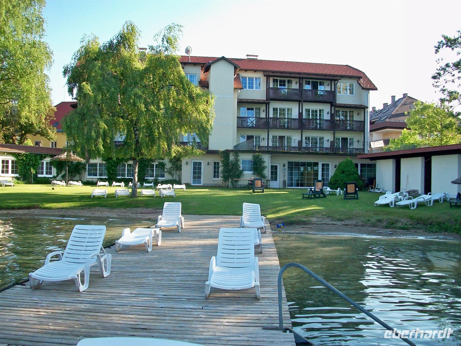 sehen, bald fahren wir an Villach vorbei. Hier wechseln wir auf die Wiener Autobahn über und fahren noch bis zur Abfahrt Velden. Die Landstraße führt uns nun auf die Süduferstraße des Wörthersees. Bald kommt auf der linken Seite die mächtige Wasserfläche des Sees in unser Blickfeld; wir folgen der Straße noch bis zur Halbinsel Maria Wörth und sehen die zwei berühmten Kirchen. Dann haben wir bald die Bucht von Reifnitz, in der sehr malerisch unser Hotel „Sille“ direkt am Ufer des Sees liegt, erreicht. Gegen 17.10 Uhr kommen wir an, die Formalitäten beim Check Inn sind schnell erledigt, bleibt noch etwas Zeit für einen kleinen Spaziergang vor dem Abendessen.