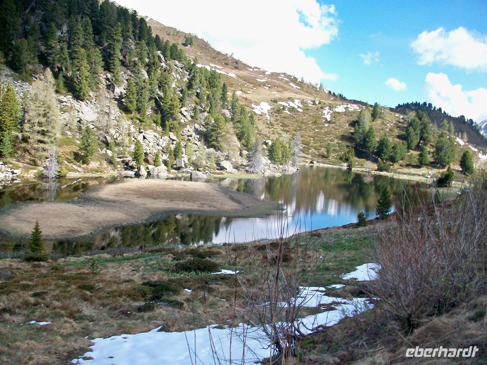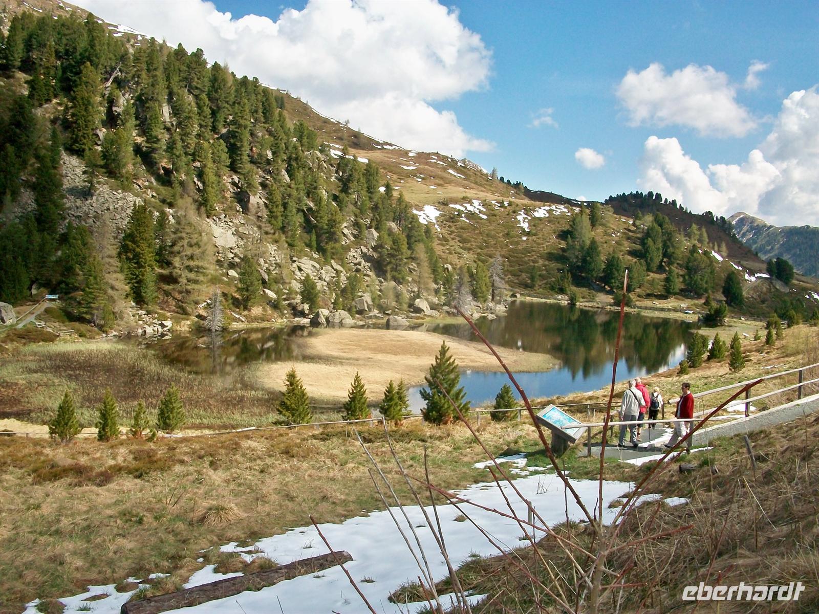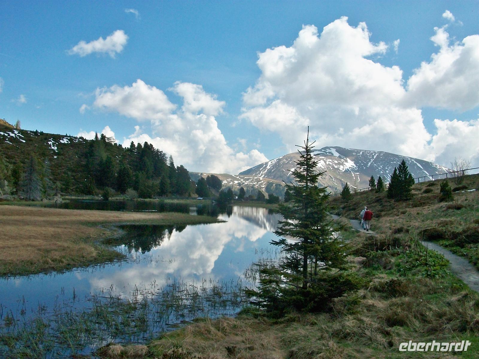 Bei der Ebene Reichenau verlassen wir die breite Landstraße und schwenken ein in die schmalere Zufahrtsstraße zur Nockalm. Bald erreichen wir das Mauthäuschen, denn die Nockalmstraße ist kostenpflichtig. Nun kann die Auffahrt beginnen, in Serpentinen führt die Straße bergan. Dabei wird von unserem Chauffeur höchste Konzentration verlangt, besonders in den Kehren. Wir können vom Bus aus die Veränderung der Vegetation beobachten. Langsam erreichen wir die Baumgrenze, die hohen Nadelbäume weichen zurück und machen den Krüppelkiefern Platz die schon sehr angepasst an diese Höhe sind. Dann verschwinden auch diese und es gibt hier oben nur noch die hochalpinen Pflanzen und grünlichbraunen Grasbewuchs. Unseren ersten Stopp machen wir am Windebensee auf 1 950 Metern. Dieser See ist nicht groß aber seine Lage ist sehr romantisch. Hier oben haben sich auch noch Schneefetzen erhalten, die Bäume und der blaue Himmel spiegeln sich im See. Es ist genügend Zeit diesen See zu umrunden, sehr lehrreich ist hier der Naturlehrpfad „Alpine Lebensgemeinschaften“ der uns die Flora näher bringt.