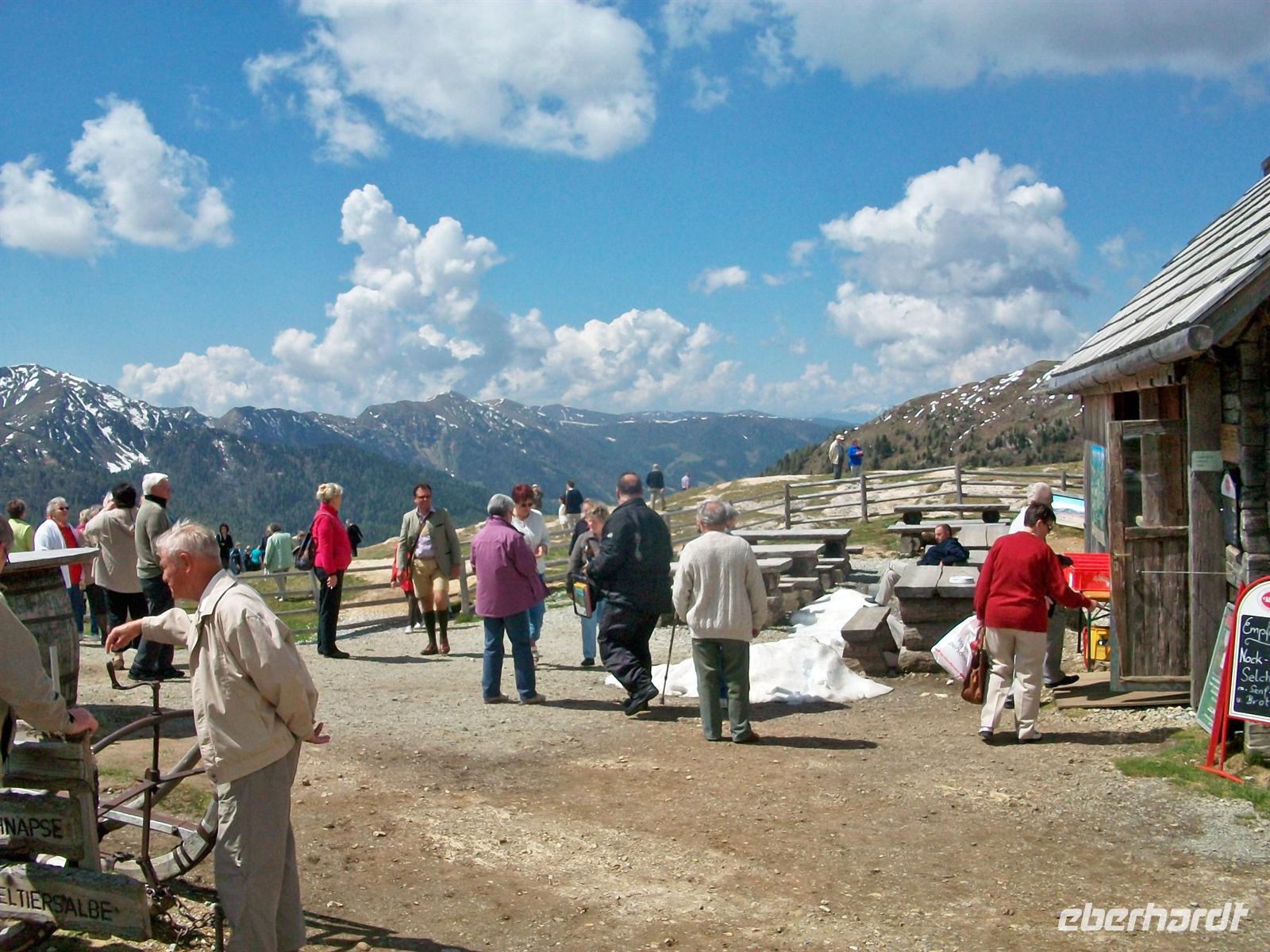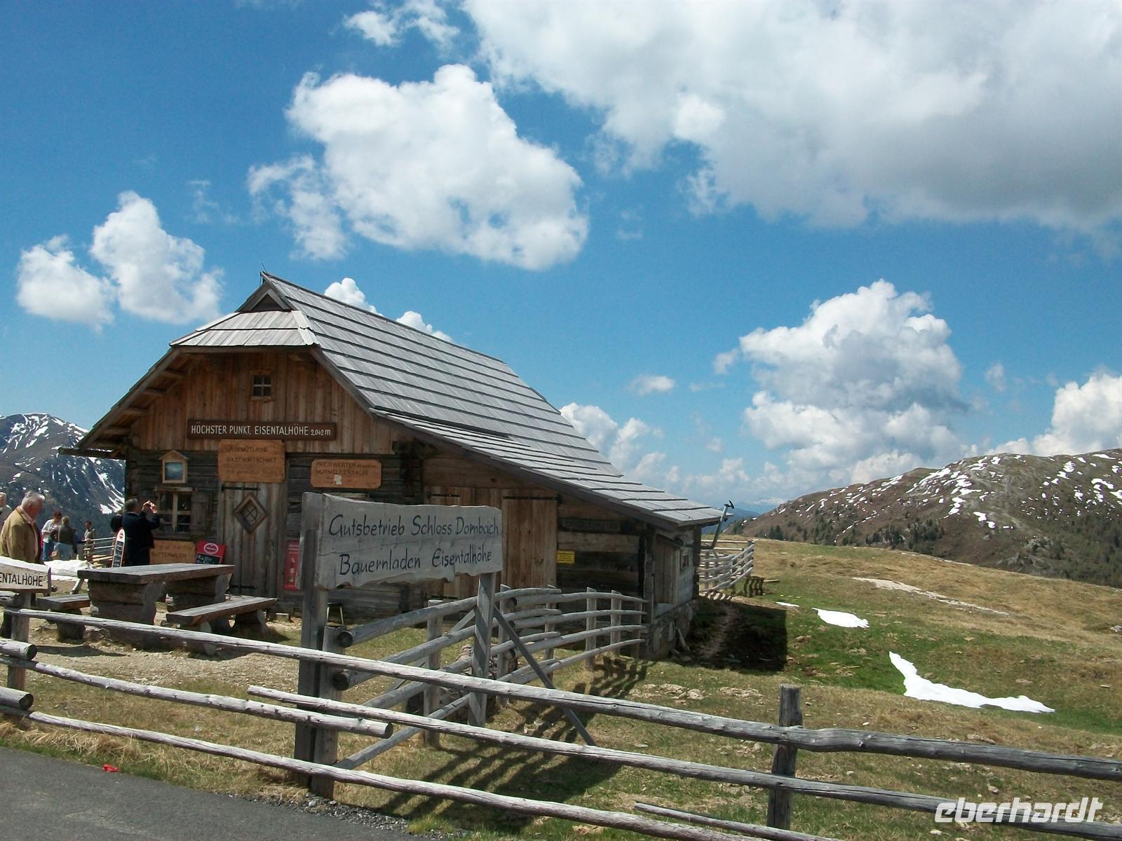 Dann setzen wir die Fahrt fort, fahren auf über 2 000 Metern an der Glockenhütte vorbei und danach senkt sich die Straße wieder ab. Auf 1 700 Metern, beim kleinen Kurort Karlbad, überwinden wir die Talsohle und nun geht es hinauf zum höchsten Punkt zur Eisentalhöhe auf 2 042 Meter über dem Meeresspiegel. Hier oben legen wir eine halbstündige Pause ein, es gibt von hier einen überwältigenden Blick über diese gigantische Bergwelt. Auch hier sind noch überall Schneereste zu sehen, es ist wiederholt ein schöner Tag, am tiefblauen Himmel ziehen die weißen Wolken ihre Bahn und unter dem Firmament breiten sich die Berge aus.