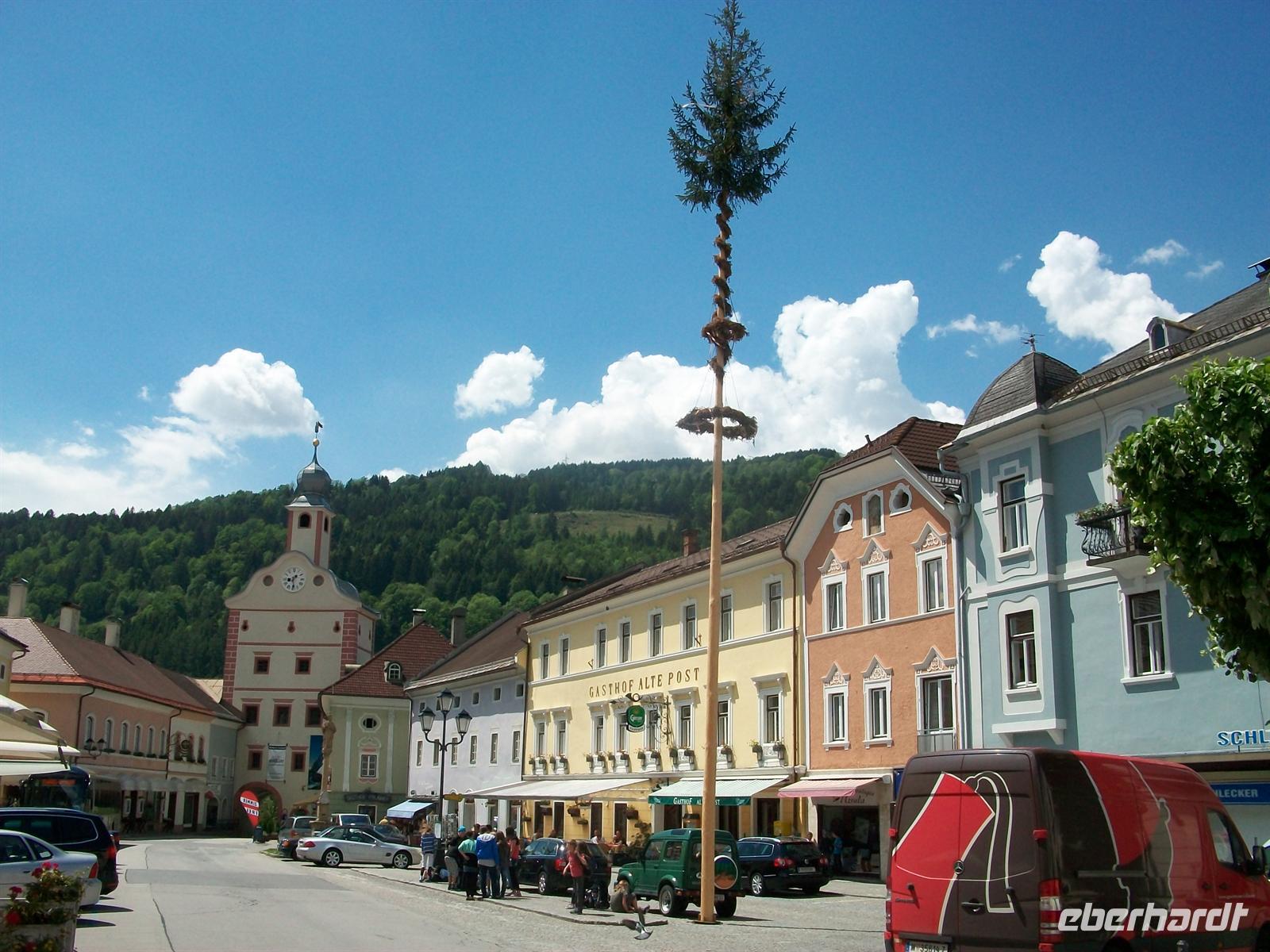 Hoch oben auf dem Berg ist ein Antennenmast zu sehen, dort befindet sich die Spitze des Hausberges von Spital, das Goldeck. Bald sind wir auf der Hauptstraße des Ortes angelangt und