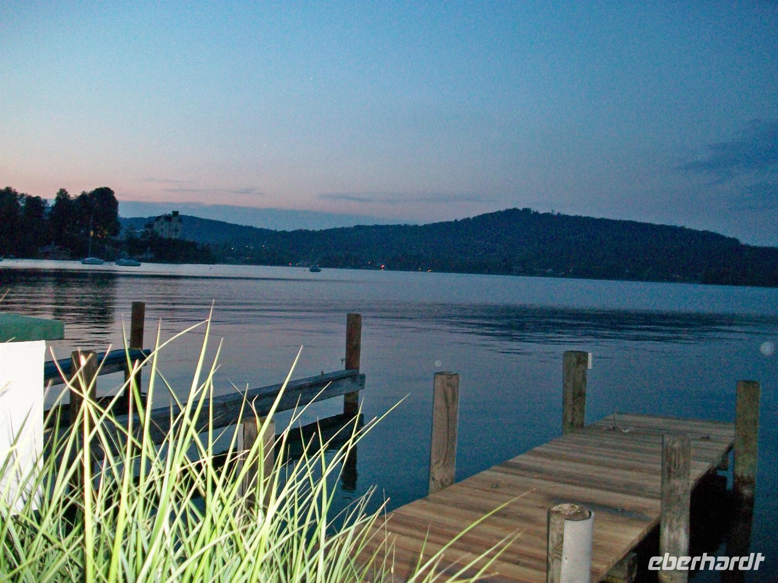 9.00 Uhr. Wir sind gestartet und werden heute in einzelnen Etappen den See komplett umrunden. Der Wörthersee ist etwa 17 Kilometer lang und hat seine größte Breite bei 1,6 Kilometern. Hier von der Süduferstraße kann man das gegenüberliegende Ufer sehen, oberhalb davon verläuft die Autobahn nach Wien.
