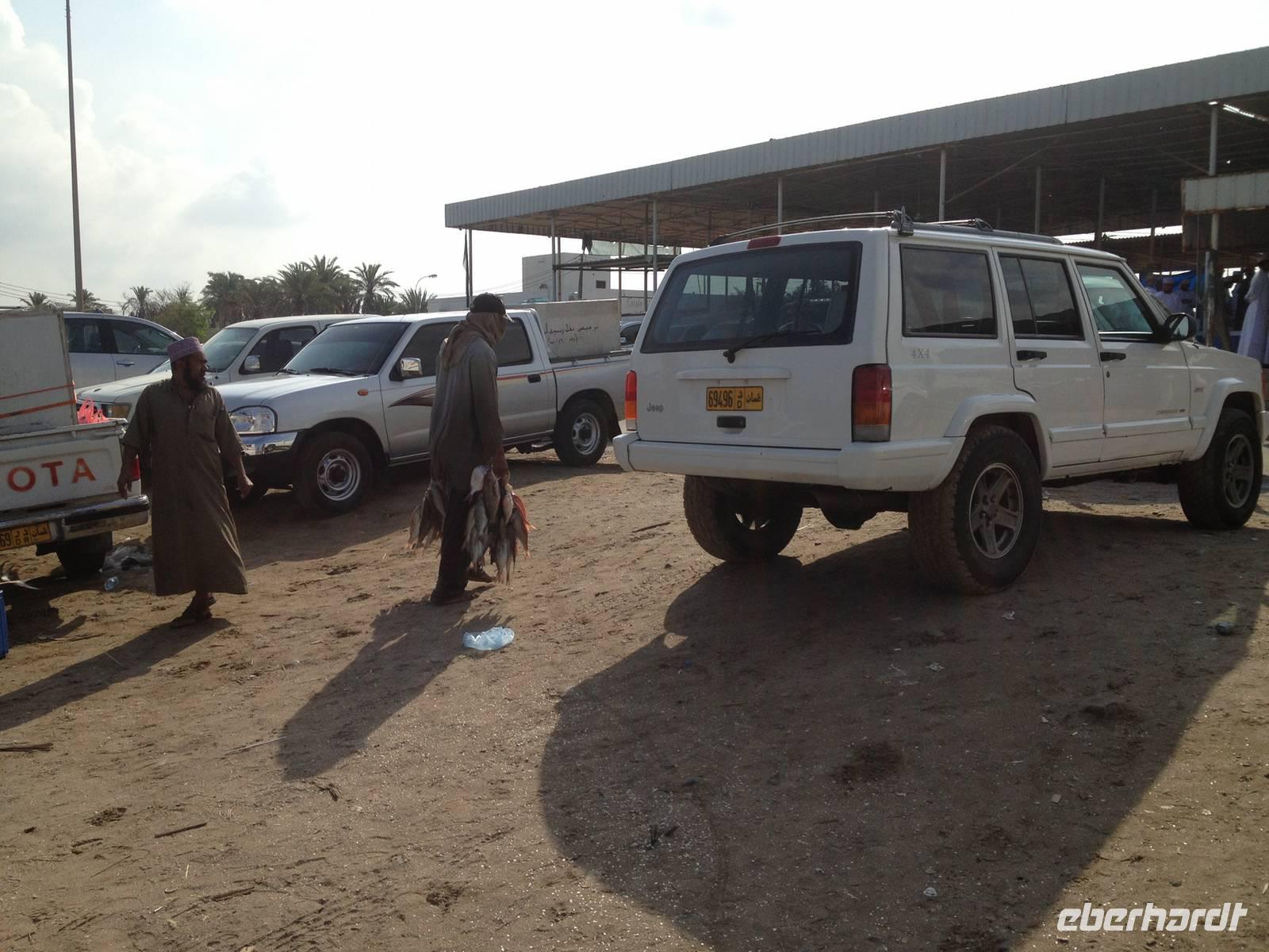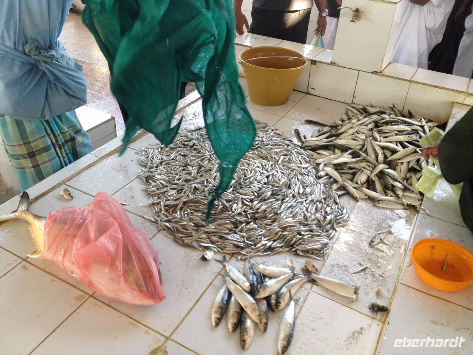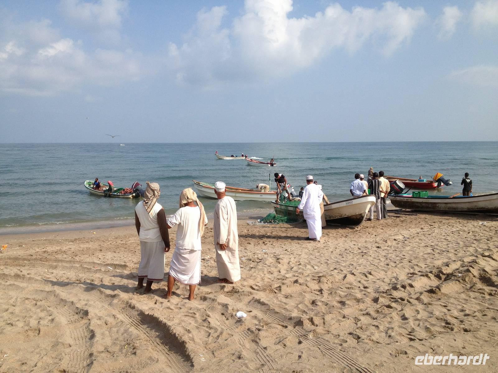 Zunächst bestaunten wir die „Fänge des Tages" auf dem Fischmarkt in Barkha. Der urtümliche Markt direkt am Meer ermöglichte uns interessante Einblicke in das tägliche Leben der Omanis. Der fangfrische Fisch wurde von den kleinen Fischerbooten direkt zum Verkauf angeboten. Hier kauften die Einheimischen den Fisch der besten Qualität.