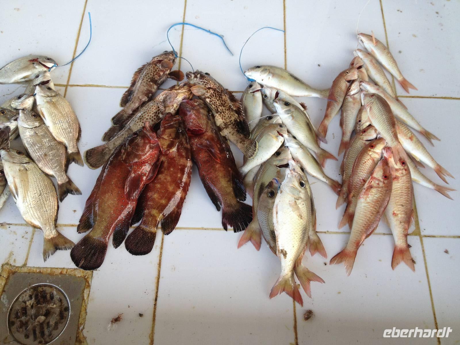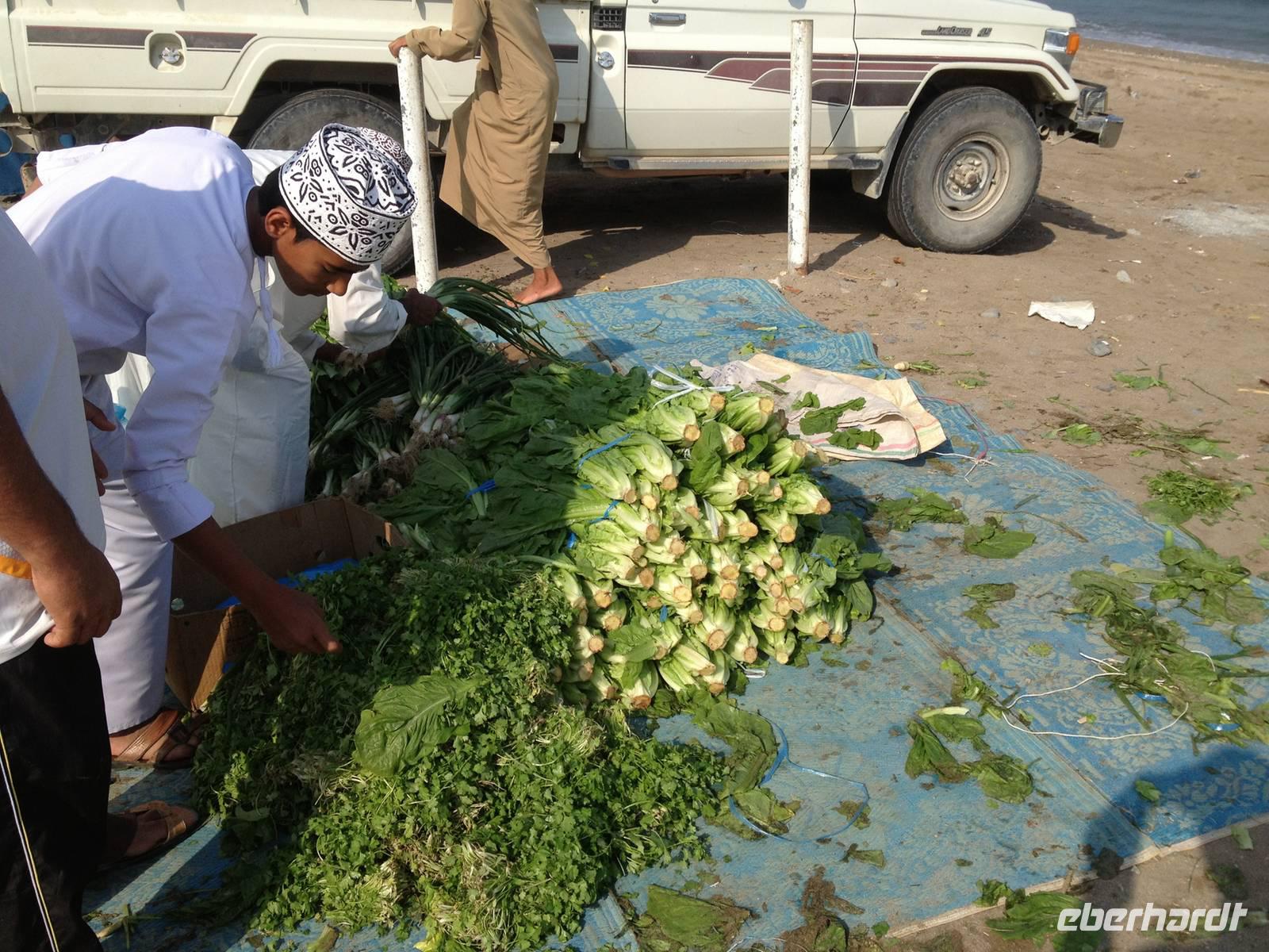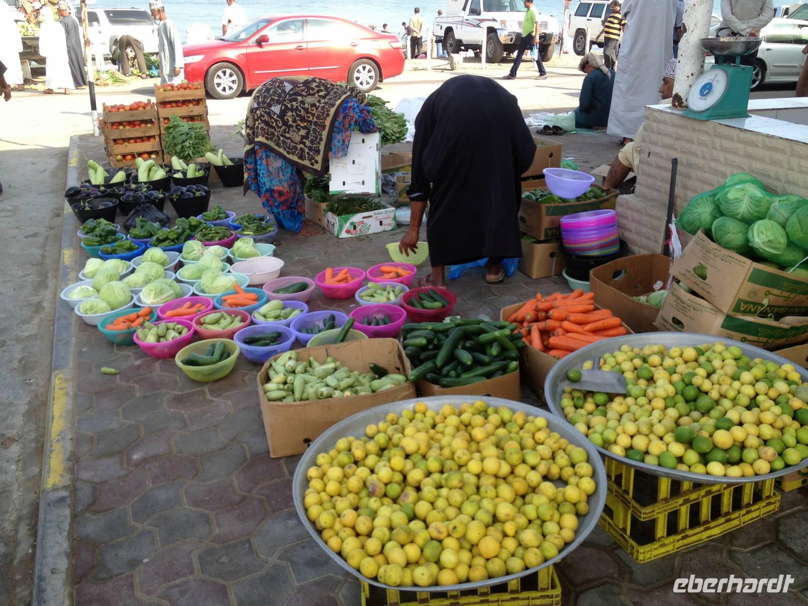 Zunächst bestaunten wir die „Fänge des Tages" auf dem Fischmarkt in Barkha. Der urtümliche Markt direkt am Meer ermöglichte uns interessante Einblicke in das tägliche Leben der Omanis. Der fangfrische Fisch wurde von den kleinen Fischerbooten direkt zum Verkauf angeboten. Hier kauften die Einheimischen den Fisch der besten Qualität.