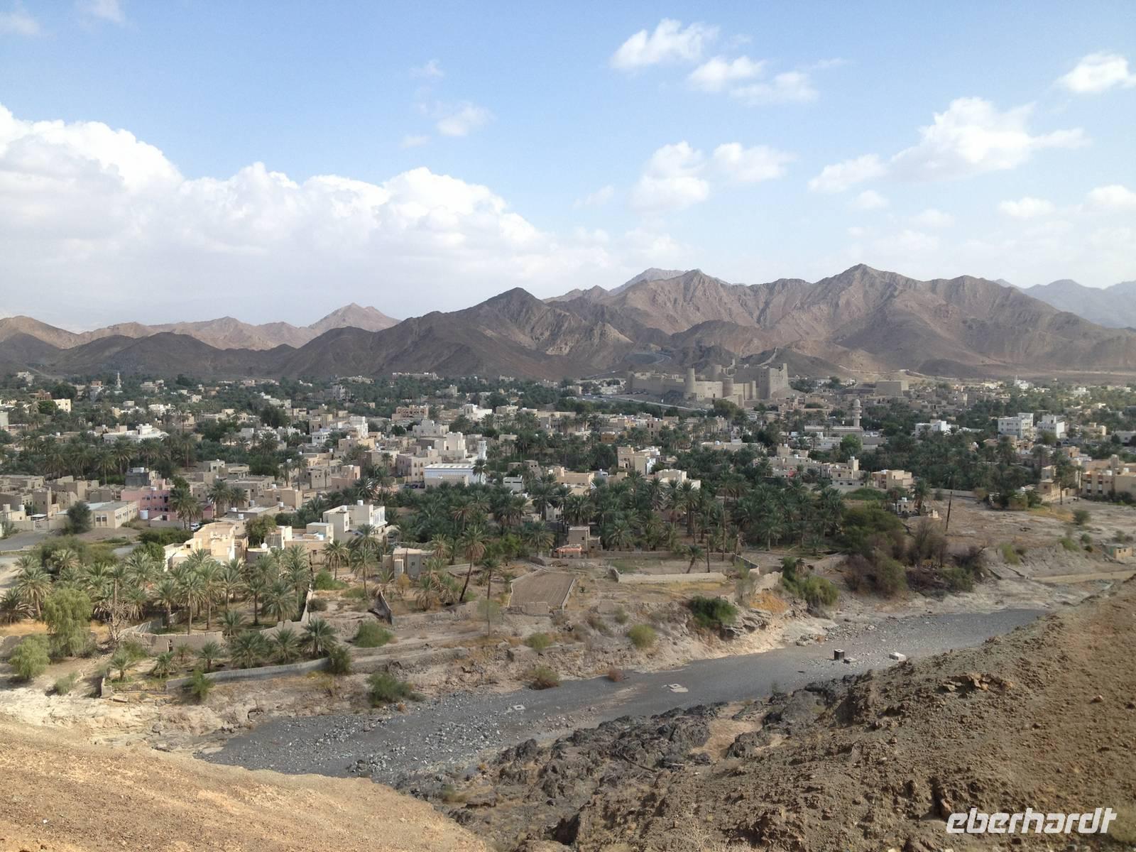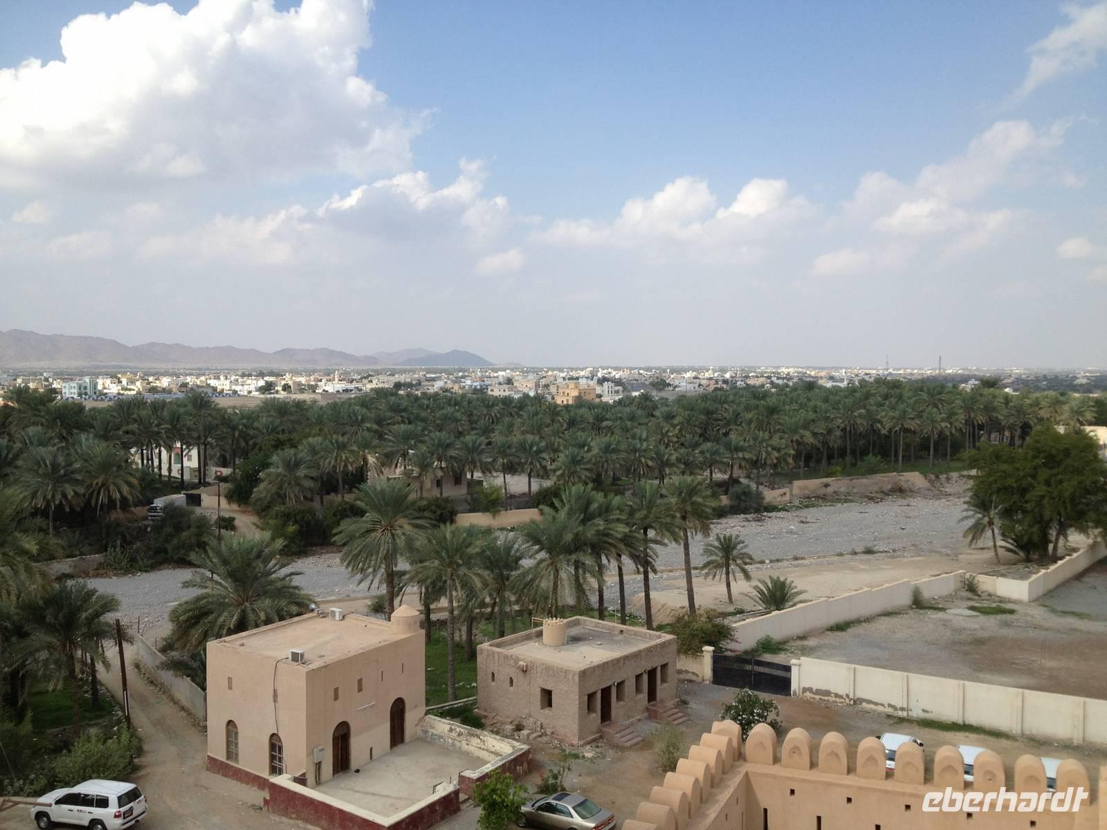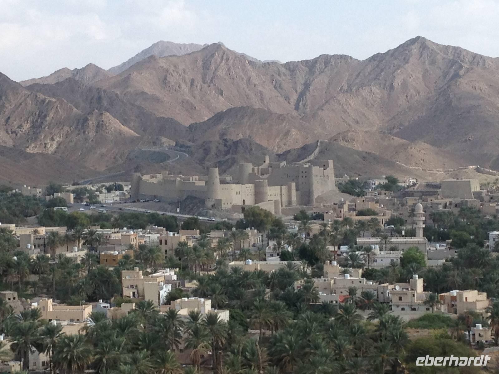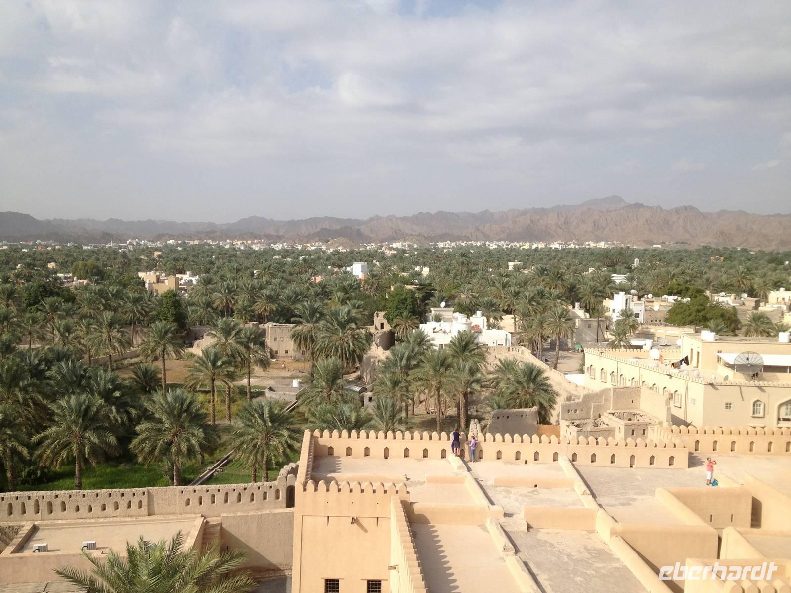 Die im 17. Jahrhundert auf einem Felsvorsprung erbaute Festung ist auf einer Seite von den Felswänden des westlichen Hajars umgeben und ragt auf der anderen Seite über die Batinah-Ebene. Plantage reiht sich an Plantage, Ortschaft an Ortschaft. Hier lebt ein Viertel der Bevölkerung Omans. Datteln, Bananen, Limonen, Mangos, Tomaten, Karotten, Auberginen, Zucchini, Kartoffeln - all dies und auch vieles anderes Gemüse wird hier angebaut.