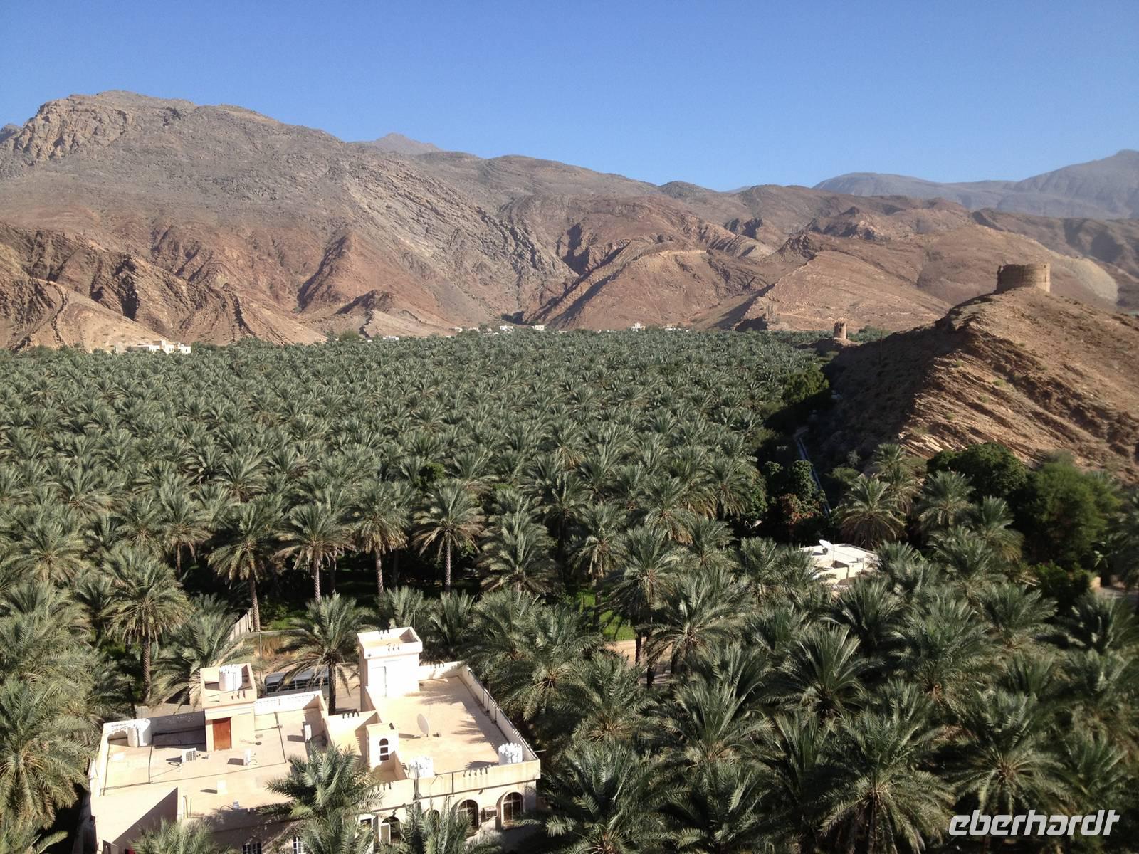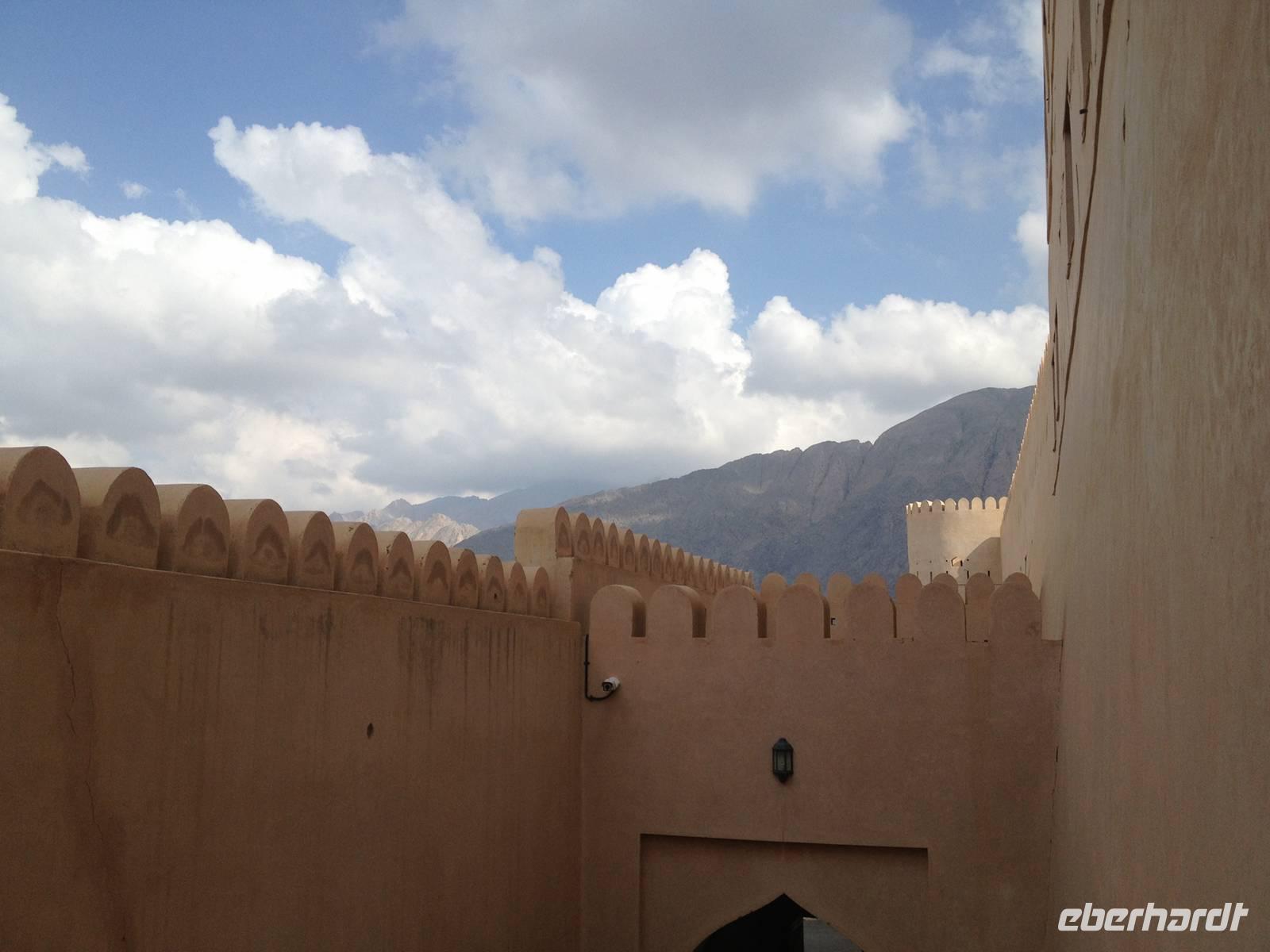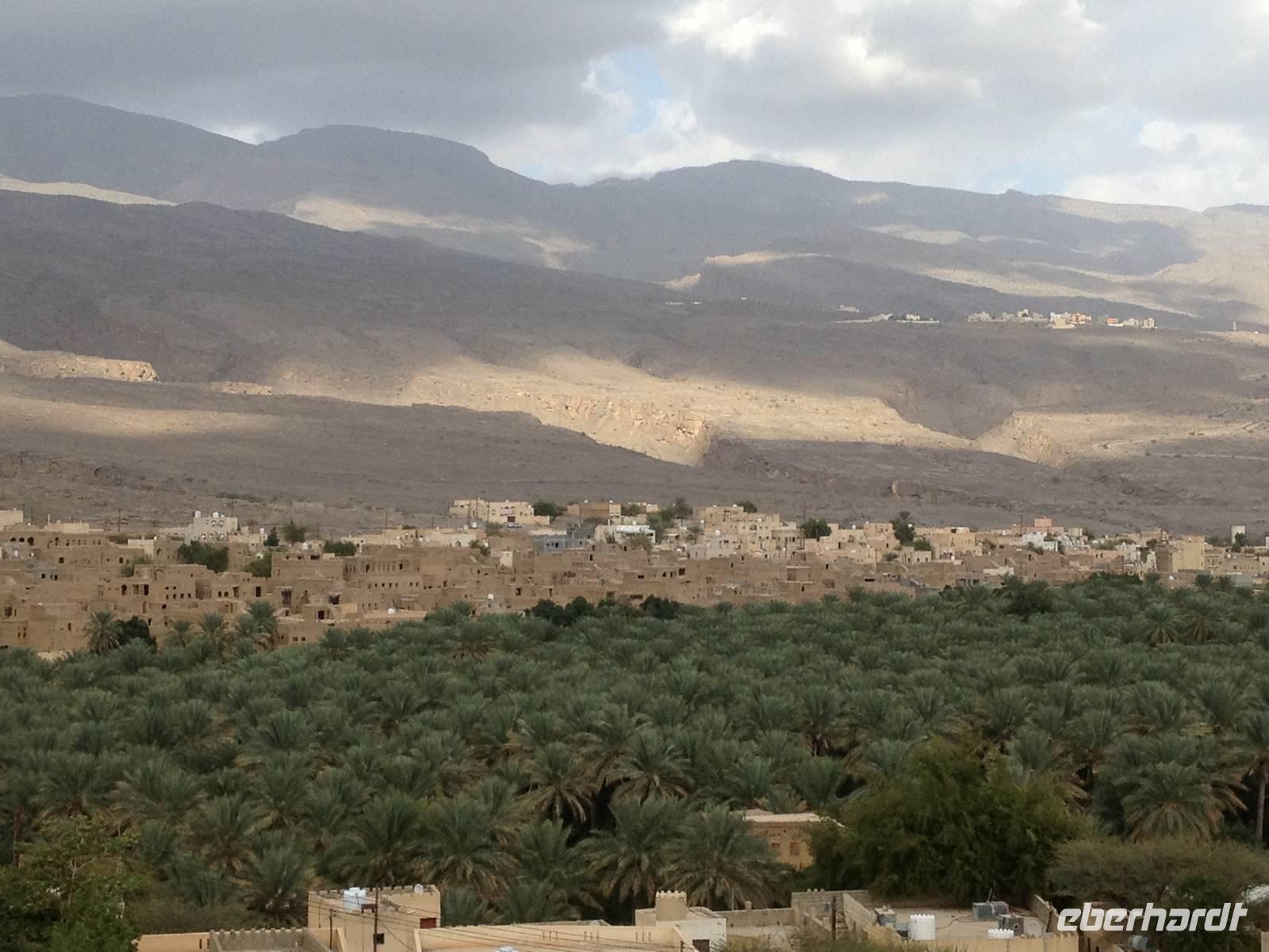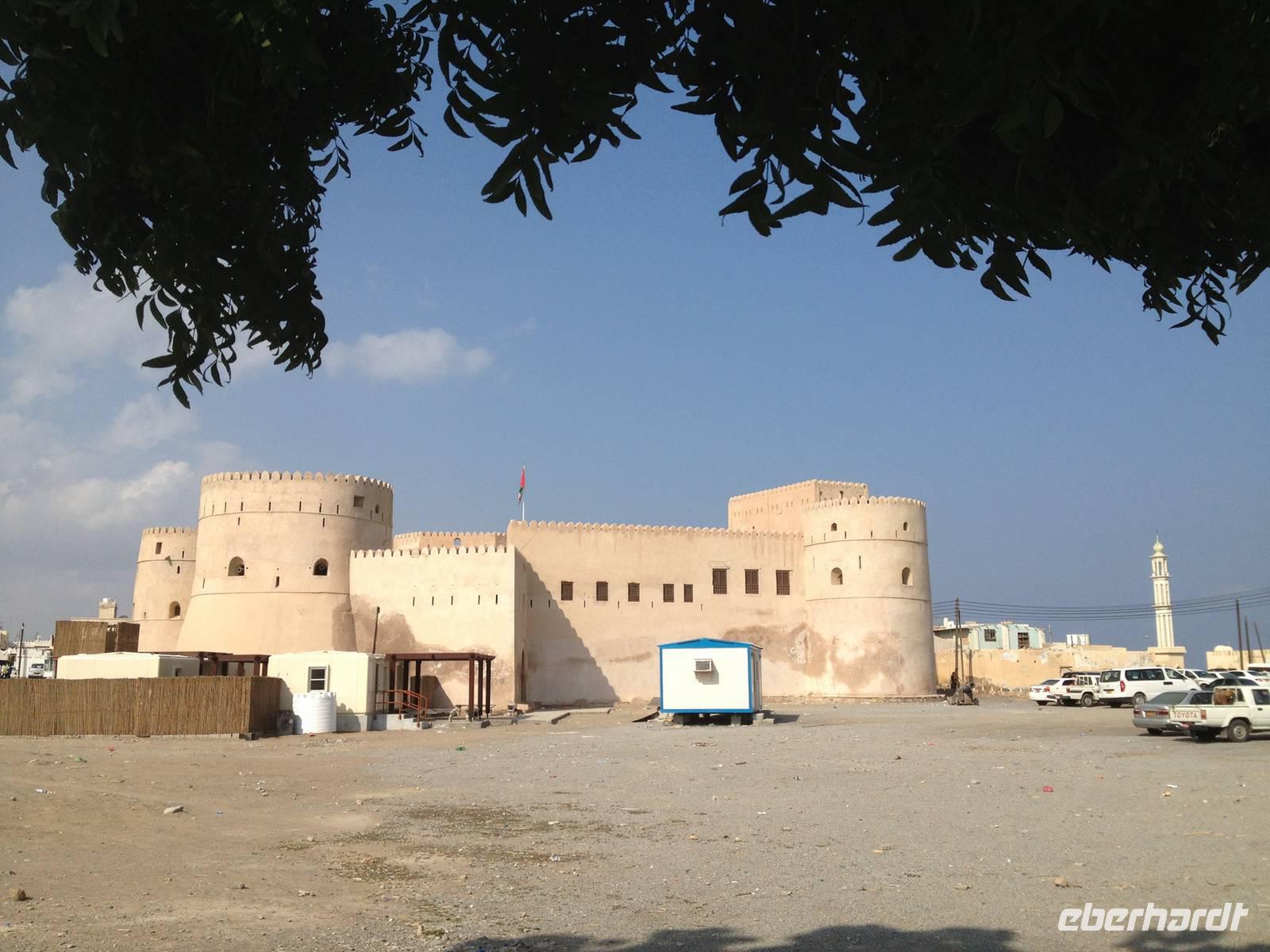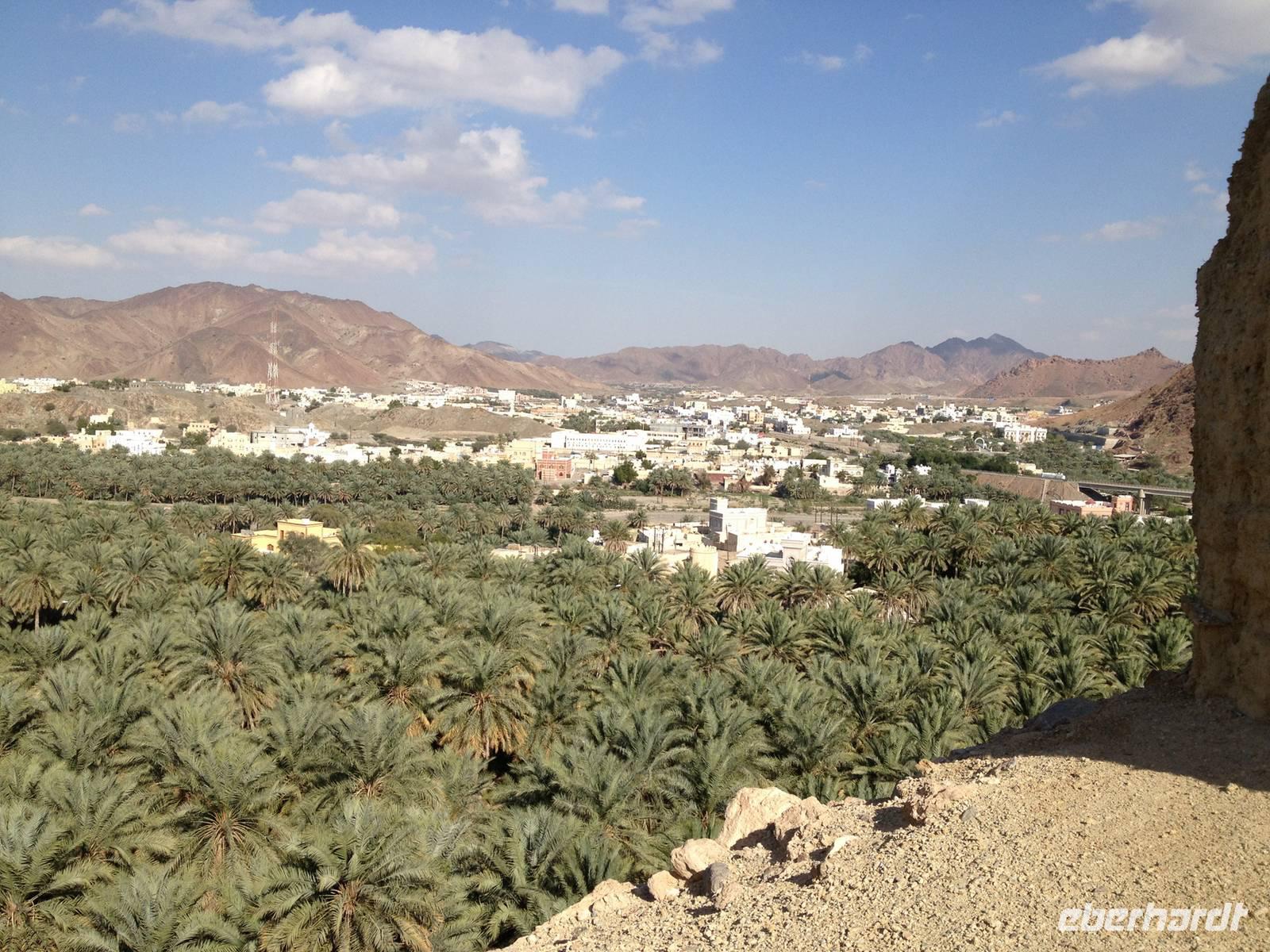 Die im 17. Jahrhundert auf einem Felsvorsprung erbaute Festung ist auf einer Seite von den Felswänden des westlichen Hajars umgeben und ragt auf der anderen Seite über die Batinah-Ebene. Plantage reiht sich an Plantage, Ortschaft an Ortschaft. Hier lebt ein Viertel der Bevölkerung Omans. Datteln, Bananen, Limonen, Mangos, Tomaten, Karotten, Auberginen, Zucchini, Kartoffeln - all dies und auch vieles anderes Gemüse wird hier angebaut.