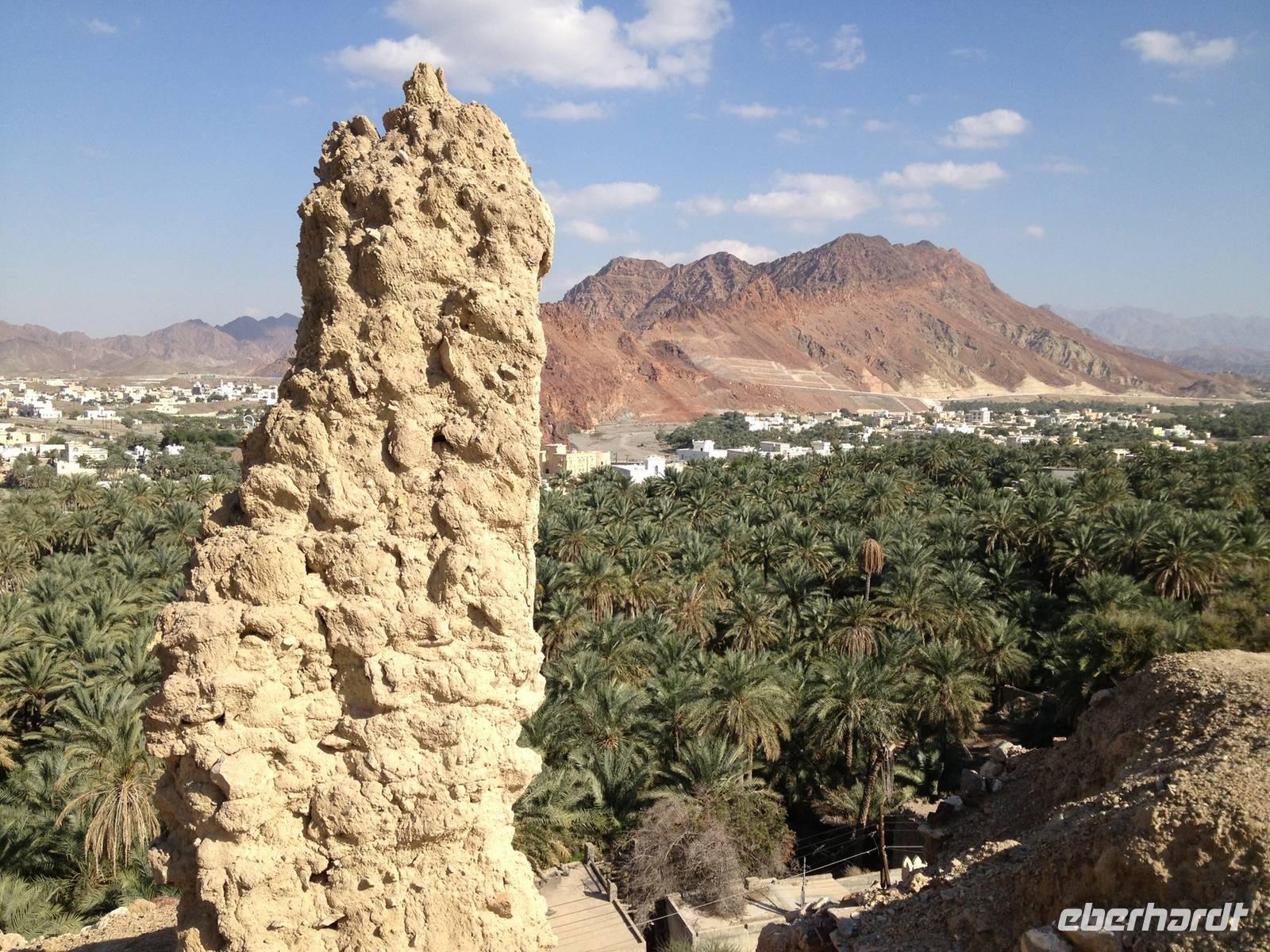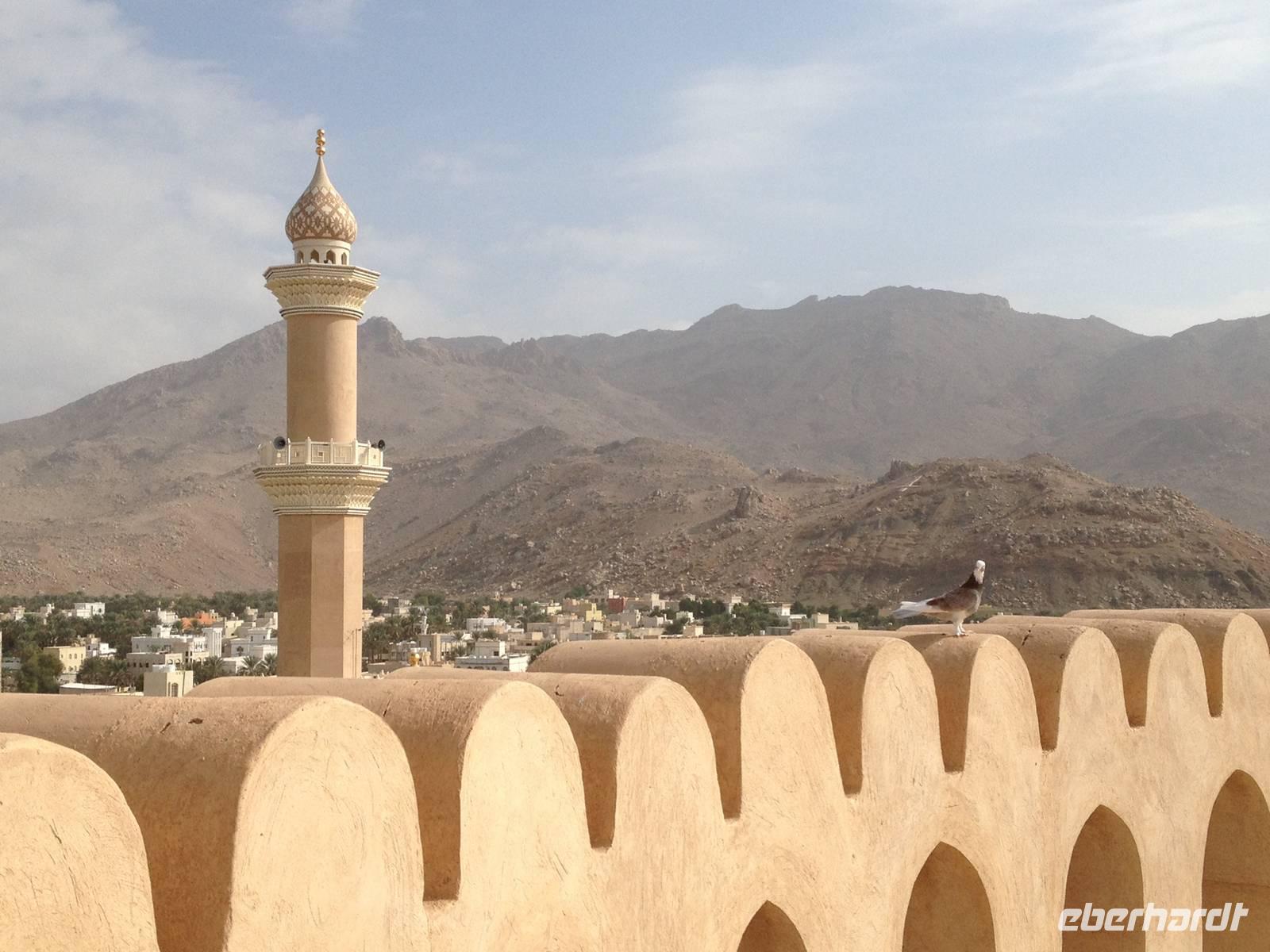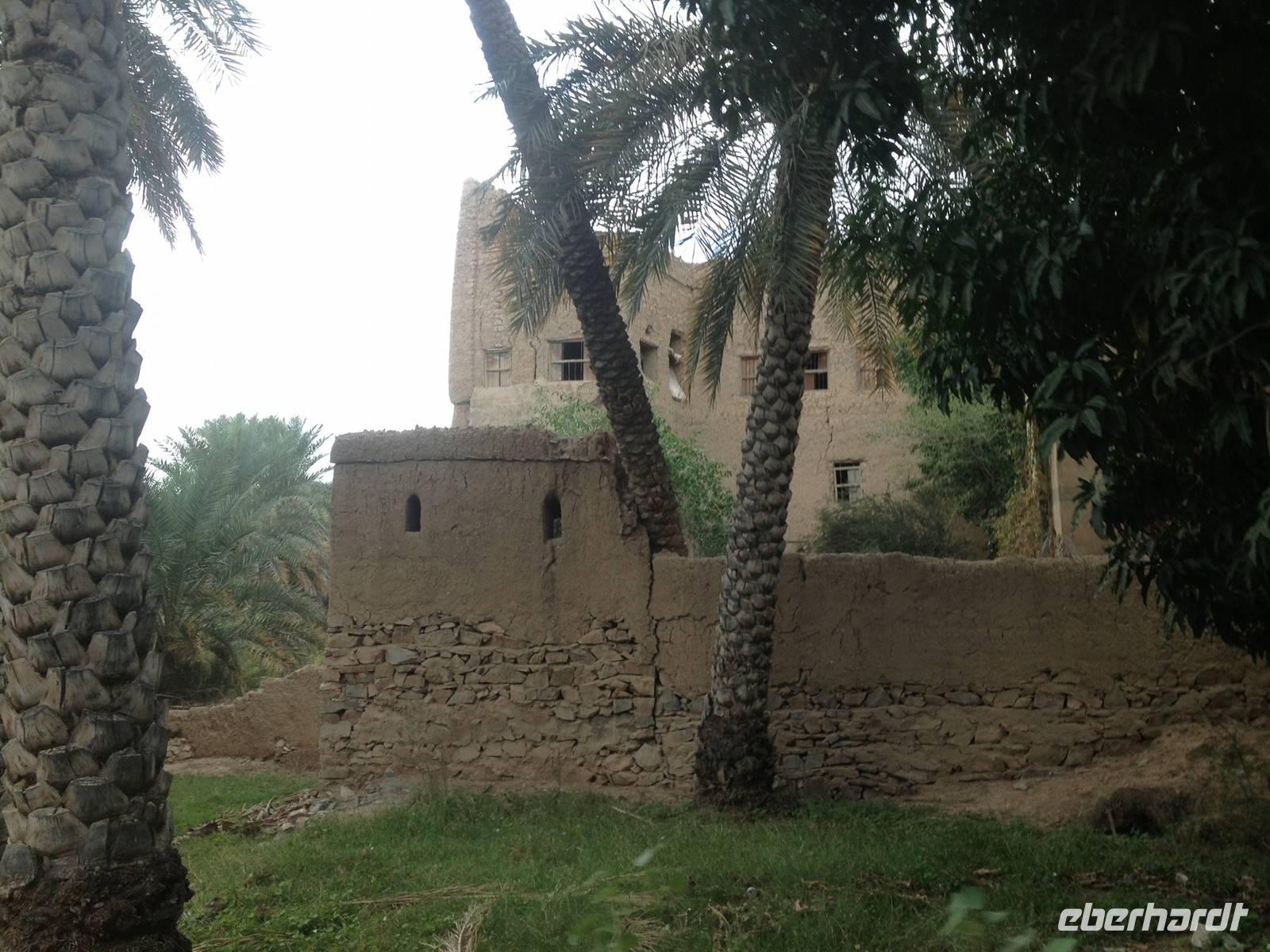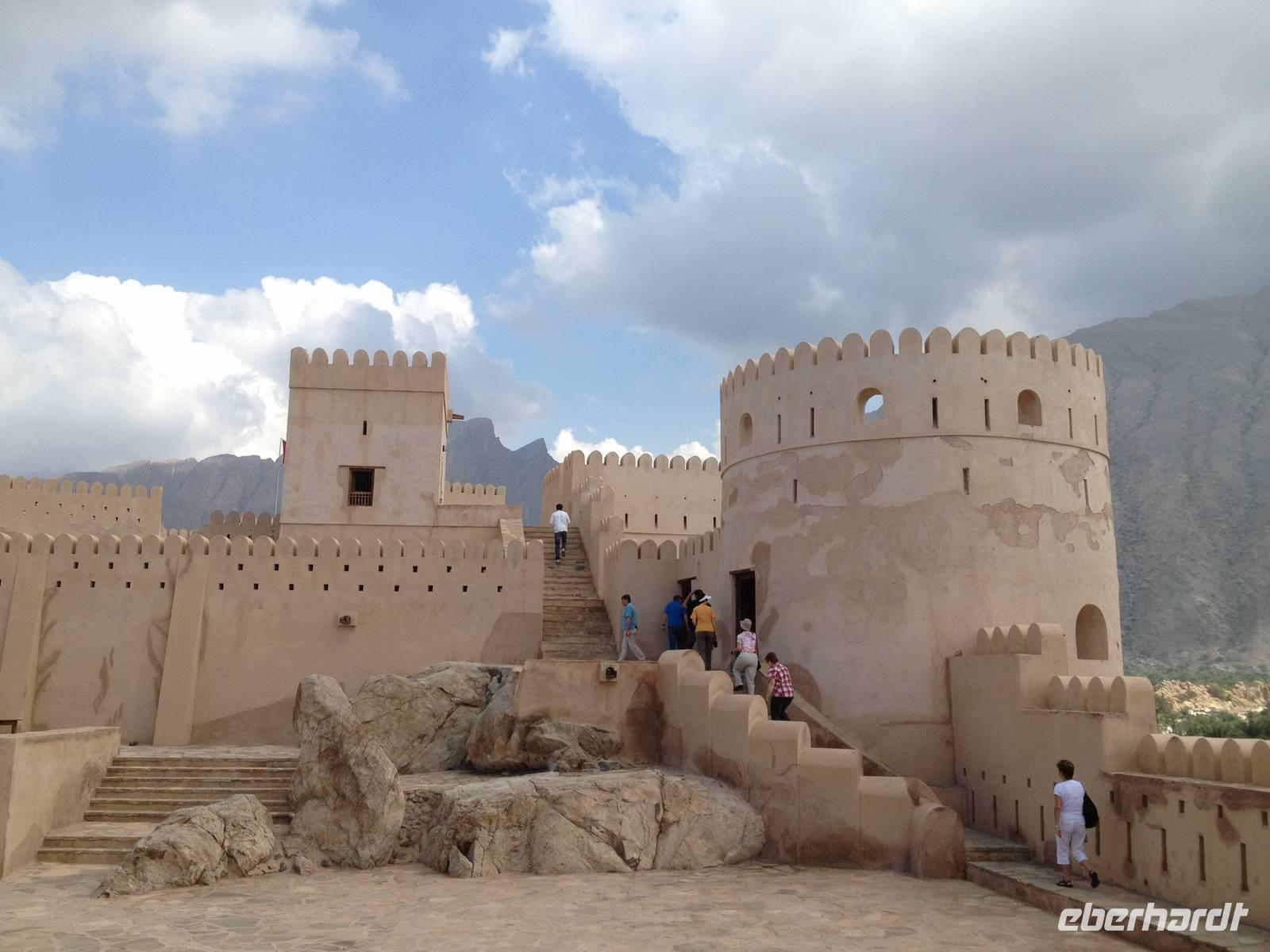 Die im 17. Jahrhundert auf einem Felsvorsprung erbaute Festung ist auf einer Seite von den Felswänden des westlichen Hajars umgeben und ragt auf der anderen Seite über die Batinah-Ebene. Plantage reiht sich an Plantage, Ortschaft an Ortschaft. Hier lebt ein Viertel der Bevölkerung Omans. Datteln, Bananen, Limonen, Mangos, Tomaten, Karotten, Auberginen, Zucchini, Kartoffeln - all dies und auch vieles anderes Gemüse wird hier angebaut.