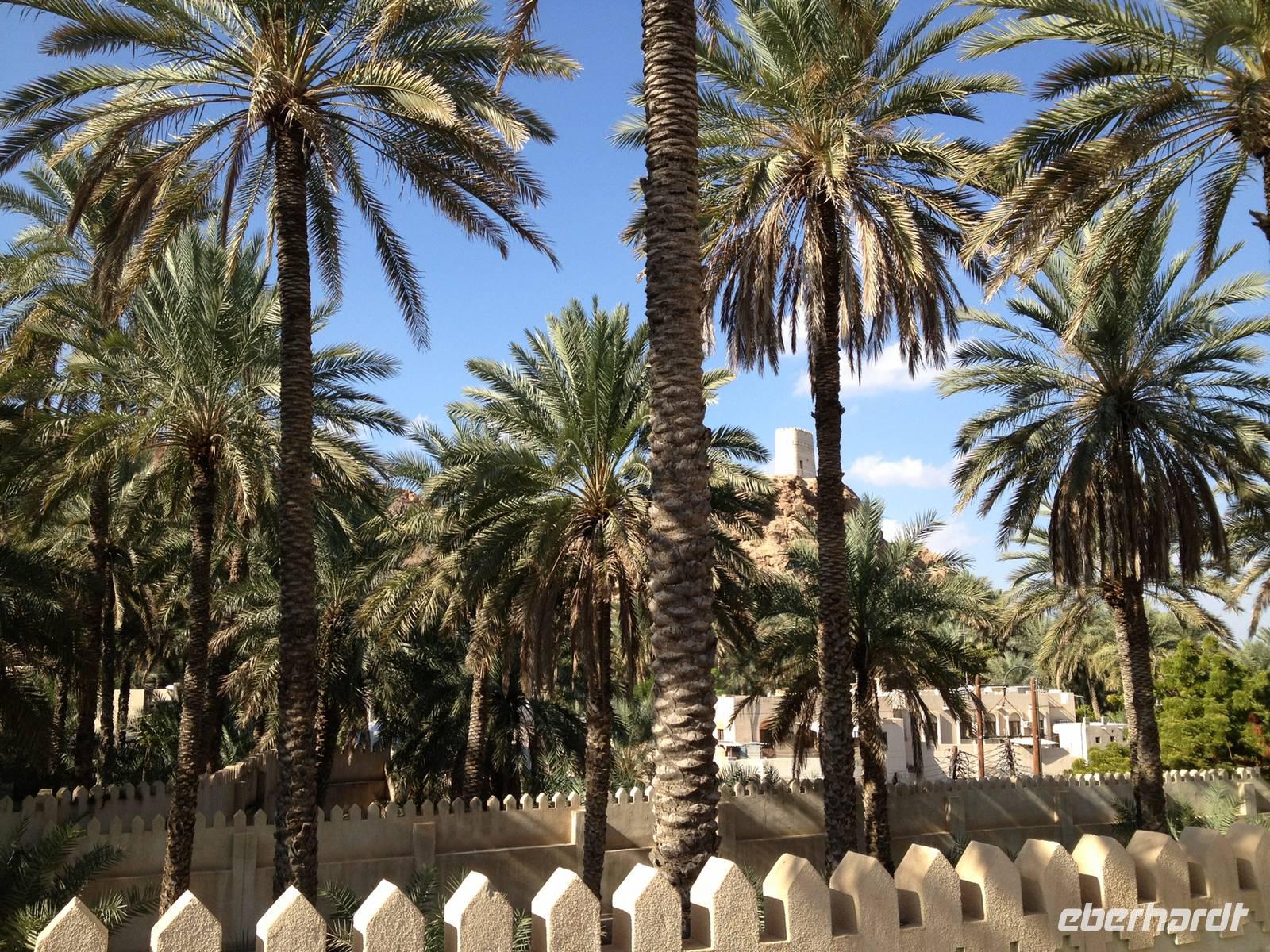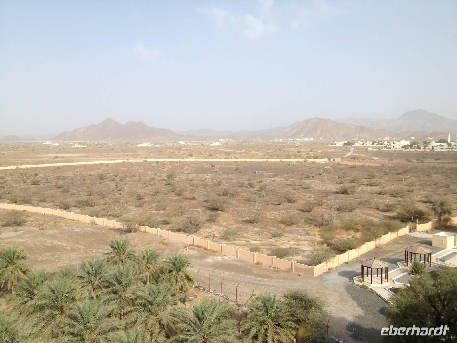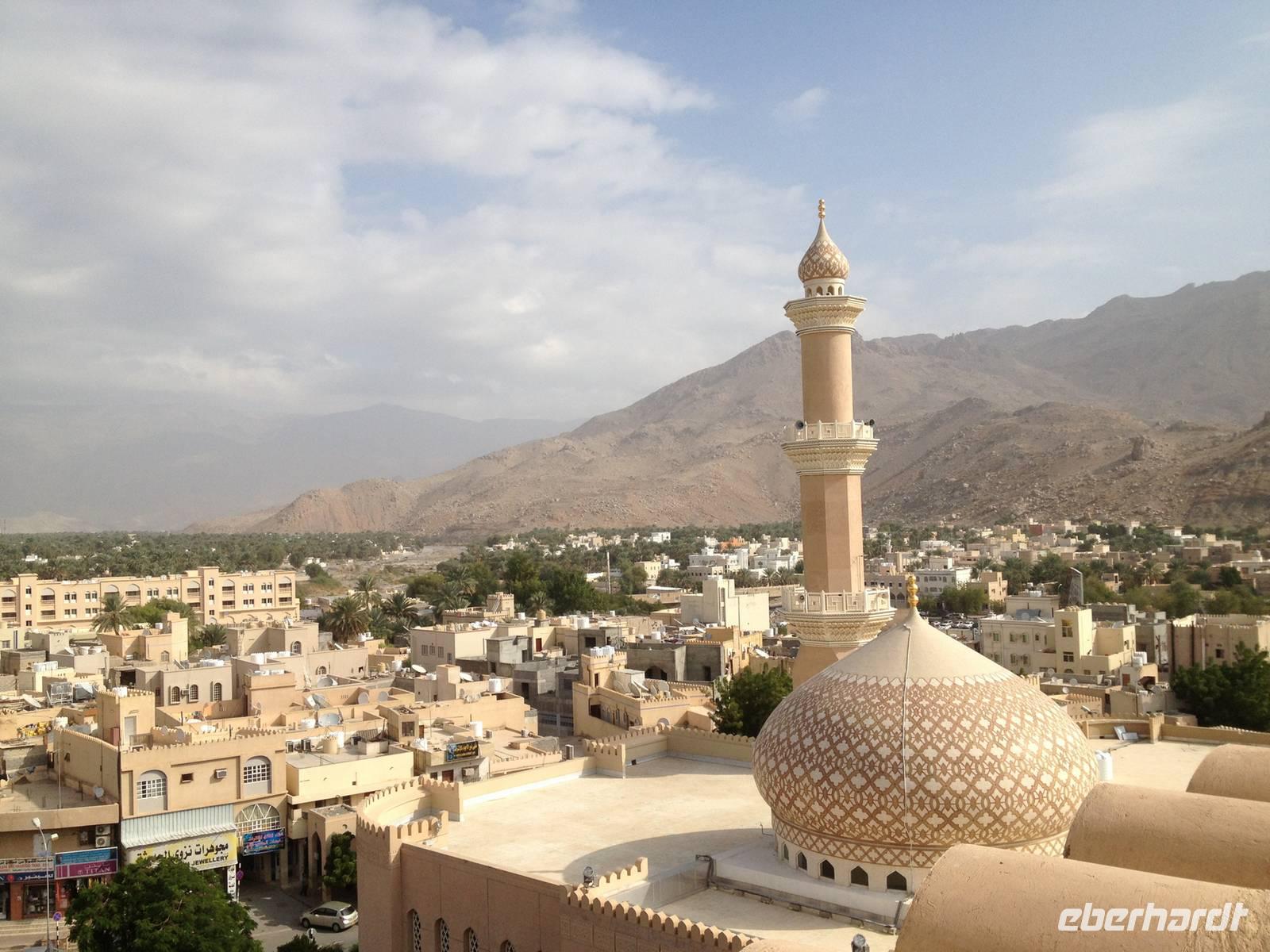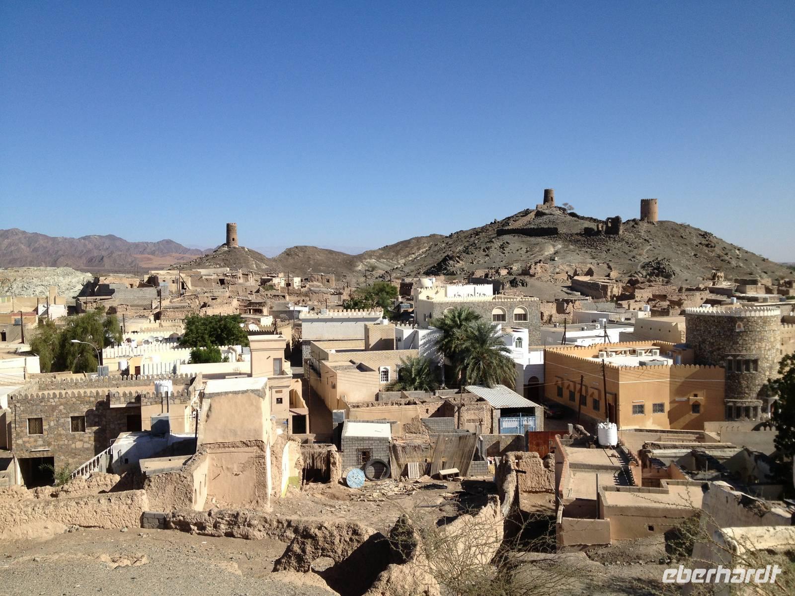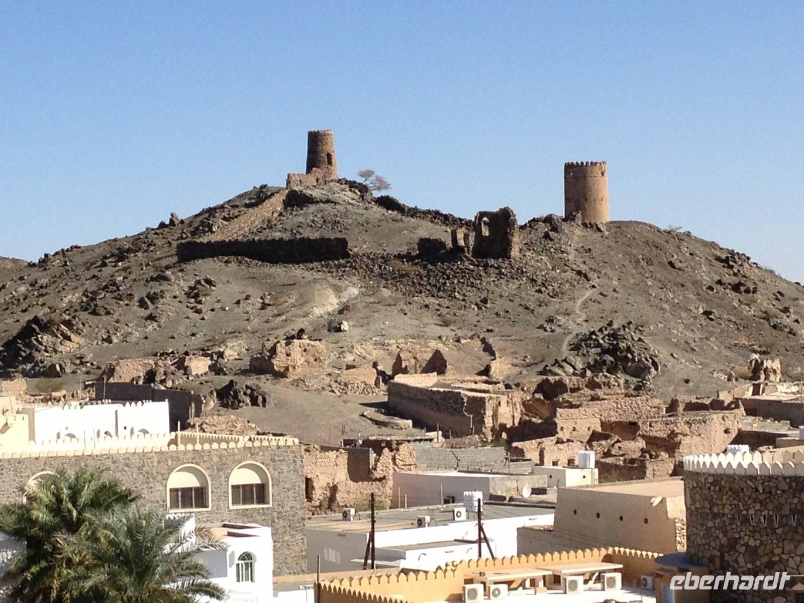 Die im 17. Jahrhundert auf einem Felsvorsprung erbaute Festung ist auf einer Seite von den Felswänden des westlichen Hajars umgeben und ragt auf der anderen Seite über die Batinah-Ebene. Plantage reiht sich an Plantage, Ortschaft an Ortschaft. Hier lebt ein Viertel der Bevölkerung Omans. Datteln, Bananen, Limonen, Mangos, Tomaten, Karotten, Auberginen, Zucchini, Kartoffeln - all dies und auch vieles anderes Gemüse wird hier angebaut.