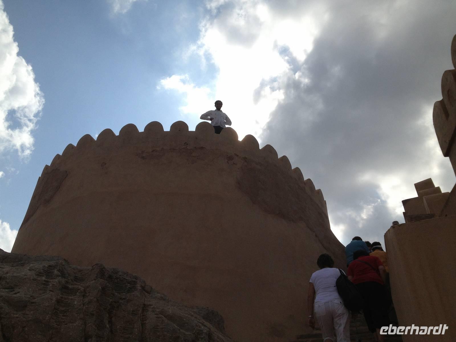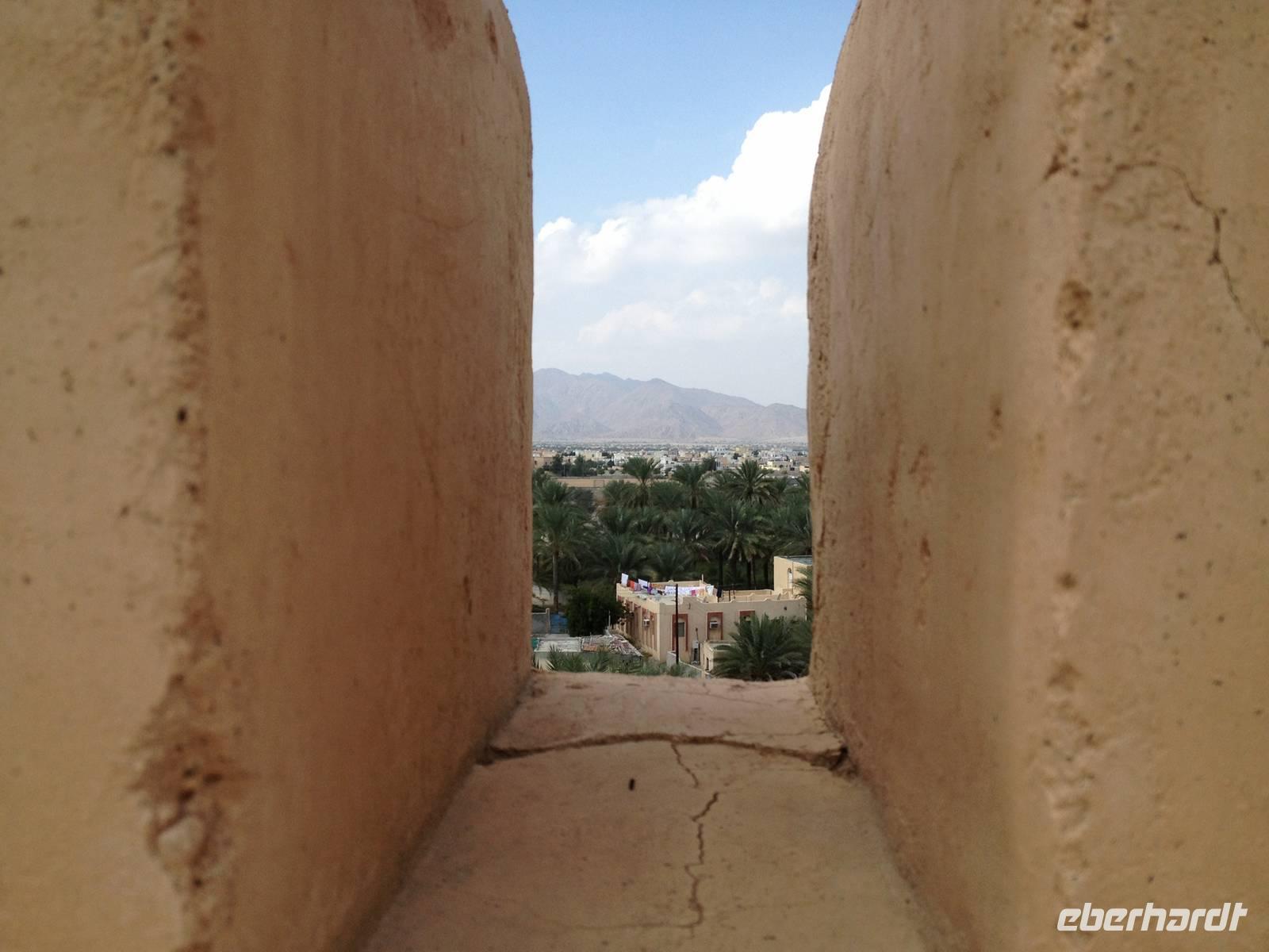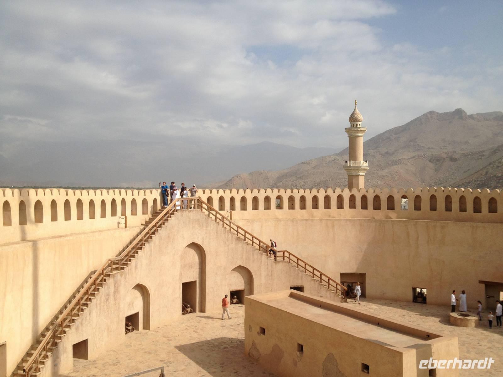 An Nizwas Bedeutung als heimliche Hauptstadt des Landes erinnert das mächtige Fort aus dem 17. Jahrhundert. Eine verwinkelte Treppe führte uns zum runden Kanonenturm, der mit 36 Metern Durchmesser einzigartig dimensioniert ist. Bei Konflikten gab's, wie in allen omanischen Forts üblich, heißen Dattelhonig oder Öl ins Genick der Angreifer - durch winzige Schlitze über den Türen.