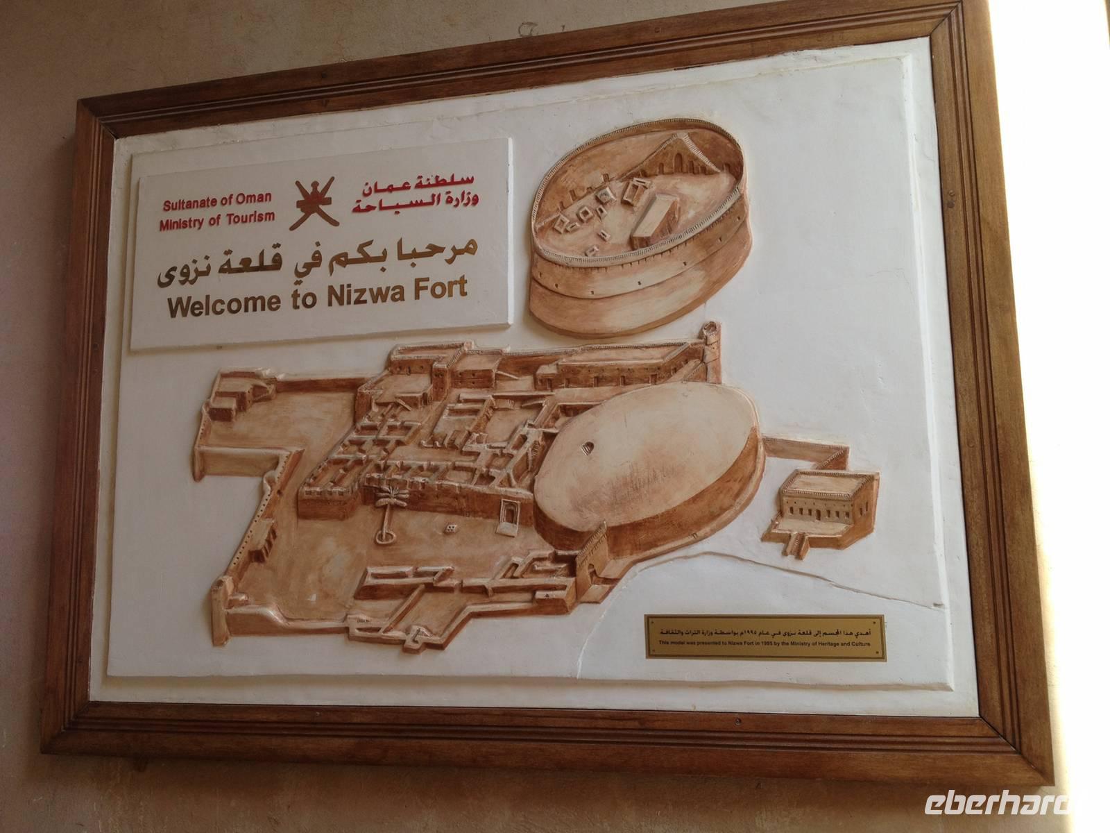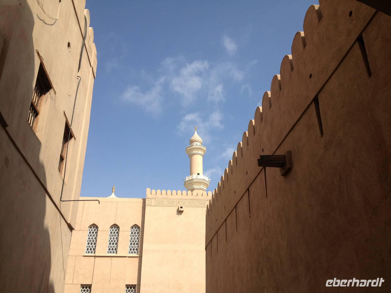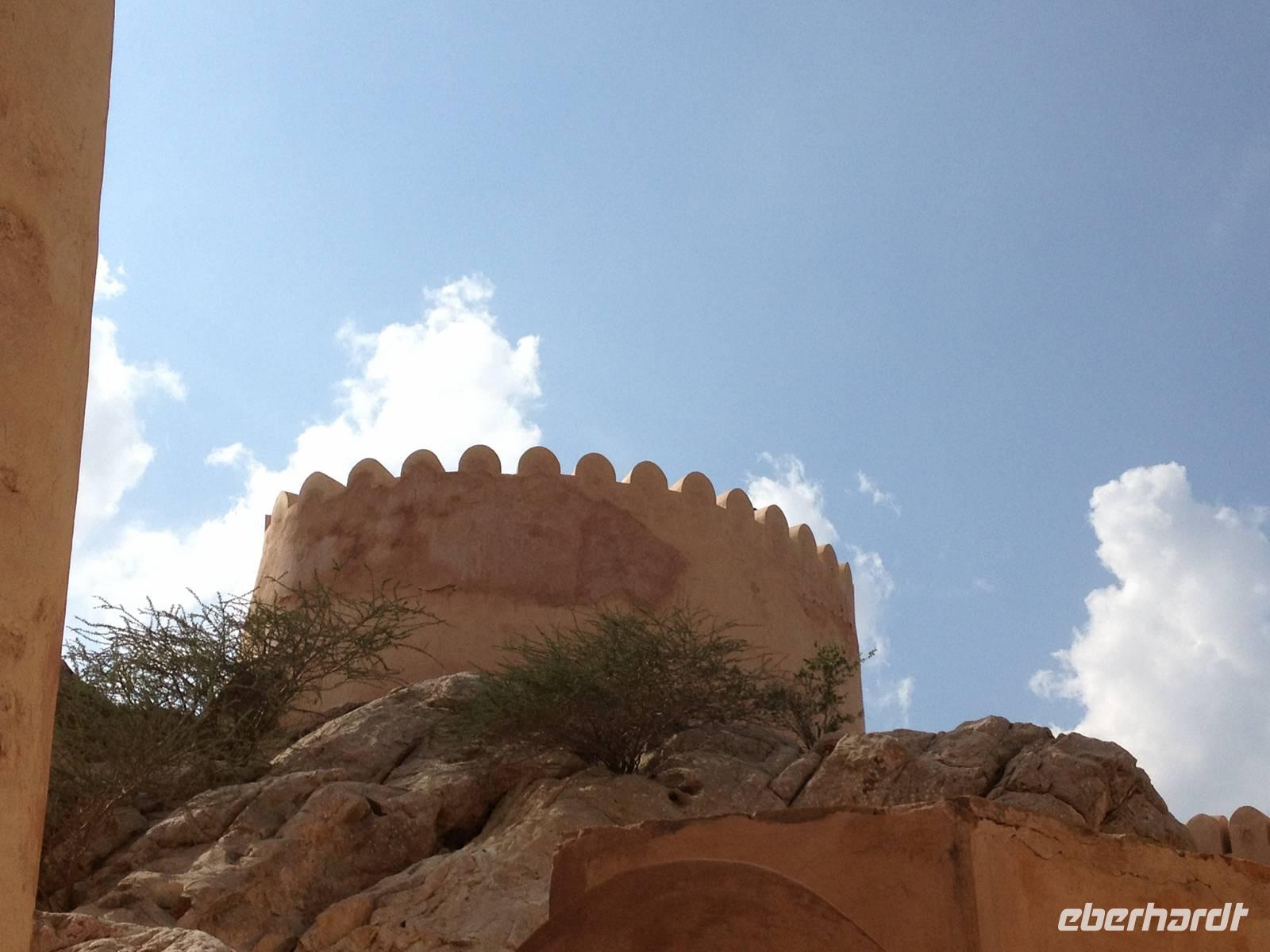 An Nizwas Bedeutung als heimliche Hauptstadt des Landes erinnert das mächtige Fort aus dem 17. Jahrhundert. Eine verwinkelte Treppe führte uns zum runden Kanonenturm, der mit 36 Metern Durchmesser einzigartig dimensioniert ist. Bei Konflikten gab's, wie in allen omanischen Forts üblich, heißen Dattelhonig oder Öl ins Genick der Angreifer - durch winzige Schlitze über den Türen.
