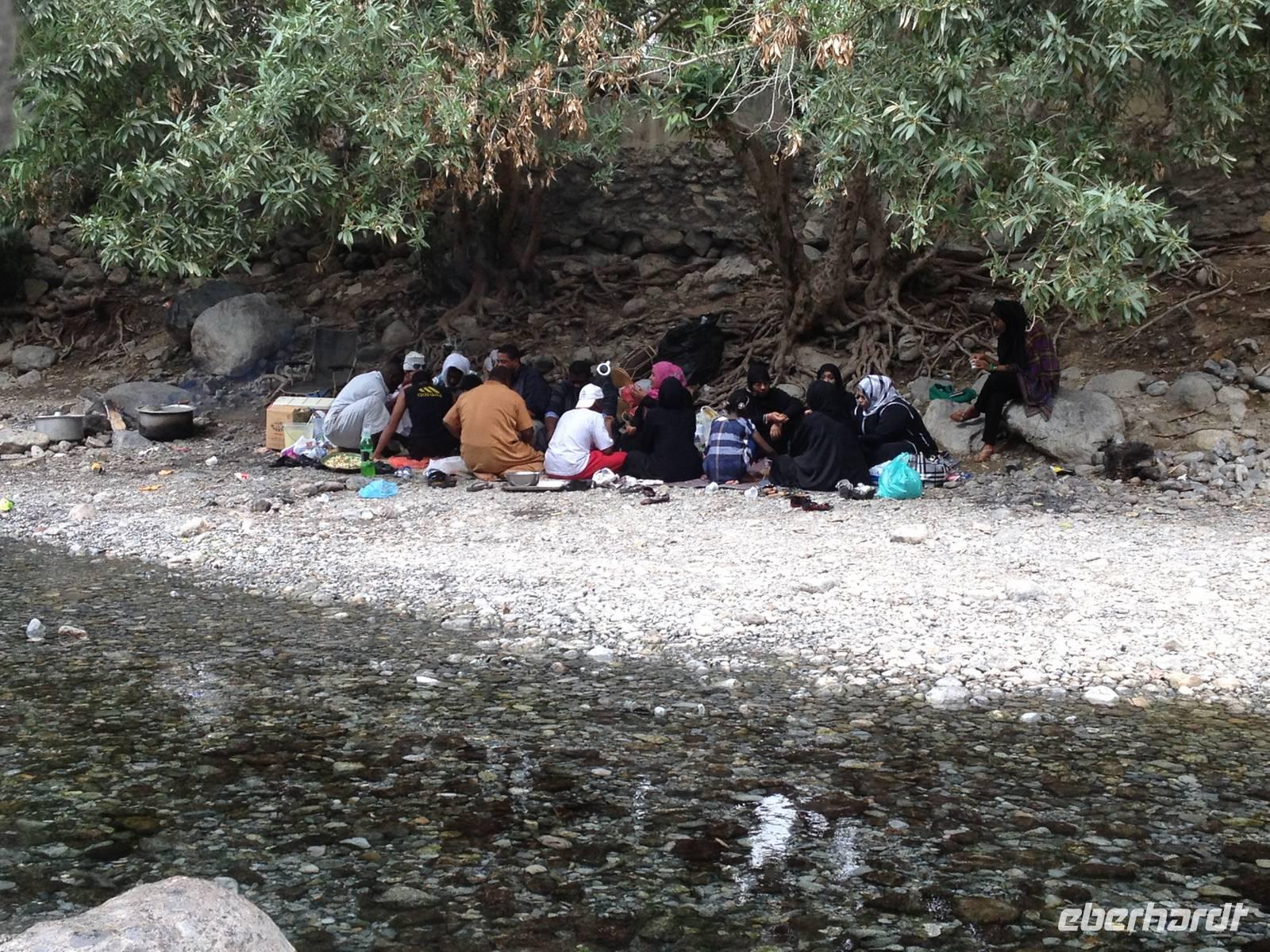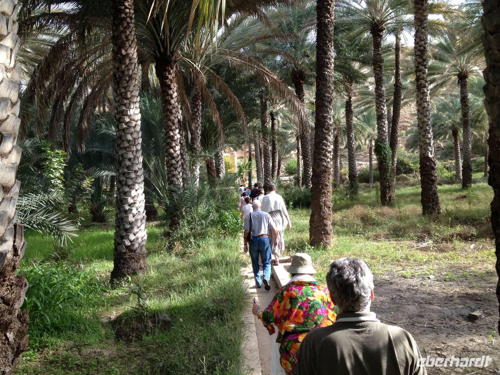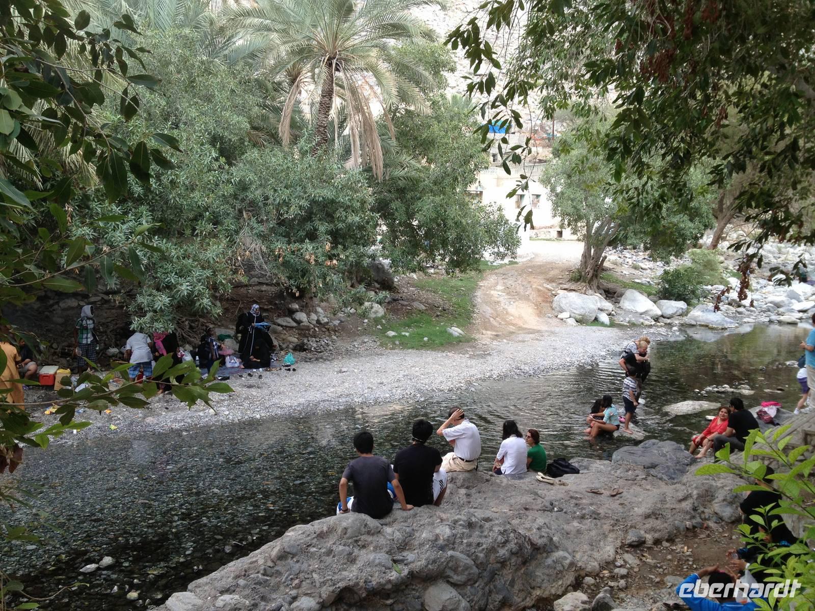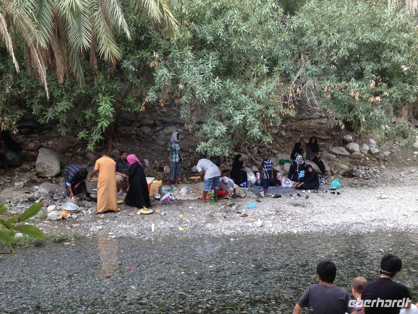 An der Hinterseite der Festung liegt im Herzen eines Palmenhains die warme Quelle von Ain Thowarah, deren Wasser die traditionellen Bewässerungskanäle entlang der Plantagen, speist. Ein perfekter Ort für unser Picknick. Es gab Tabouleh (libanesischerPetersiliensalat), gefüllte Teigtaschen und Obstsalat. Viele Einheimische gesellten sich ebenfalls in dieses kleine Wadi zum Picknick. Die Kinder spielten im angenehm warmen Wasser und die Erwachsenen bildeten die typischen Männer- und Frauenrunden.