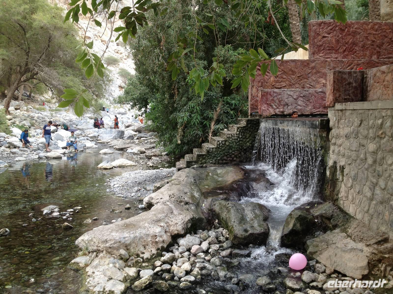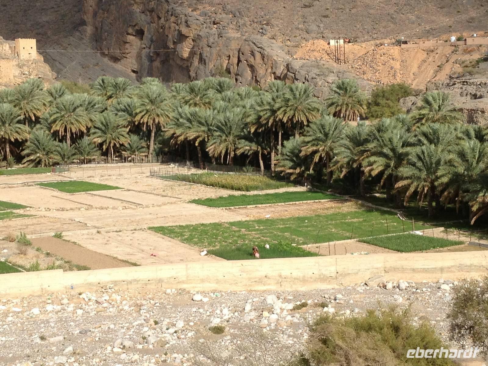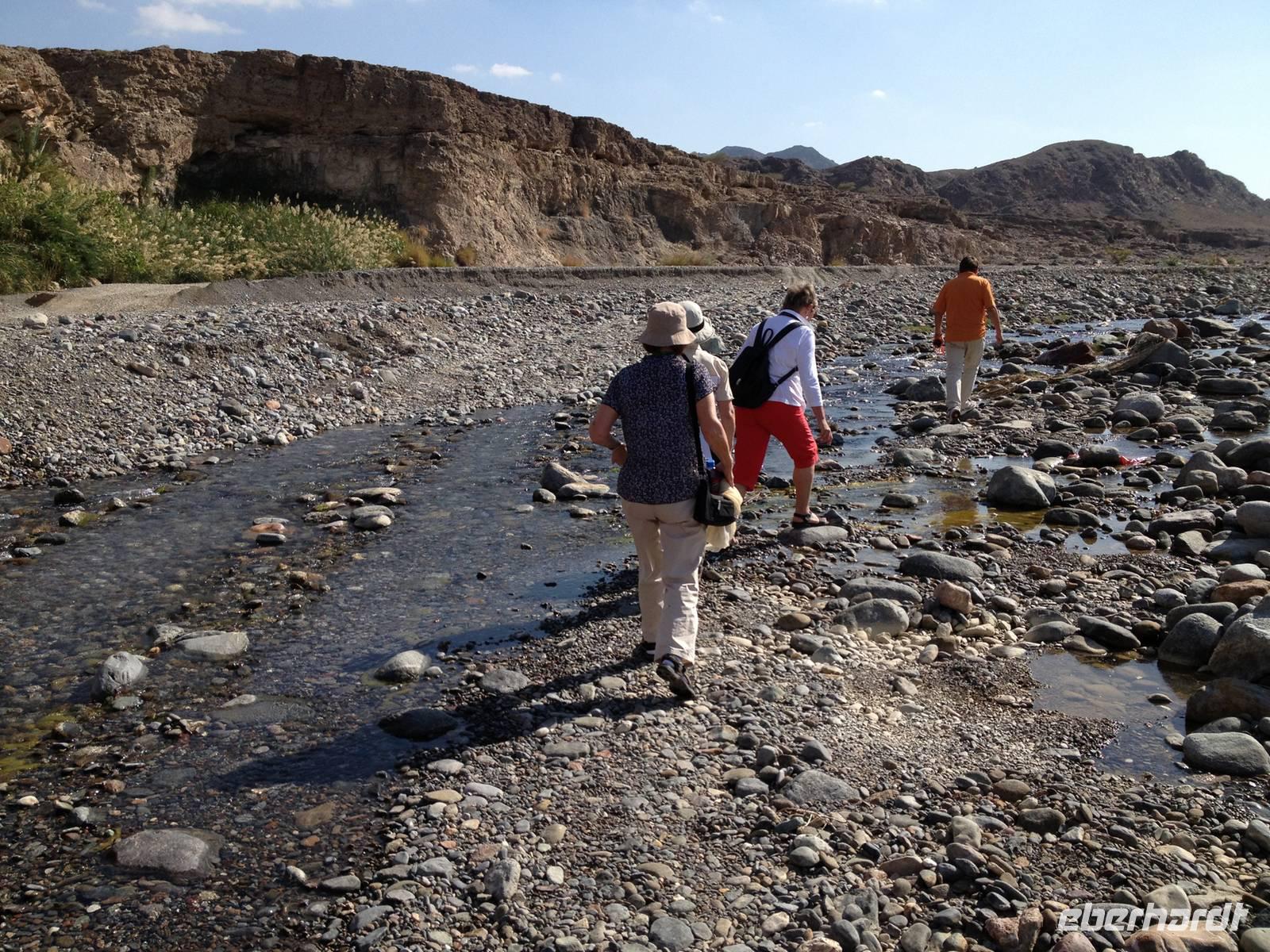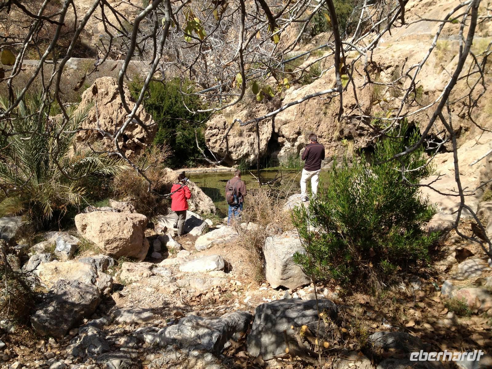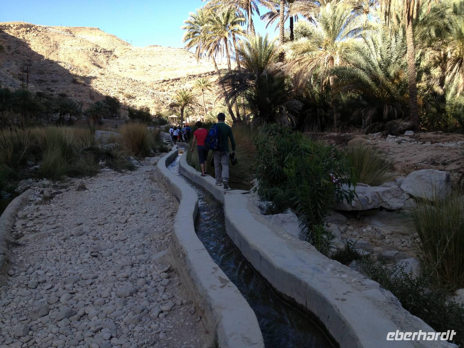 An der Hinterseite der Festung liegt im Herzen eines Palmenhains die warme Quelle von Ain Thowarah, deren Wasser die traditionellen Bewässerungskanäle entlang der Plantagen, speist. Ein perfekter Ort für unser Picknick. Es gab Tabouleh (libanesischerPetersiliensalat), gefüllte Teigtaschen und Obstsalat. Viele Einheimische gesellten sich ebenfalls in dieses kleine Wadi zum Picknick. Die Kinder spielten im angenehm warmen Wasser und die Erwachsenen bildeten die typischen Männer- und Frauenrunden.
