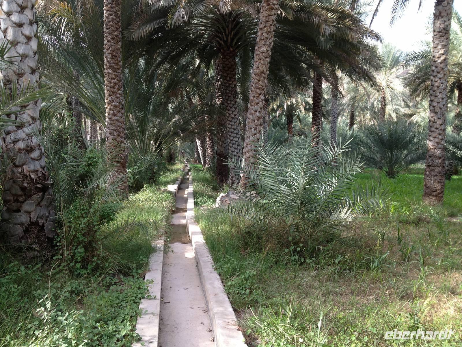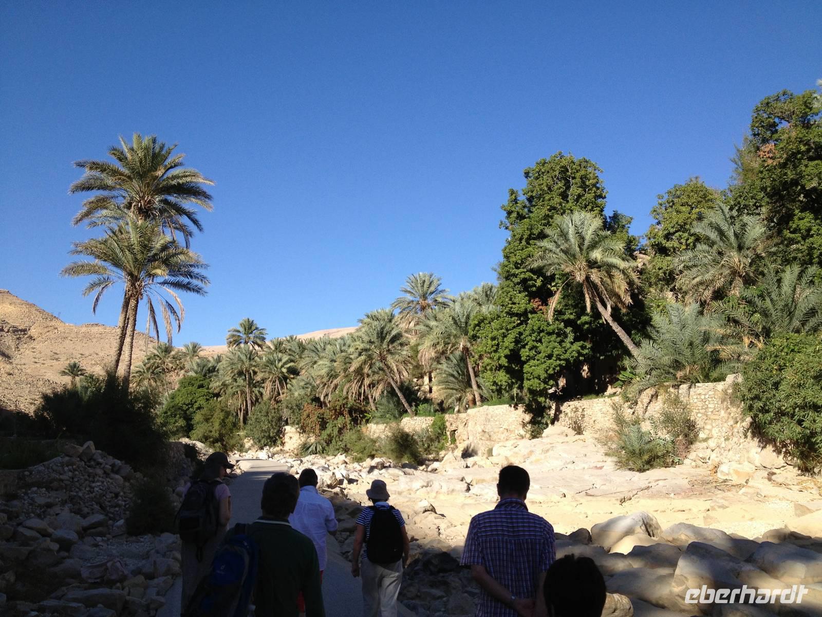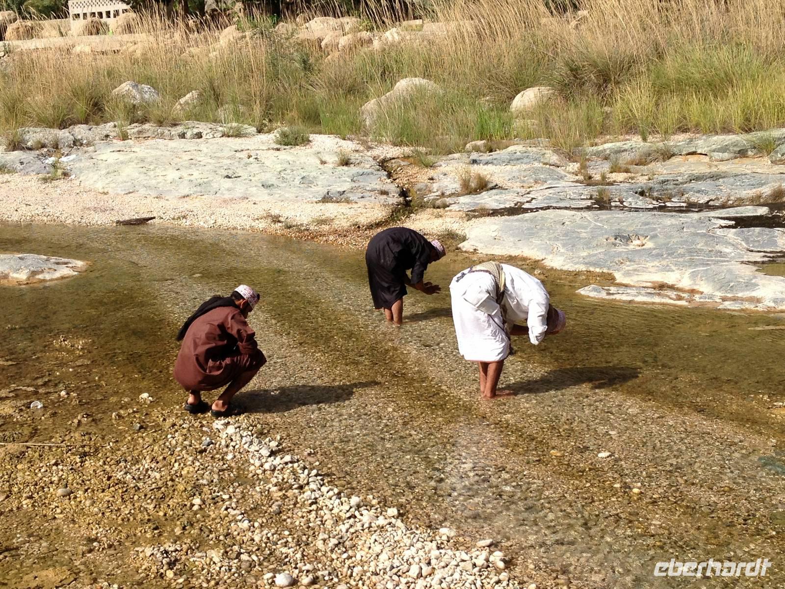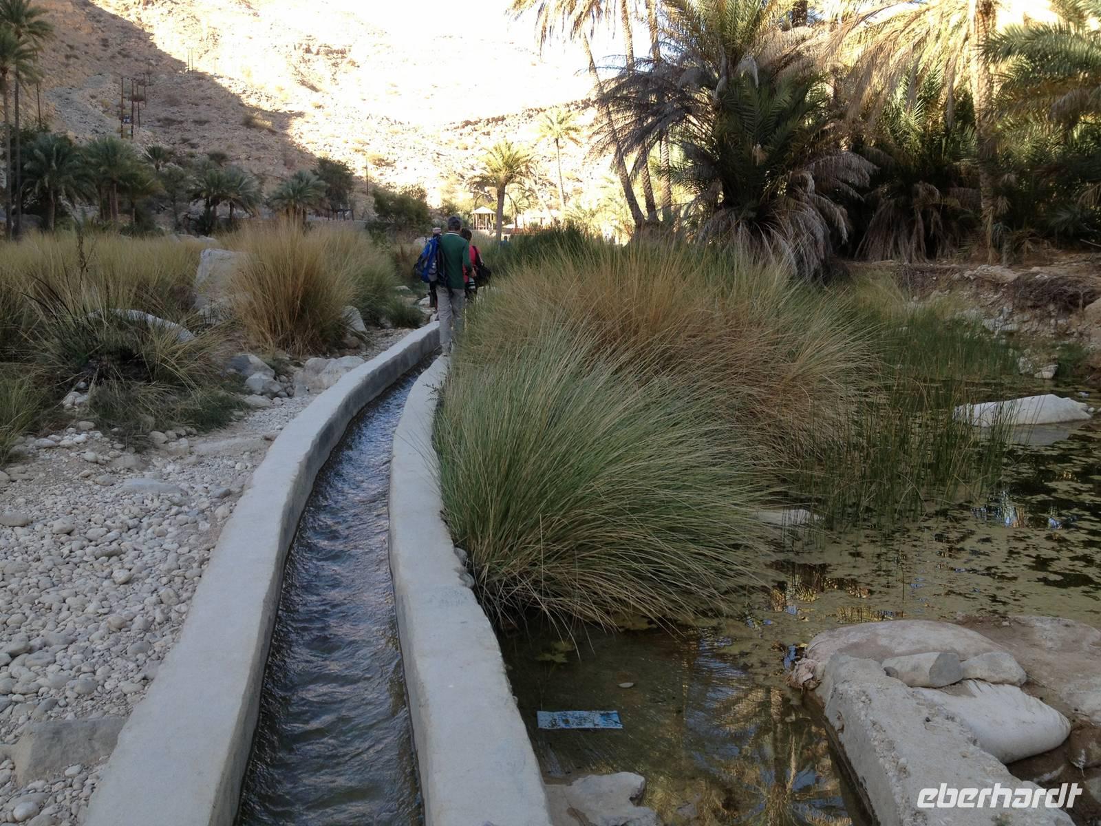 An der Hinterseite der Festung liegt im Herzen eines Palmenhains die warme Quelle von Ain Thowarah, deren Wasser die traditionellen Bewässerungskanäle entlang der Plantagen, speist. Ein perfekter Ort für unser Picknick. Es gab Tabouleh (libanesischerPetersiliensalat), gefüllte Teigtaschen und Obstsalat. Viele Einheimische gesellten sich ebenfalls in dieses kleine Wadi zum Picknick. Die Kinder spielten im angenehm warmen Wasser und die Erwachsenen bildeten die typischen Männer- und Frauenrunden.