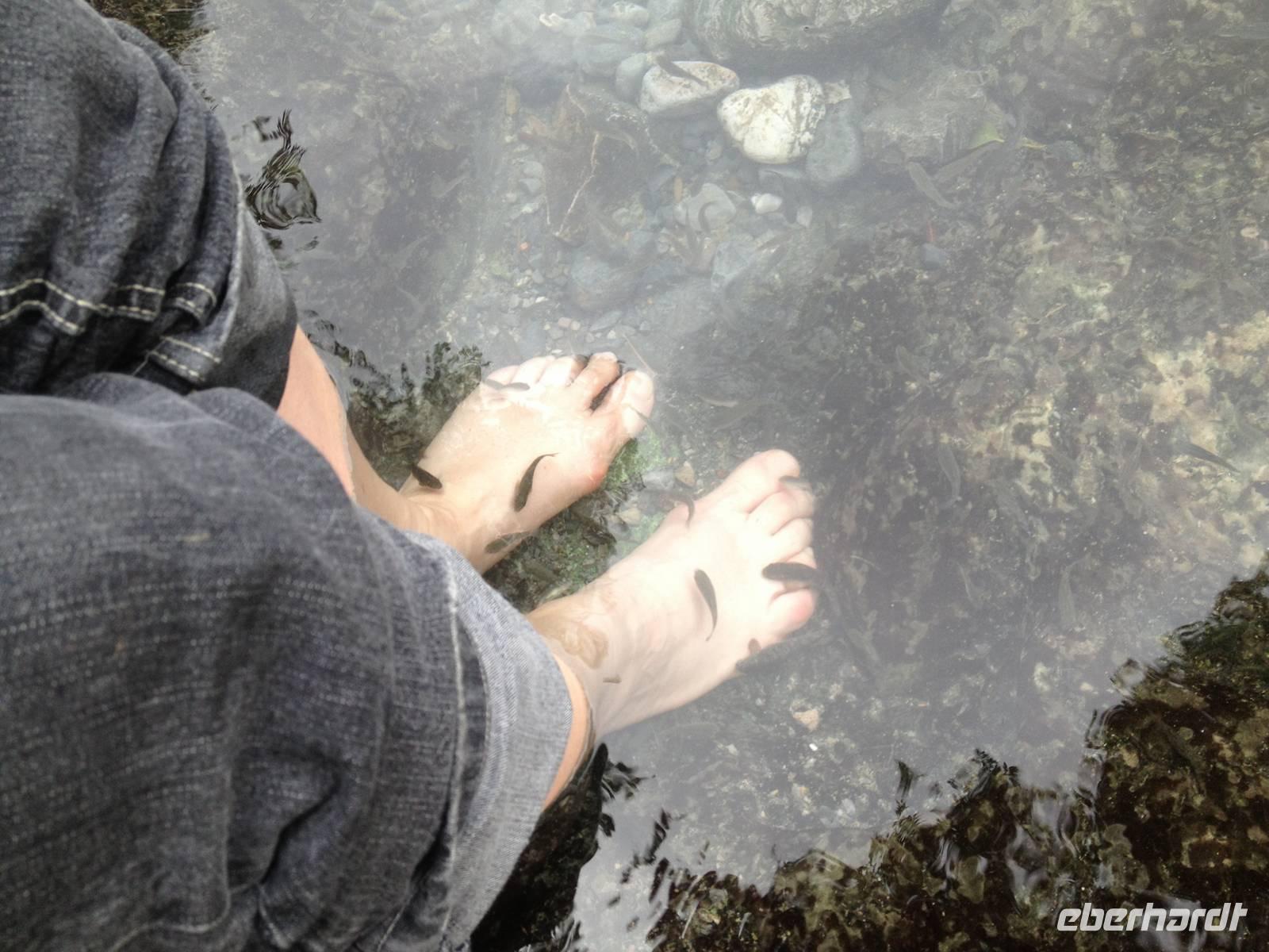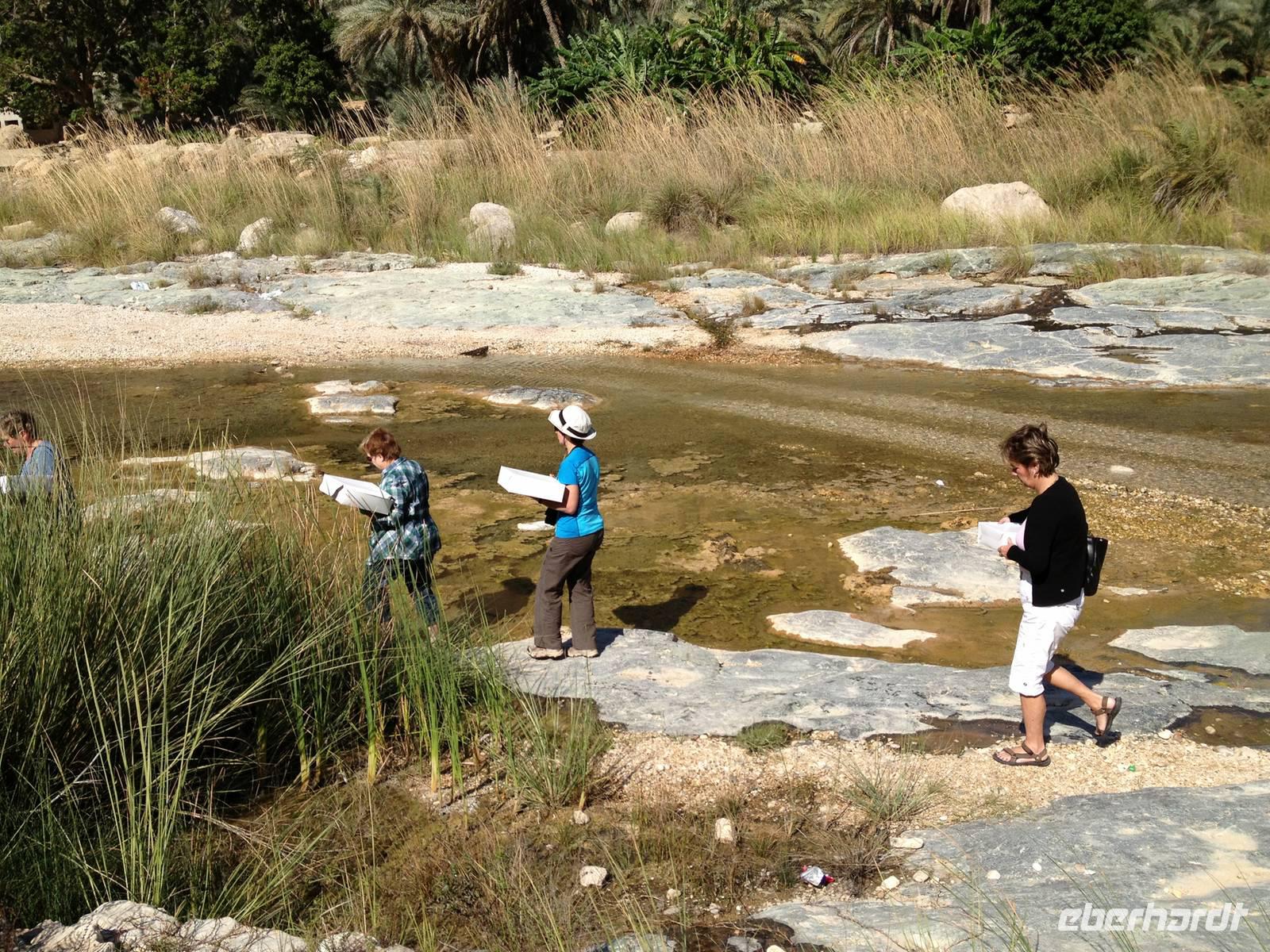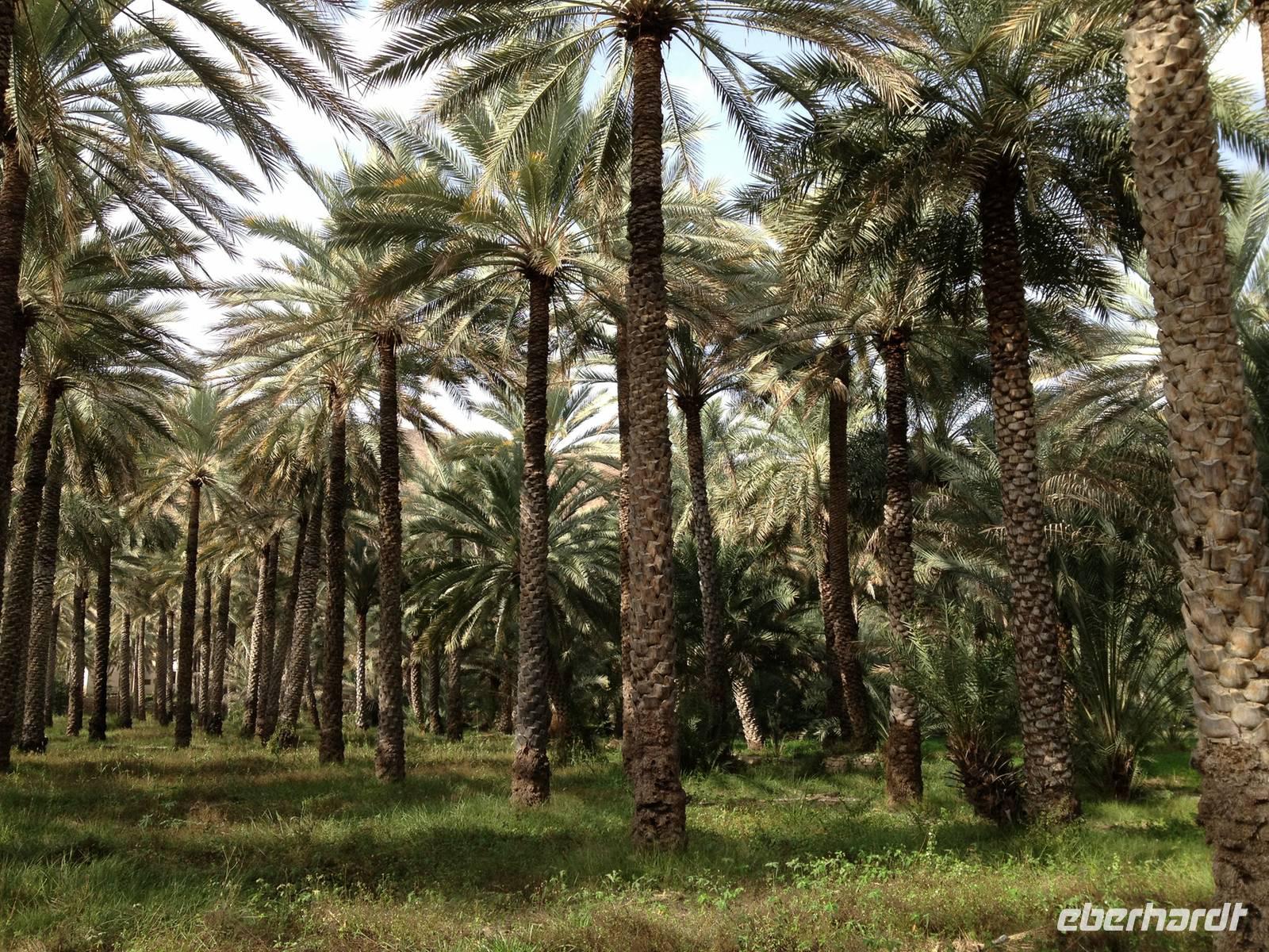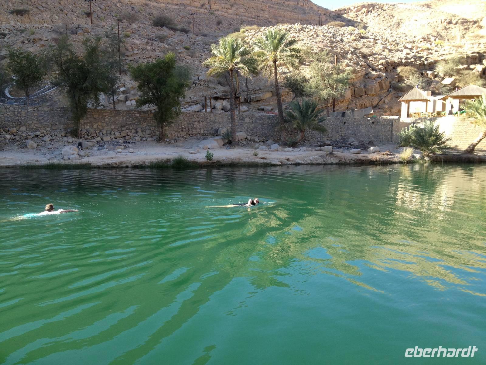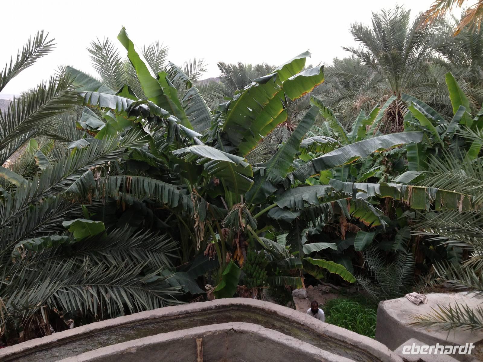 An der Hinterseite der Festung liegt im Herzen eines Palmenhains die warme Quelle von Ain Thowarah, deren Wasser die traditionellen Bewässerungskanäle entlang der Plantagen, speist. Ein perfekter Ort für unser Picknick. Es gab Tabouleh (libanesischerPetersiliensalat), gefüllte Teigtaschen und Obstsalat. Viele Einheimische gesellten sich ebenfalls in dieses kleine Wadi zum Picknick. Die Kinder spielten im angenehm warmen Wasser und die Erwachsenen bildeten die typischen Männer- und Frauenrunden.