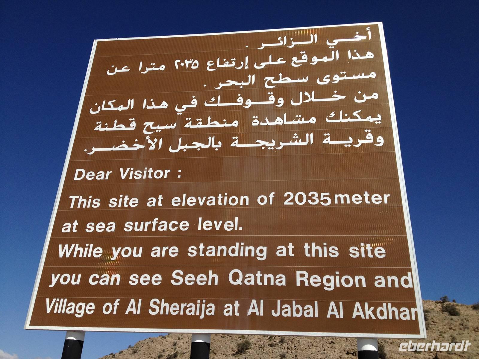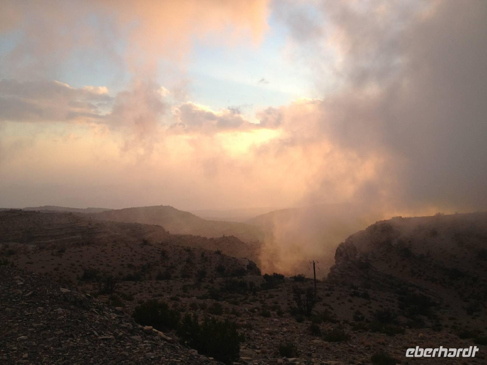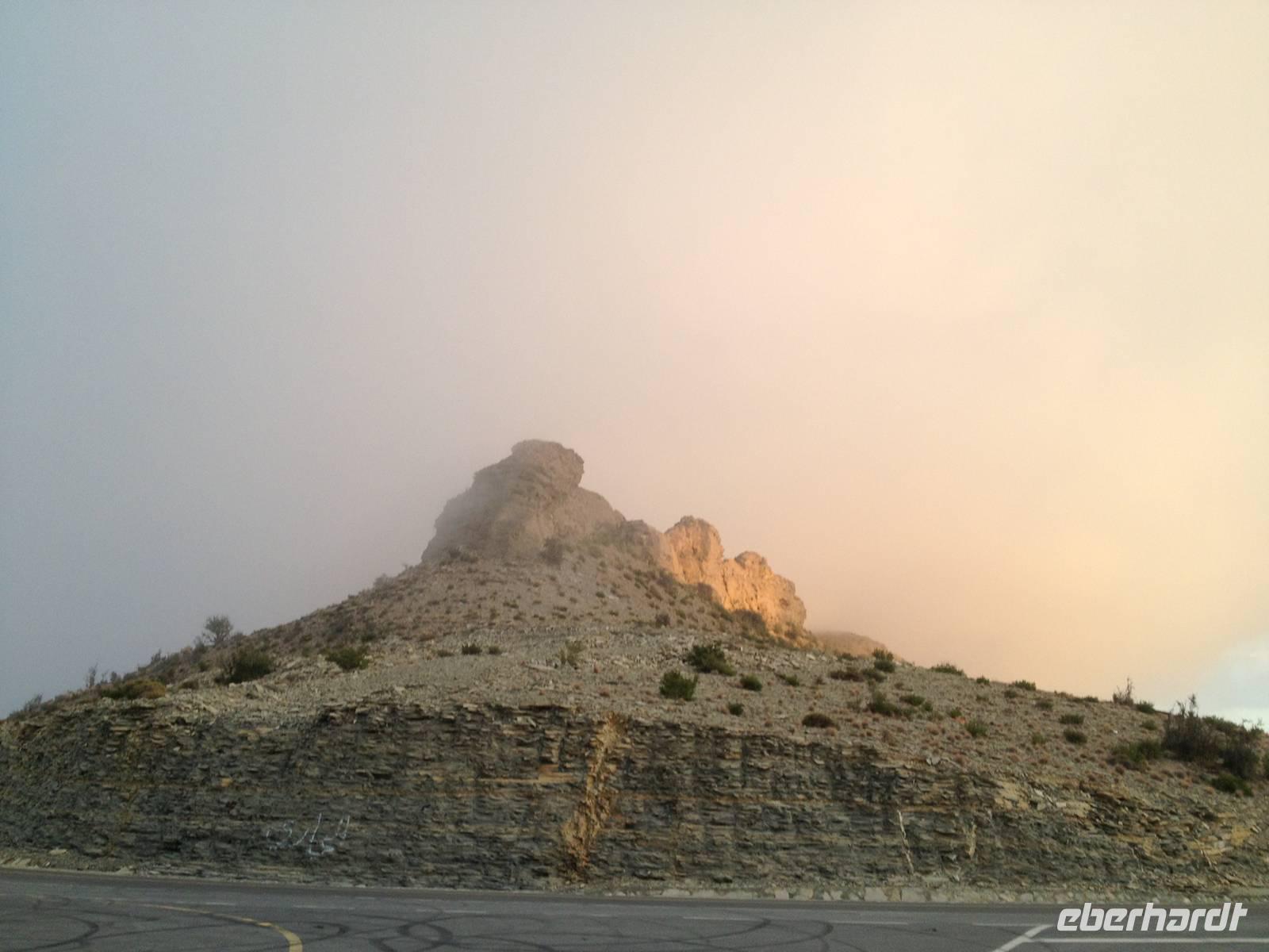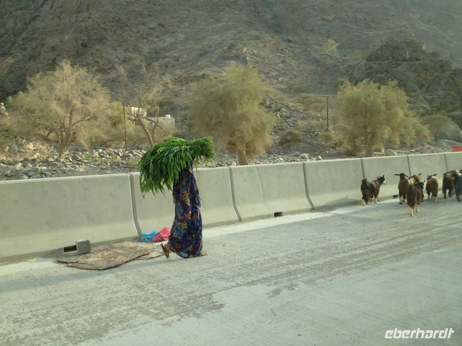 Die Zufahrt zum Jabal Akhdar erfolgte durch das Oasenstädtchen Birkat al Mauz in ein Wadi. Von hier stieg die Straße auf einer Strecke von 35 Kilometern in engen Kurven bis zum Jebel Akhdar auf eine Höhe von 2000 Metern empor. Immer wieder fragten wir uns, für wen diese Straßen benötigt werden? Das Verkehrsaufkommen ist bestimmt alles andere als groß. Es ist jedoch eine wahre Meisterleistung.
