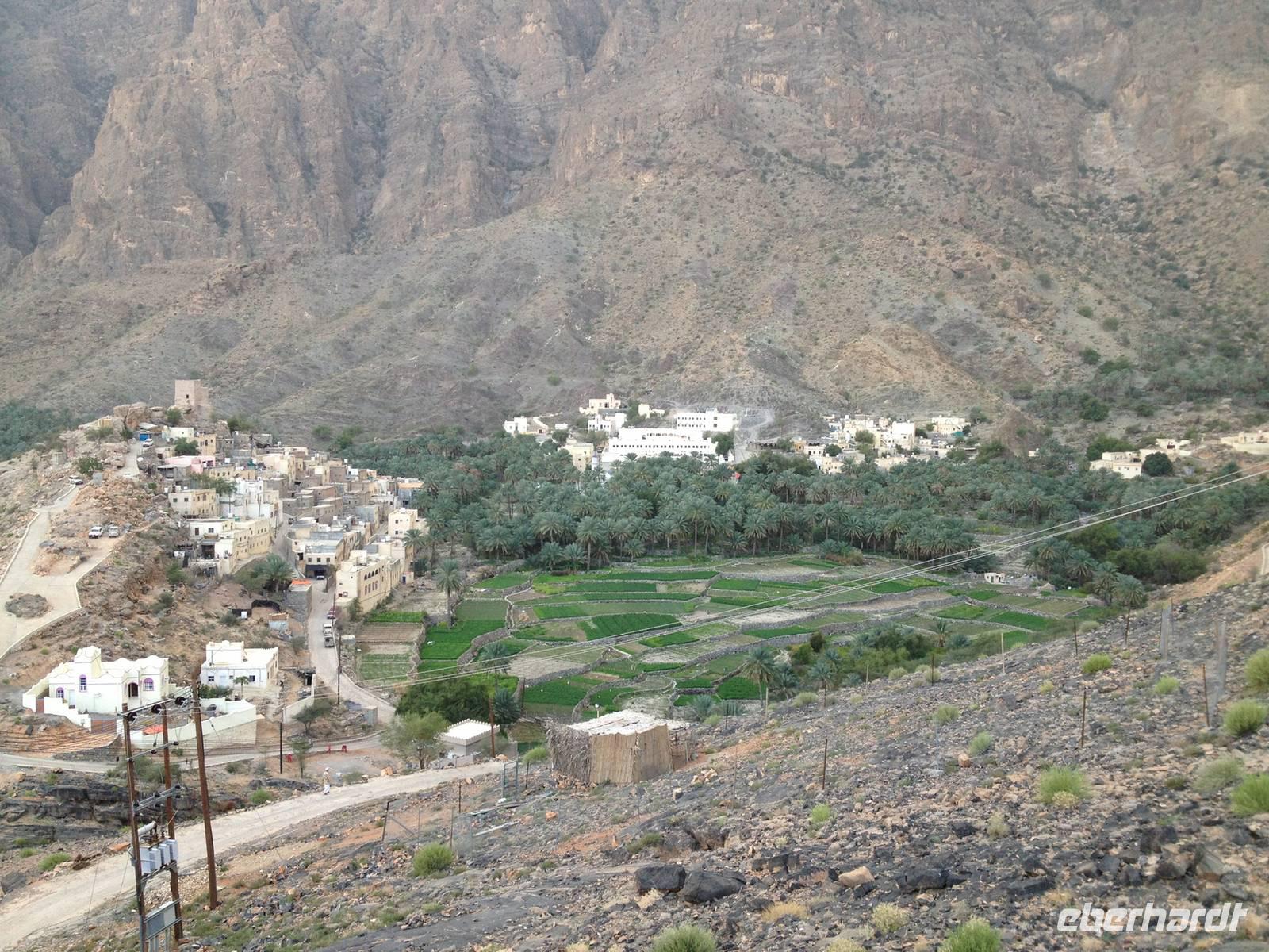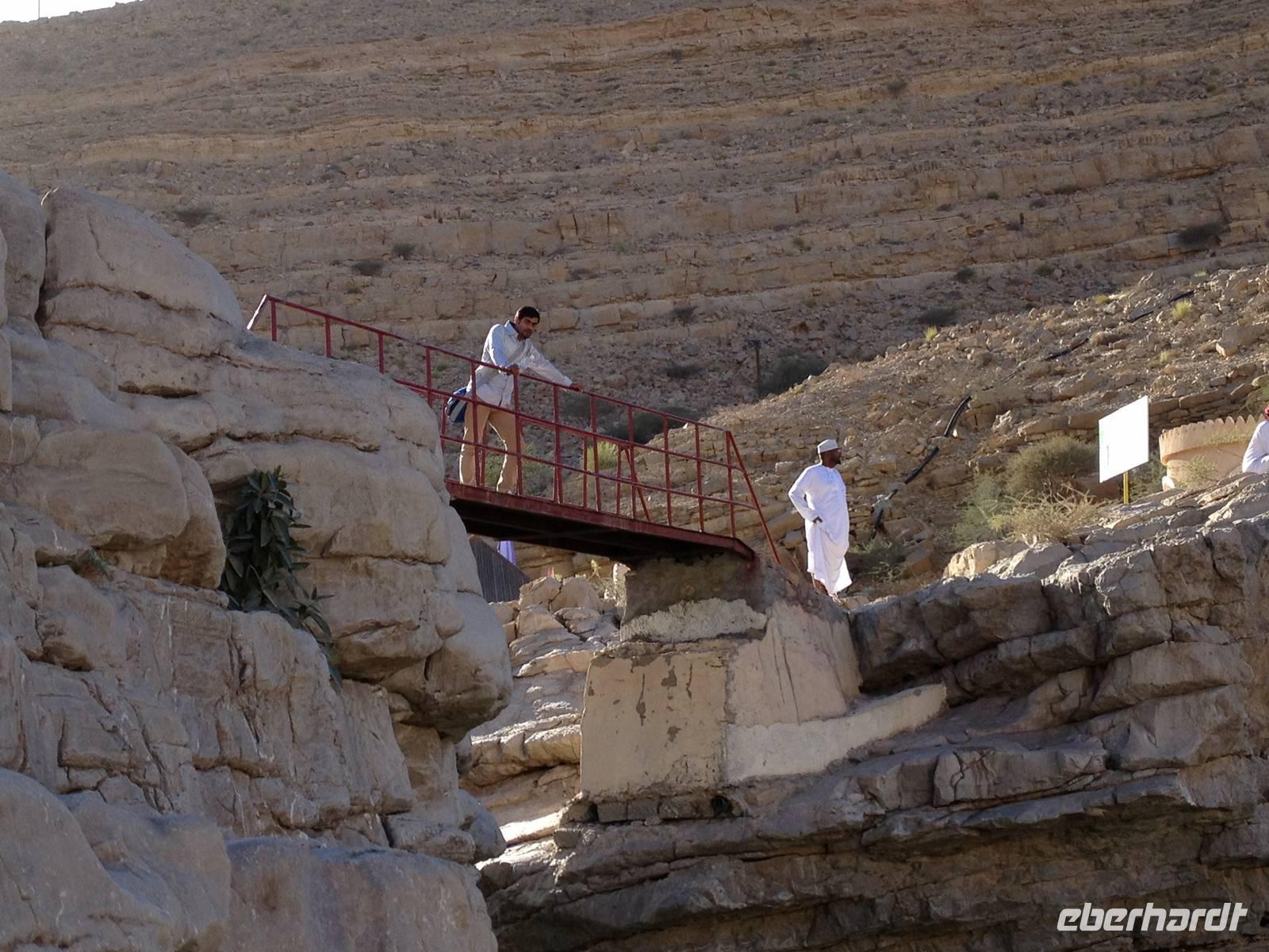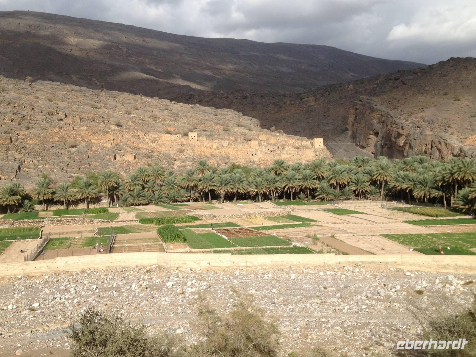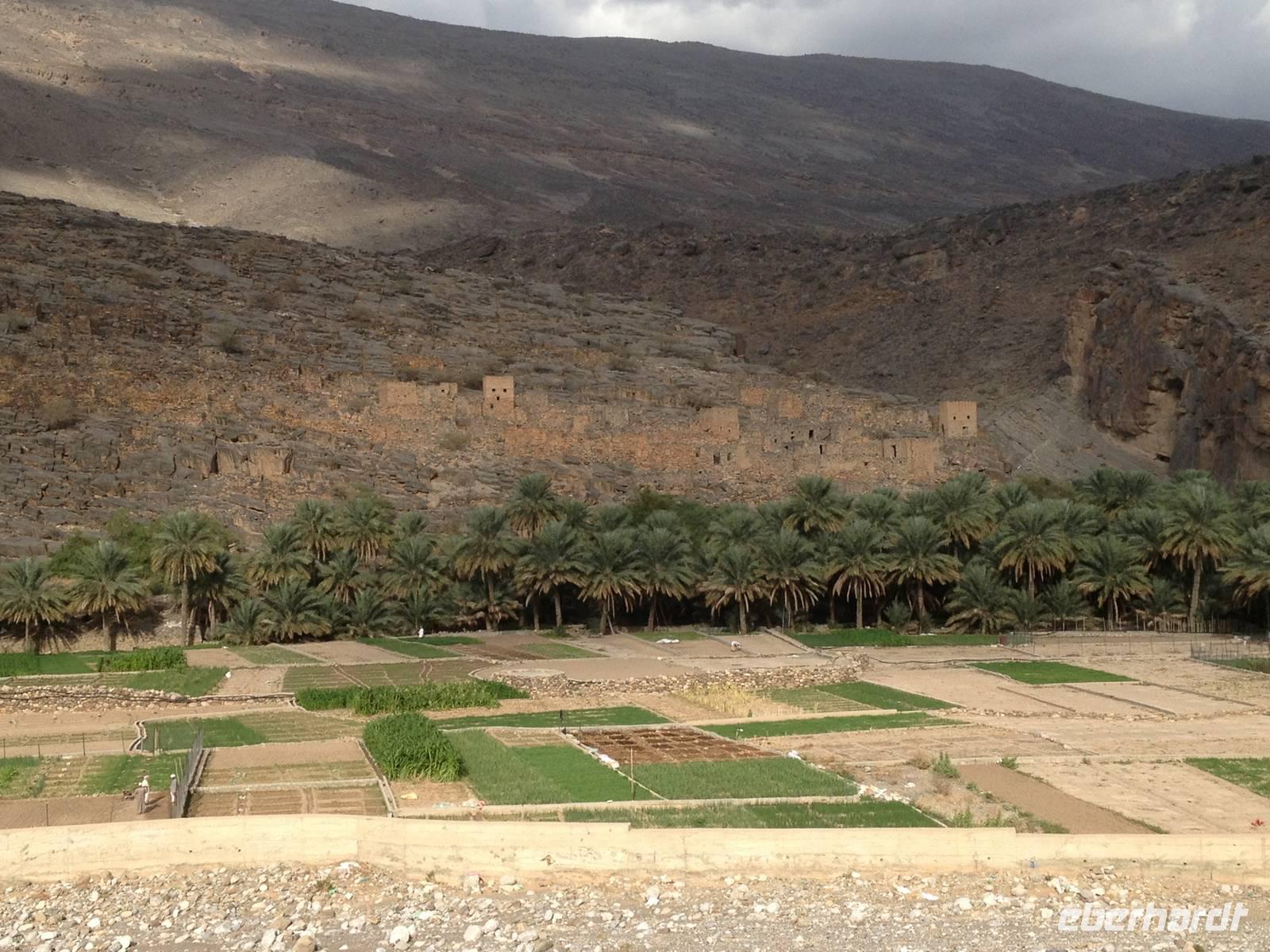 Das Bergdorf Misfah war unser letzter Programmpunkt für den heutigen Tag. Der alte Ortskern ist vollständig aus Natursteinen errichtet, und ein Rundgang durch die engen Gassen führte uns zu den am Steilhang entlang führenden Falaj-Kanälen, die die kunstvoll angelegten, kleinen Gartenparzellen bewässern. Steile Stufen verbinden Misfahs übereinander geschachtelte Steinhäuser. Wie ein Garten Eden breiten sich rings um den Ort terrassenartige Dattelpalmengärten und Plantagen aus.