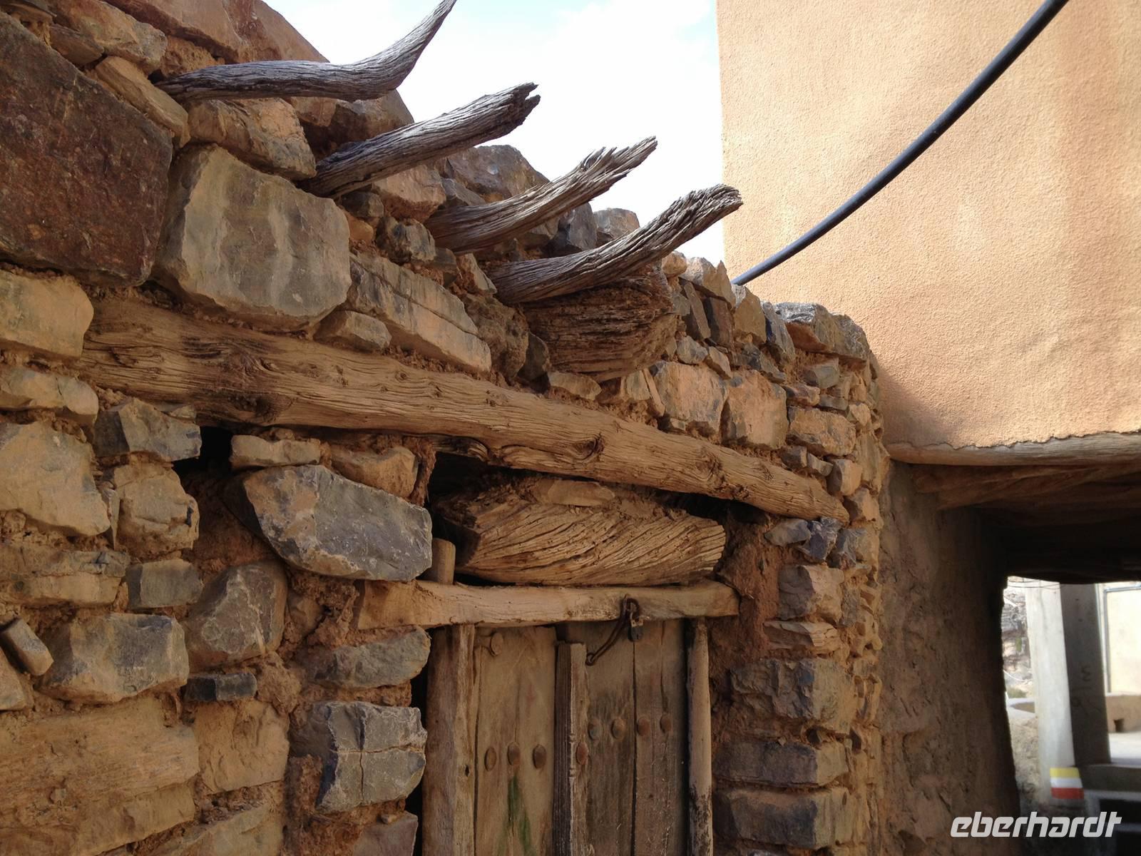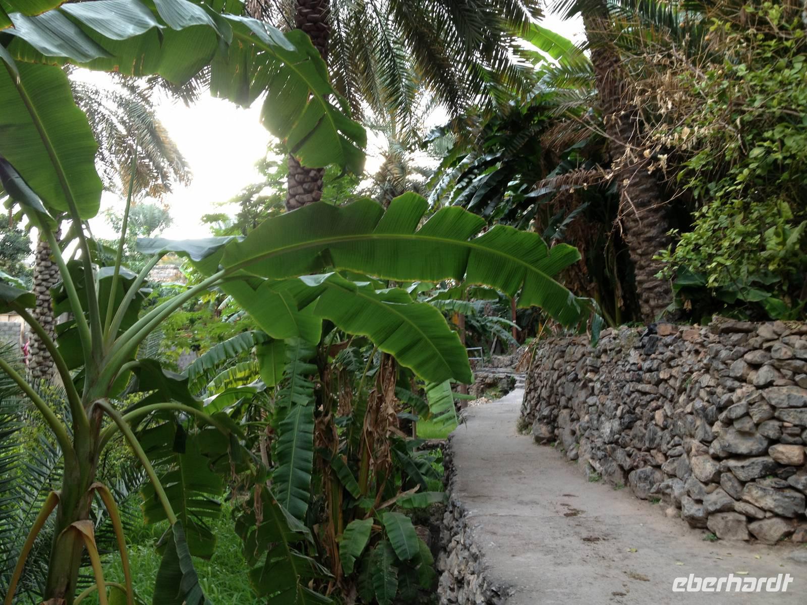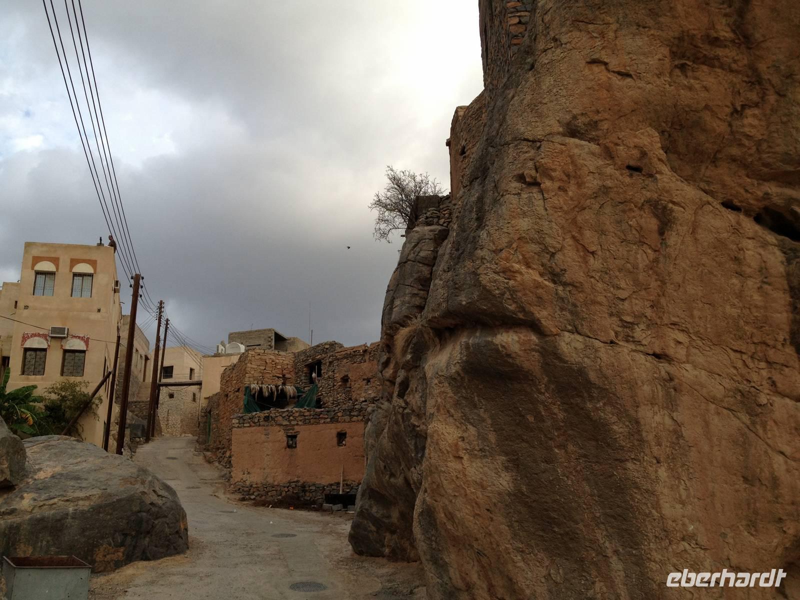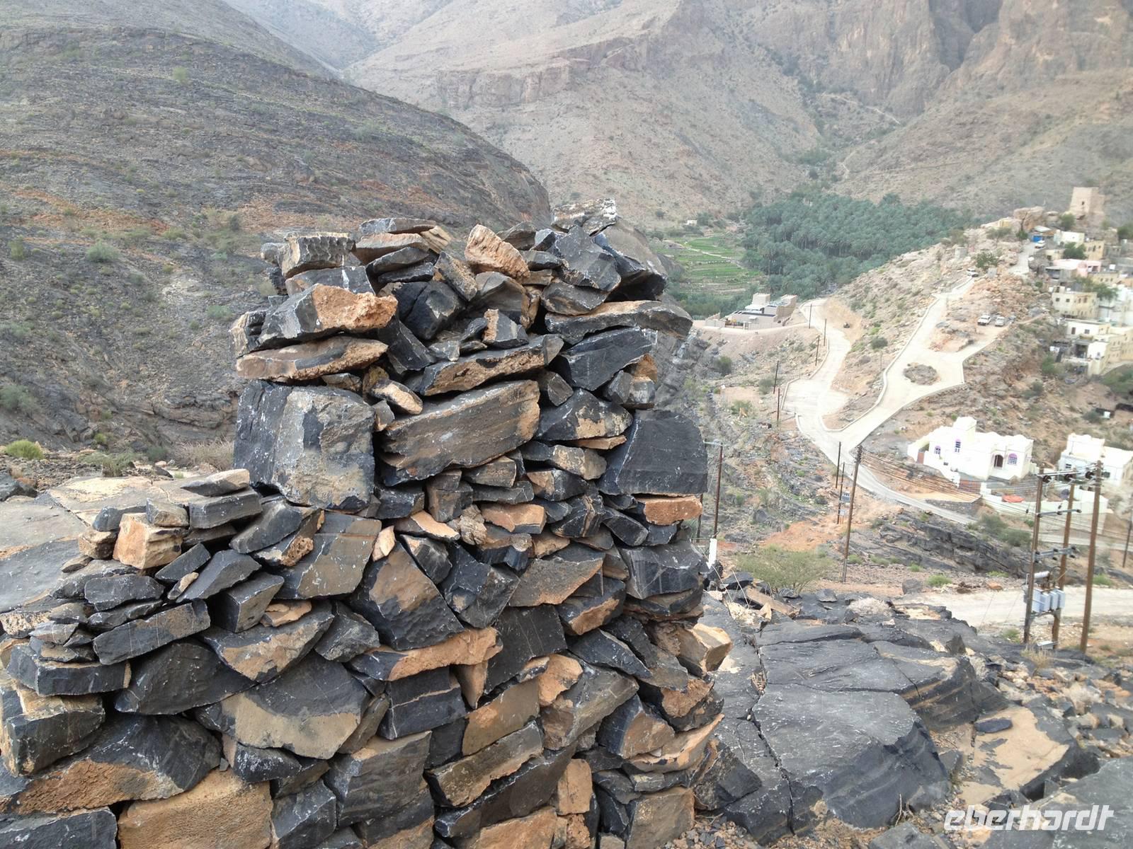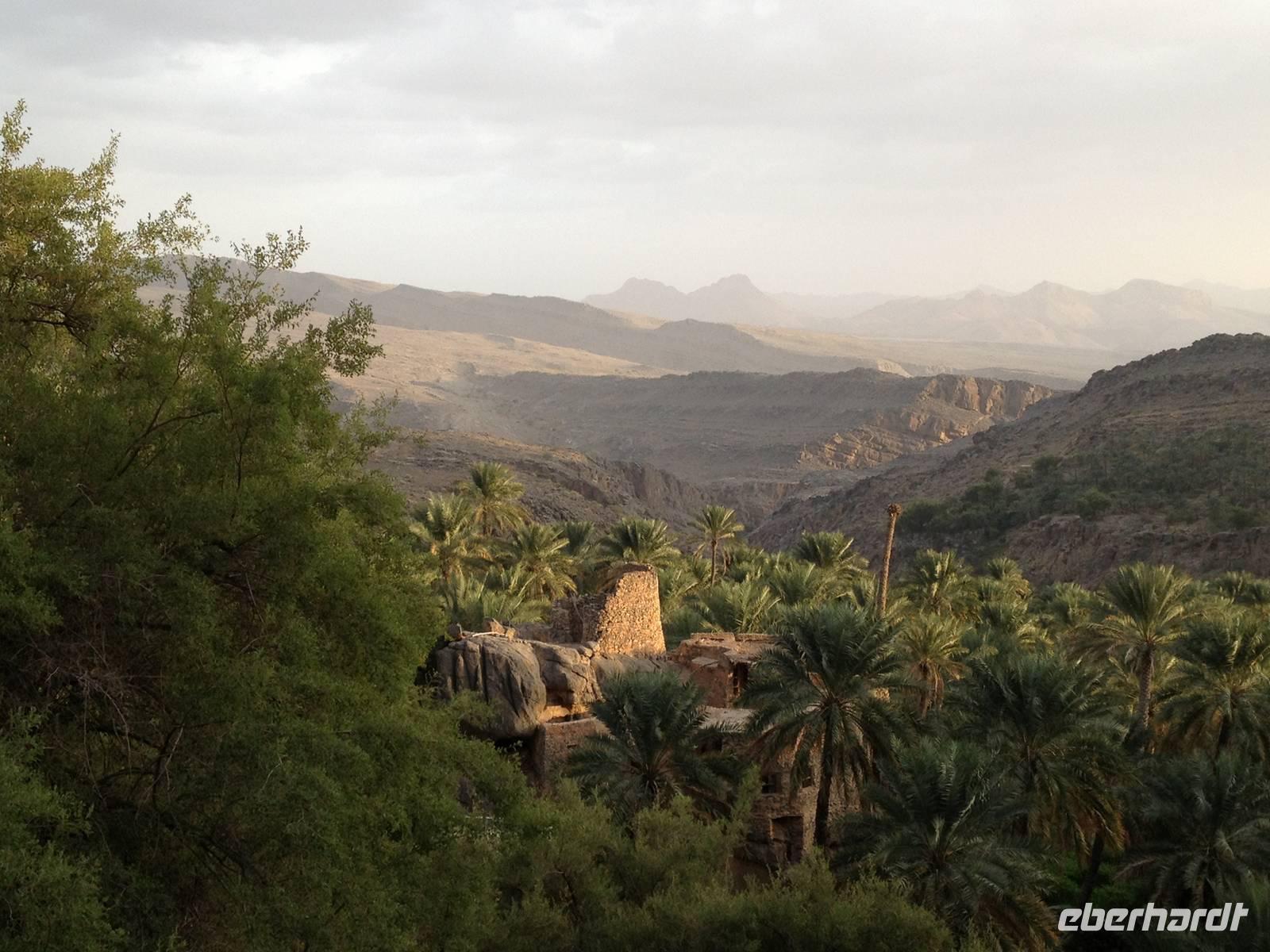 Das Bergdorf Misfah war unser letzter Programmpunkt für den heutigen Tag. Der alte Ortskern ist vollständig aus Natursteinen errichtet, und ein Rundgang durch die engen Gassen führte uns zu den am Steilhang entlang führenden Falaj-Kanälen, die die kunstvoll angelegten, kleinen Gartenparzellen bewässern. Steile Stufen verbinden Misfahs übereinander geschachtelte Steinhäuser. Wie ein Garten Eden breiten sich rings um den Ort terrassenartige Dattelpalmengärten und Plantagen aus.