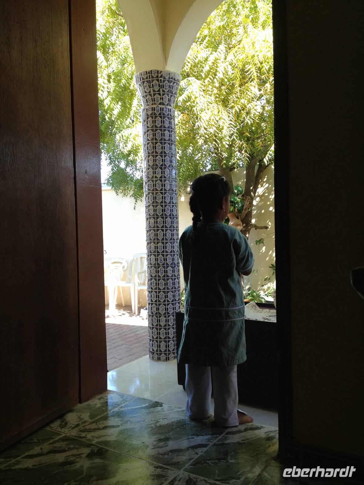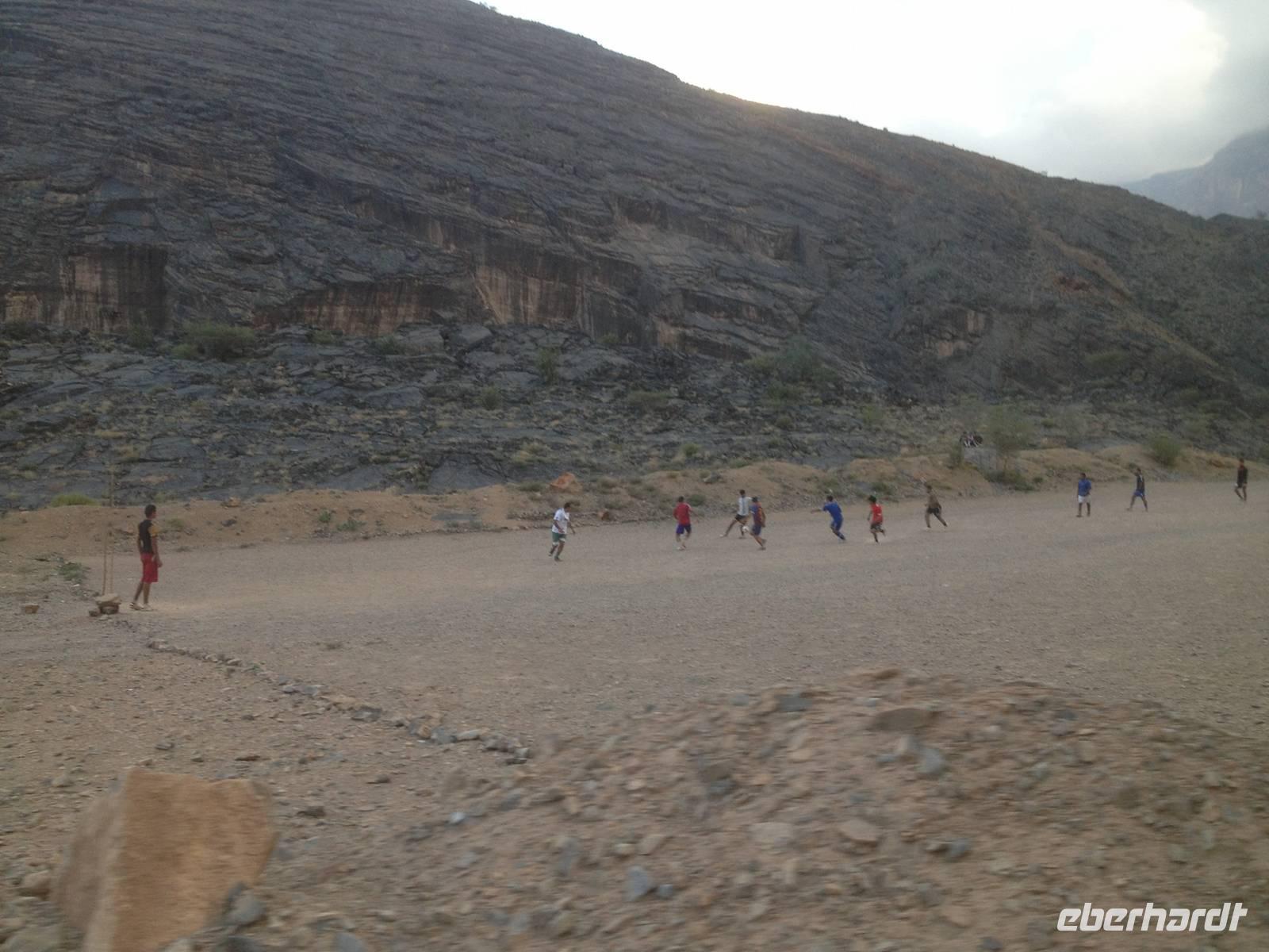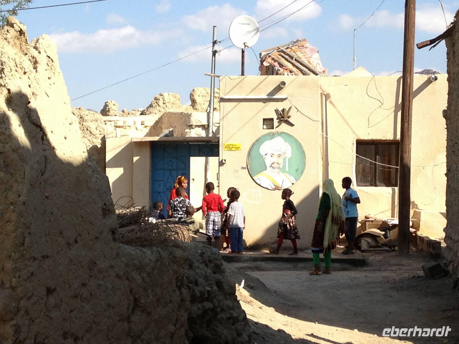 Ganz in der Nähe von Ibra, dem ehemaligen Zentrum des Handels, der Religion, Bildung sowie Kunst und gleichzeitig eine der ältesten Städte des Landes, haben wir eine Überraschung. Die Jeeps fuhren durch ein Wohngebiet, Schulkinder tummelten sich am Straßenrand und winkten uns mit strahlenden Augen zu. An einem unscheinbaren Haus hielten wir und Bharat bat uns, auszusteigen. Nun die Überraschung: Wir durften heute ein Omani-Haus betreten und wurden sogar von der Frau des Hauses bekocht! Wir wurden herzlich von den Kindern des Hauses begrüßt. Ganz wie es die Tradition verlangt, saßen Frauen und Männer getrennt. Wir machen es uns in den sogenannten Majlis gemütlich, bekamen Omani-Kaffe, Datteln und die traditionelle Süßspeise halwa, mit Butterschmalz karamellisierter Zucker und Stärke, geschmacklich verfeinert mit Safran und Kardamom. Gekocht wird es in riesigen Kupferbottichen über offenem Feuer. Was auf dem Tisch jedenfalls nicht fehlen darf ist Reis. Er ist das wichtigste Grundnahrungsmittel der Omanis. Mit etwas Rohkostsalat, Gemüse, und gebratenem Huhn bekamen wir ihn als Biriani gereicht. Zum Abschluss gab es frischen Tee.