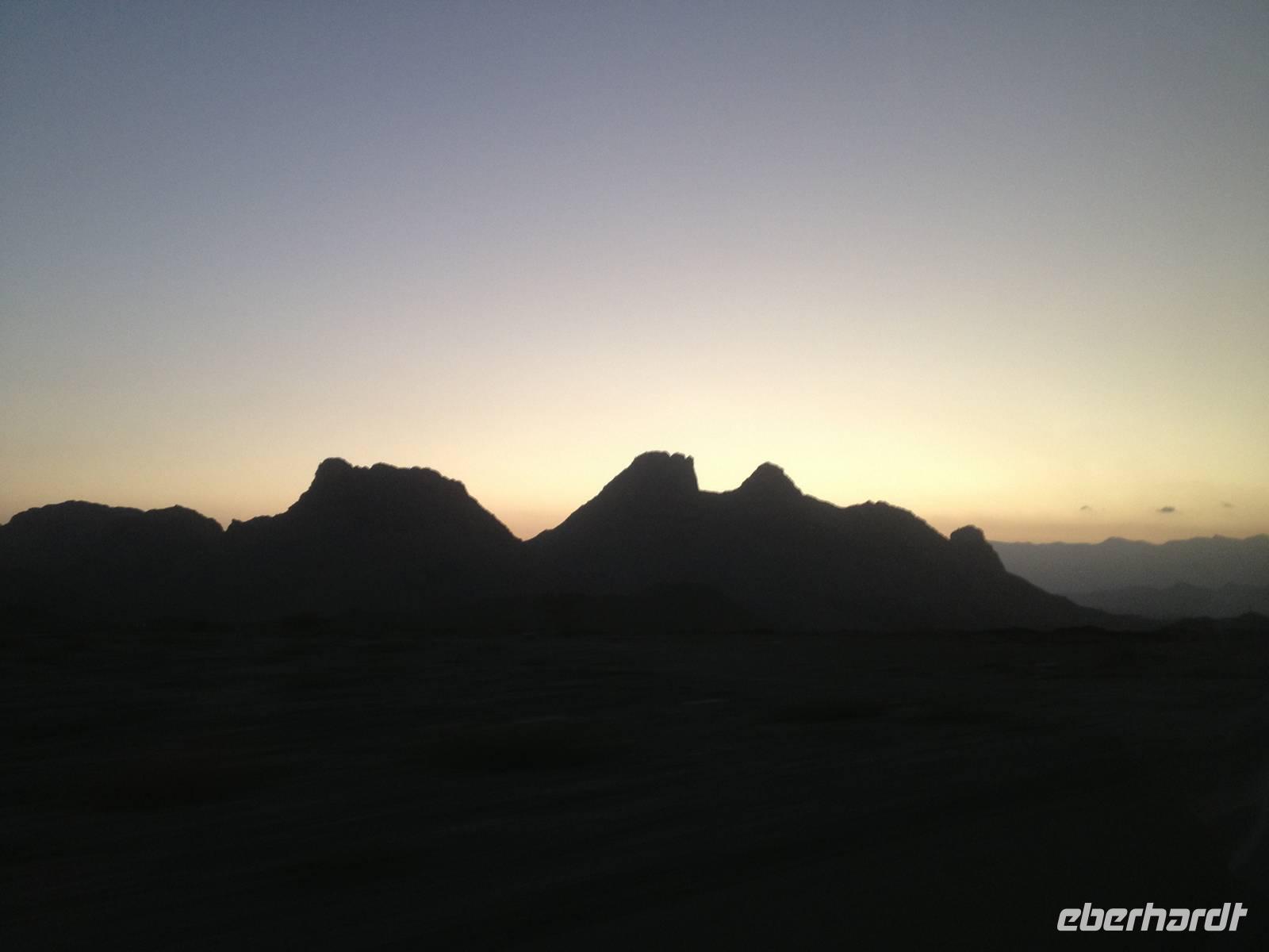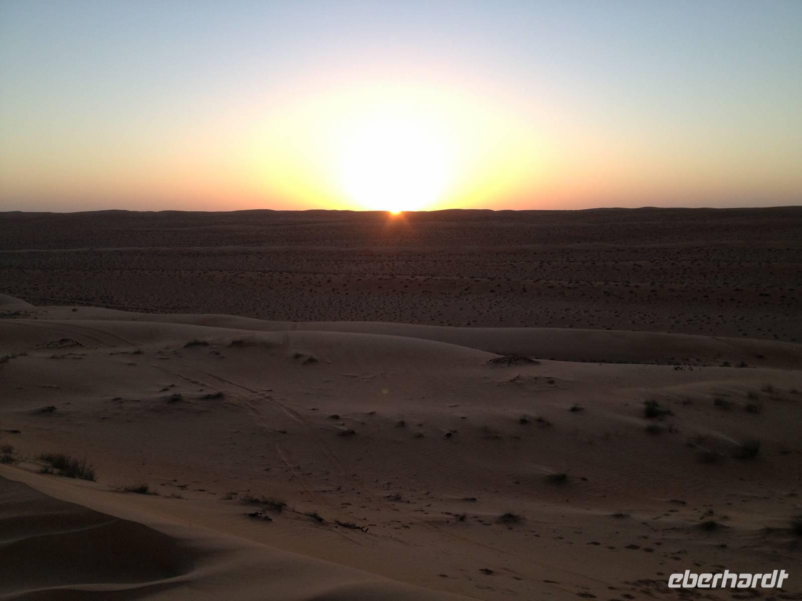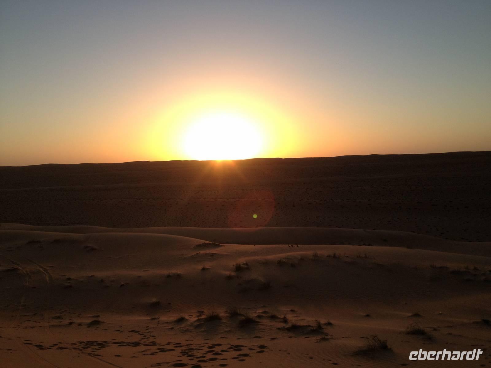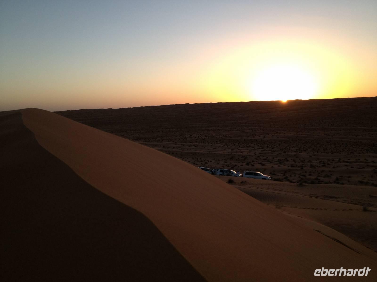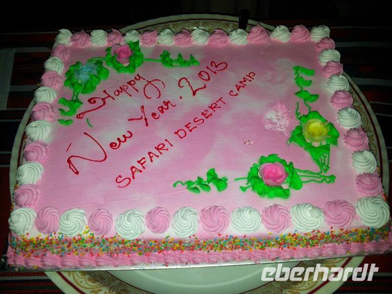 Nun ging es wieder quer durch die bizarre Landschaft der weiten Wüste zurück. Nach dem wunderschönen Sonnenuntergang fuhren wir zurück zum Camp. Nach dem Abendessen saßen wir in einer geselligen Runde und ließen das Jahr gemütlich ausklingen. Zu gemütlich. Aber wir mussten uns der Gepflogenheiten der Omanis anpassen. Denn im Oman ist Silvester wie jeder andere Tag im Jahr. Der Camp-Chef schnitt gemeinsam mit unserer Christa den Neujahrskuchen an und die Raketen wurden gezündet. Allerdings schon gegen 22:30 Uhr. Wir ließen uns aber die Laune nicht vermiesen und vertrieben uns die Zeit bis Mitternacht mit selbst gesungenen Liedern und Witzen Danke Monika und Christa! Dann ließen wir pünktlich um Mitternacht die Korken knallen und feierten unter dem traumhaften Sternenhimmel ins neue Jahr! Willkommen im Jahr 2013!