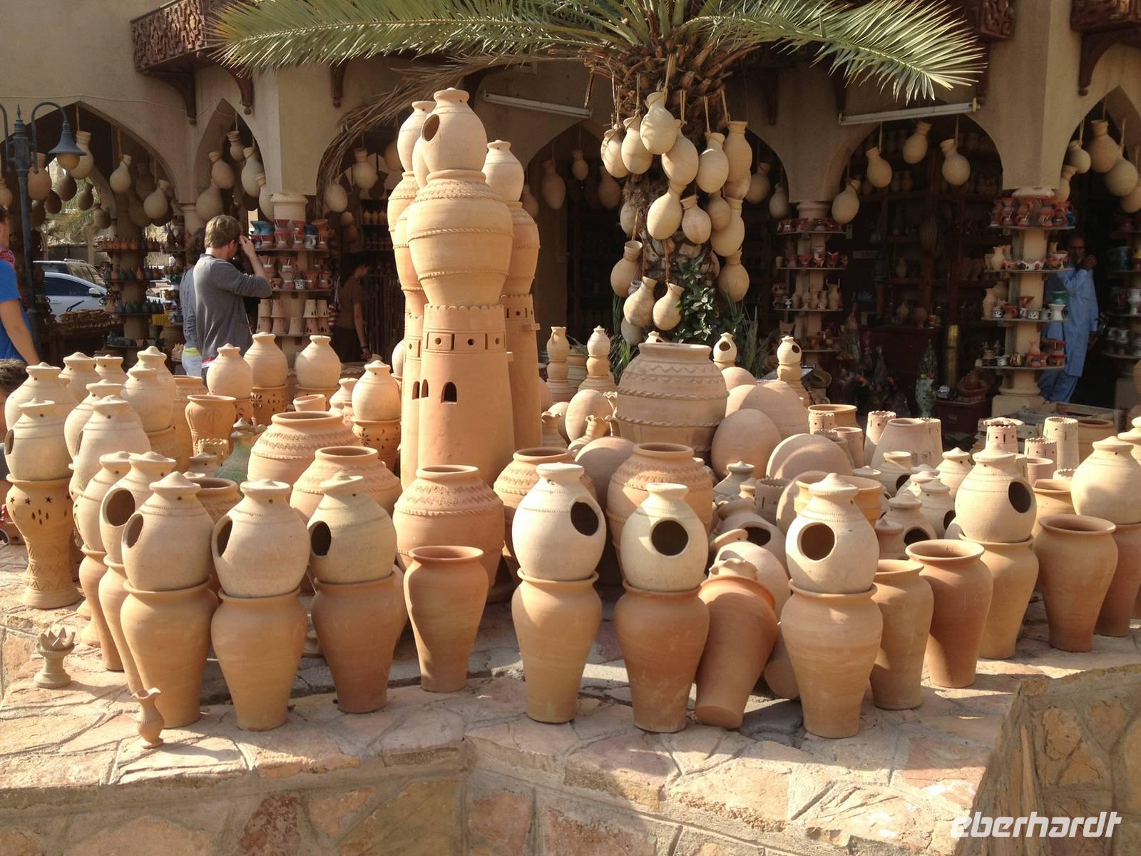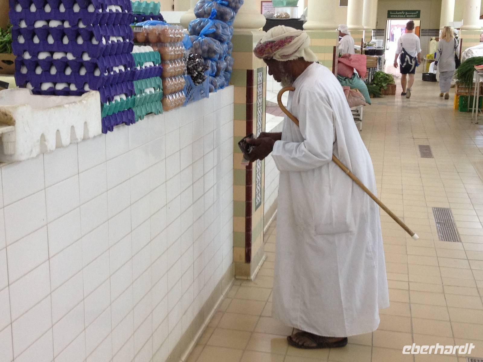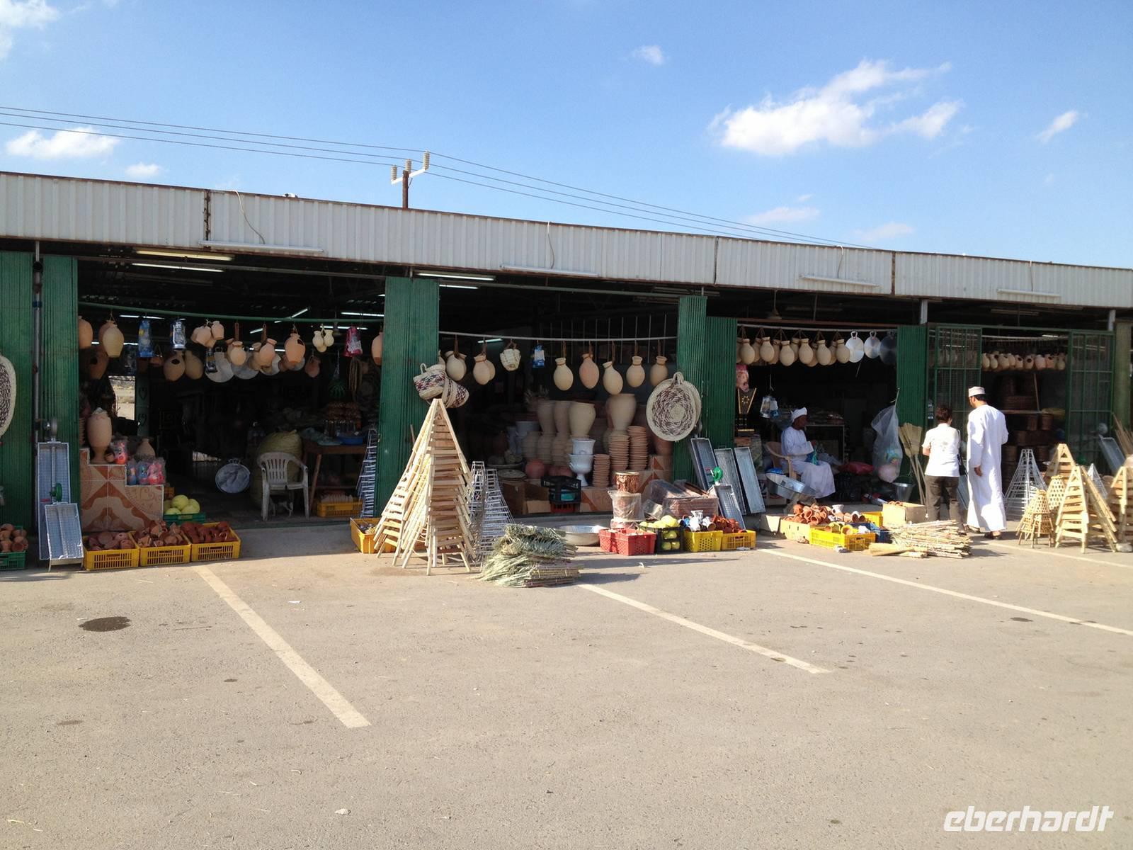 Blitzschnell und sicher griff sich der alte Mann mit dem Krummdolch am Gürtel den Ziegenbock. Er beklopfte die Rippen und begutachtete das Gemächt des Tiers. Nach kurzem Feilschen war der Deal perfekt. Lautstark wurden auch Schafe und Kühe zum Kauf angeboten. Solche Szenen erlebten wir auf dem traditionellen Viehmarkt in Nizwa am Freitagmorgen. In der Mitte des Platzes vor dem neuen Souq versammeln sich Menschen, lassen jedoch eine kreisförmige Gasse von ca. 5 m Breite frei, in der die Verkäufer ihre Tiere rundführen und die Käufer sich die Tiere aussuchen, die sie befühlen und untersuchen möchten. Erst danach tritt man in die ersten Verkaufsverhandlungen ein. Dieses Vorgeplänkel findet ohne die Frauen statt. Erst wenn es um den endgültigen Preis geht, werden die Frauen aktiv. Sie haben das Sagen und treffen die Entscheidung. Nizwa war und ist geistiges Zentrum der Ibadiyah, der toleranten omanisch-islamischen Rechtsschule, aber auch des Silberschmiedehandwerks. Der Gemüse-, Gewürz- und Handwerkersouk gewährte uns wieder beeindruckende Einblicke in die hiesigen Traditionen. Bharat war im Gewürzladen ein super Berater, denn hier gab es eine große Auswahl an bekannten aber auch neuen, unbekannten Gewürzen.