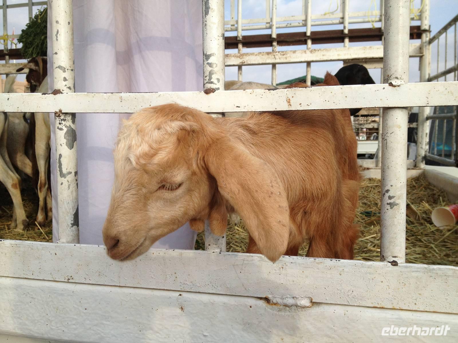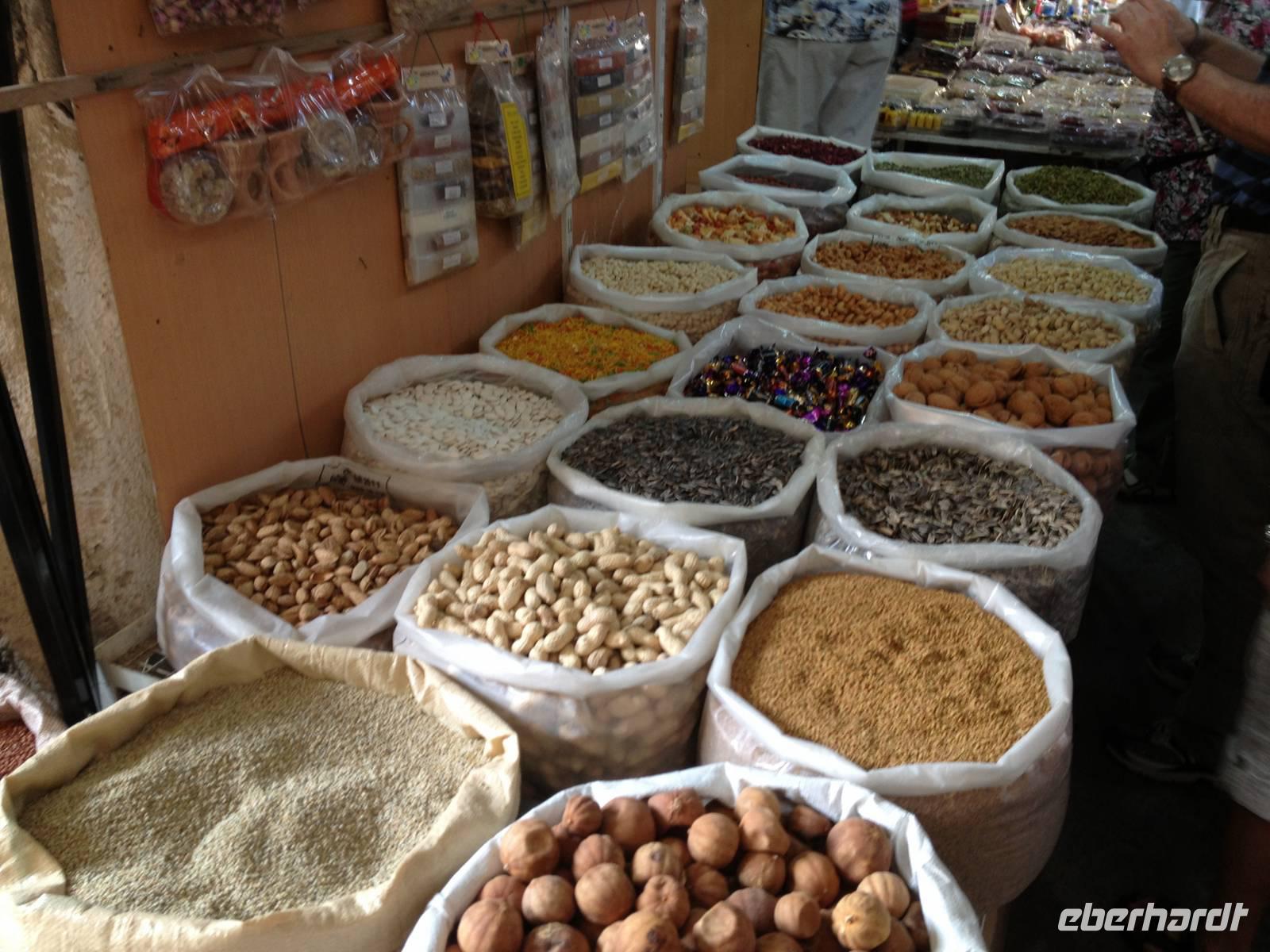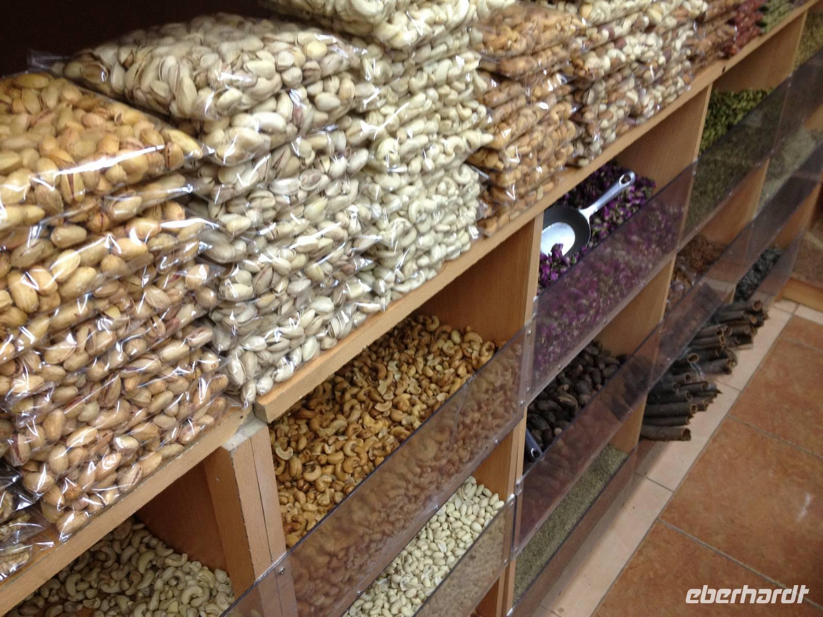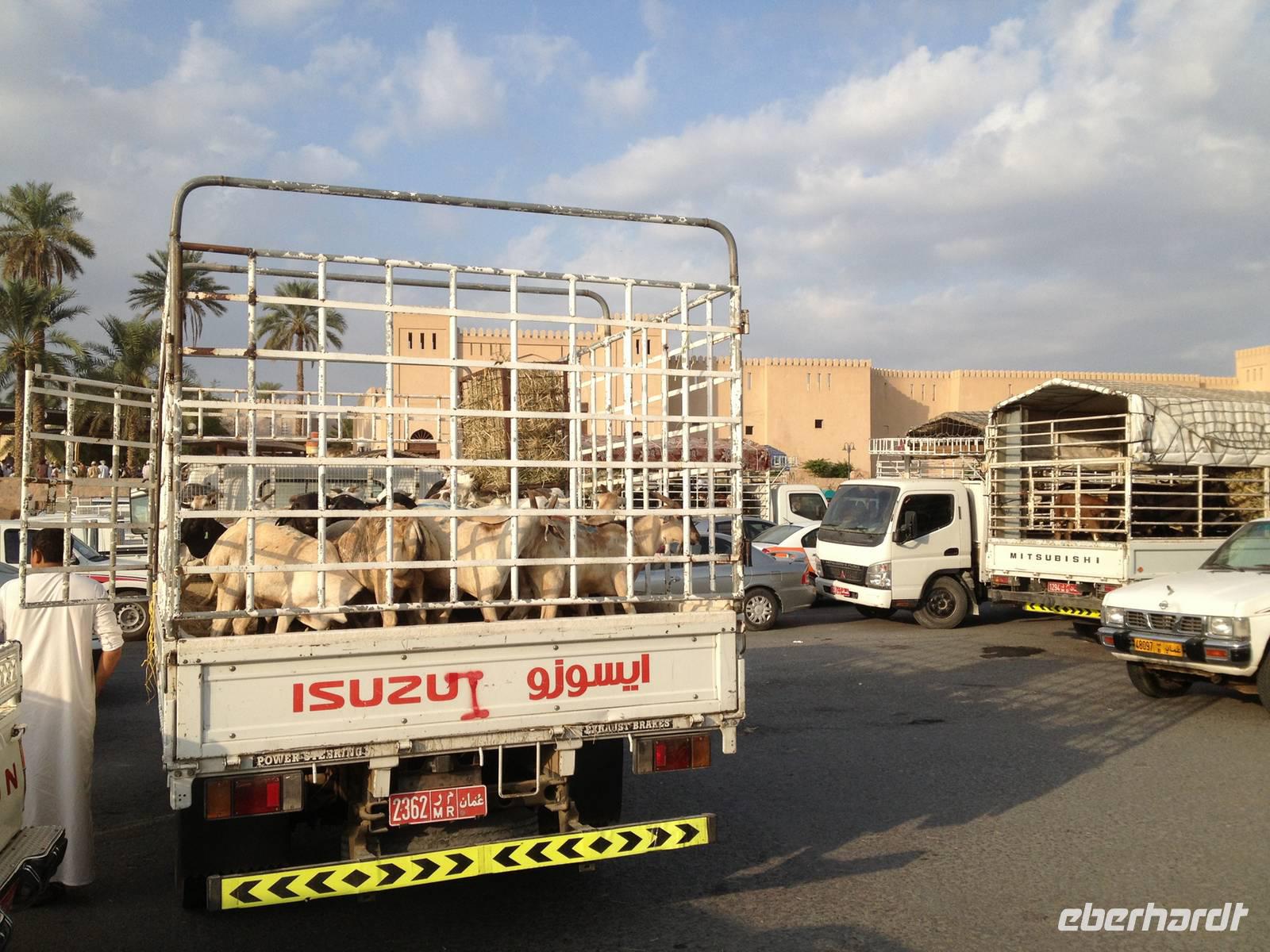 Blitzschnell und sicher griff sich der alte Mann mit dem Krummdolch am Gürtel den Ziegenbock. Er beklopfte die Rippen und begutachtete das Gemächt des Tiers. Nach kurzem Feilschen war der Deal perfekt. Lautstark wurden auch Schafe und Kühe zum Kauf angeboten. Solche Szenen erlebten wir auf dem traditionellen Viehmarkt in Nizwa am Freitagmorgen. In der Mitte des Platzes vor dem neuen Souq versammeln sich Menschen, lassen jedoch eine kreisförmige Gasse von ca. 5 m Breite frei, in der die Verkäufer ihre Tiere rundführen und die Käufer sich die Tiere aussuchen, die sie befühlen und untersuchen möchten. Erst danach tritt man in die ersten Verkaufsverhandlungen ein. Dieses Vorgeplänkel findet ohne die Frauen statt. Erst wenn es um den endgültigen Preis geht, werden die Frauen aktiv. Sie haben das Sagen und treffen die Entscheidung. Nizwa war und ist geistiges Zentrum der Ibadiyah, der toleranten omanisch-islamischen Rechtsschule, aber auch des Silberschmiedehandwerks. Der Gemüse-, Gewürz- und Handwerkersouk gewährte uns wieder beeindruckende Einblicke in die hiesigen Traditionen. Bharat war im Gewürzladen ein super Berater, denn hier gab es eine große Auswahl an bekannten aber auch neuen, unbekannten Gewürzen.
