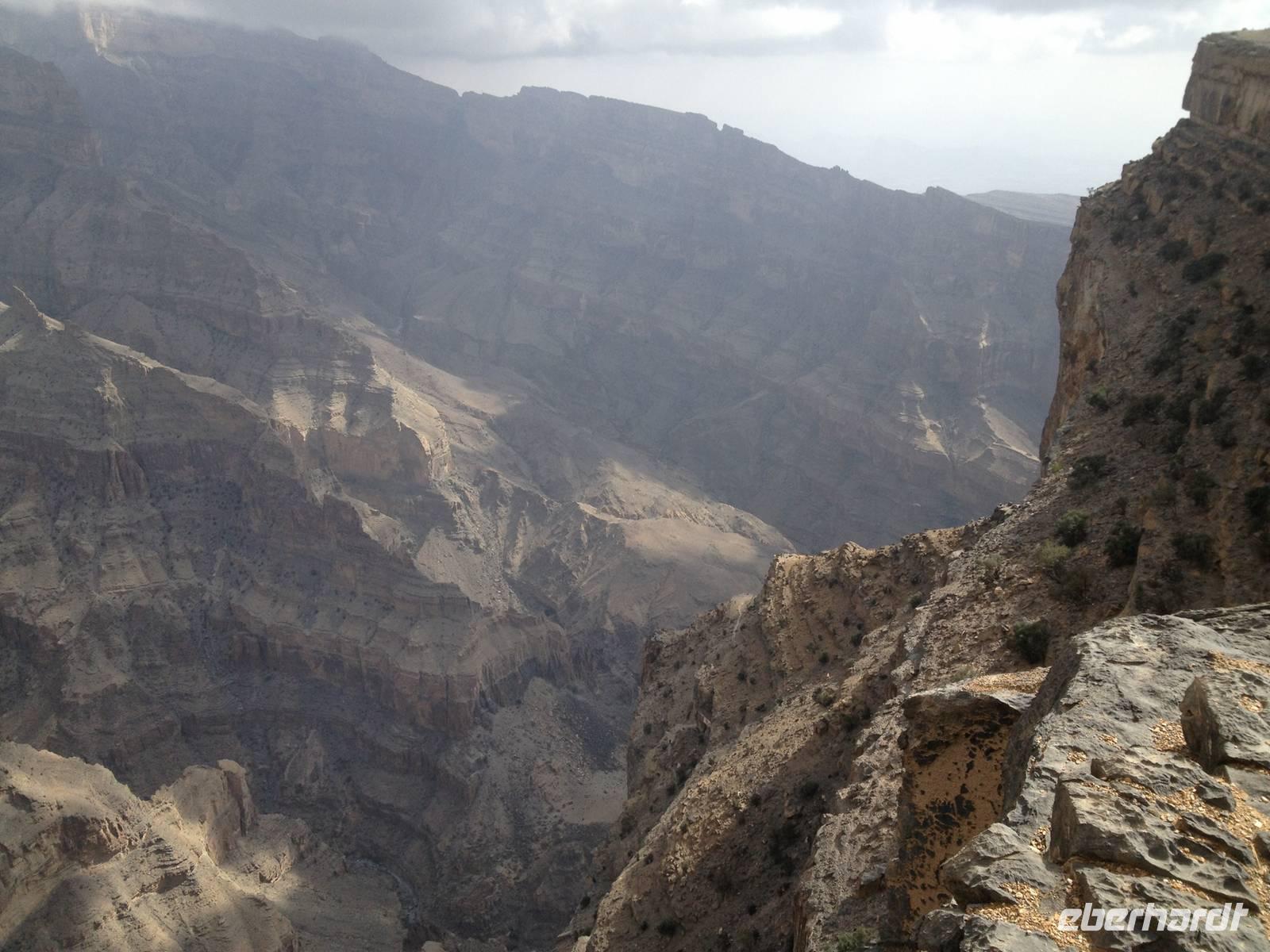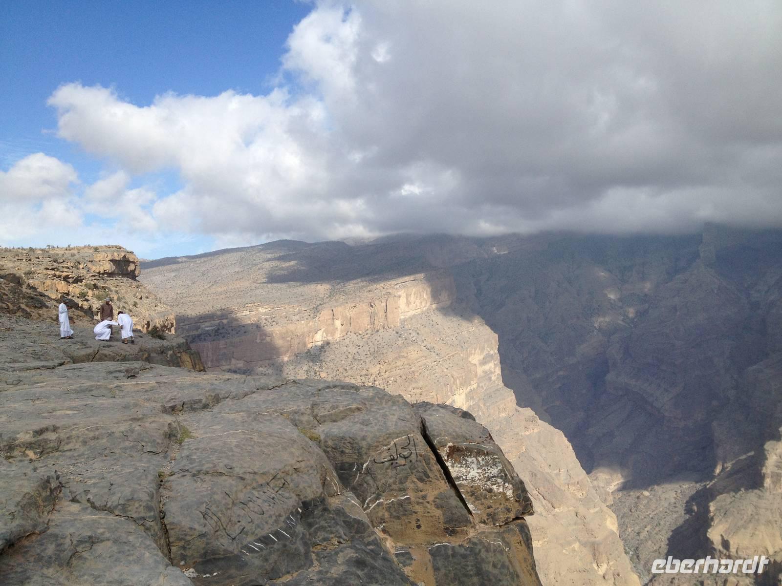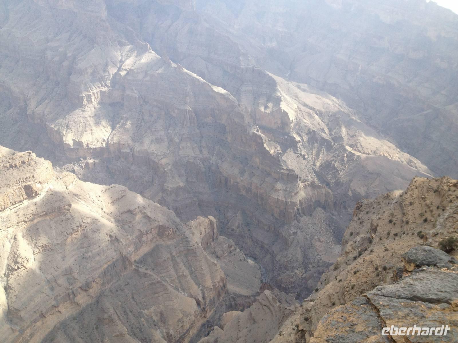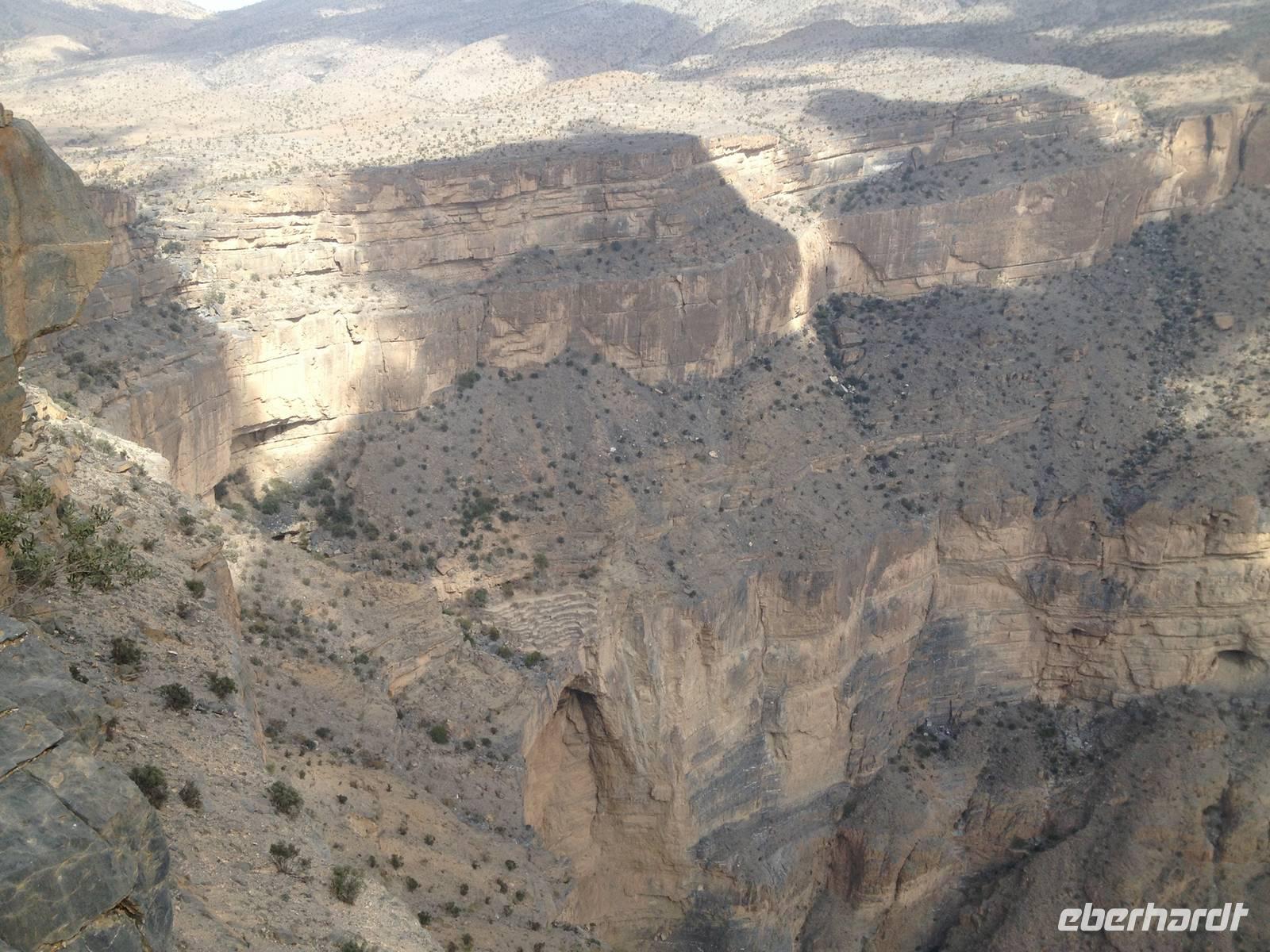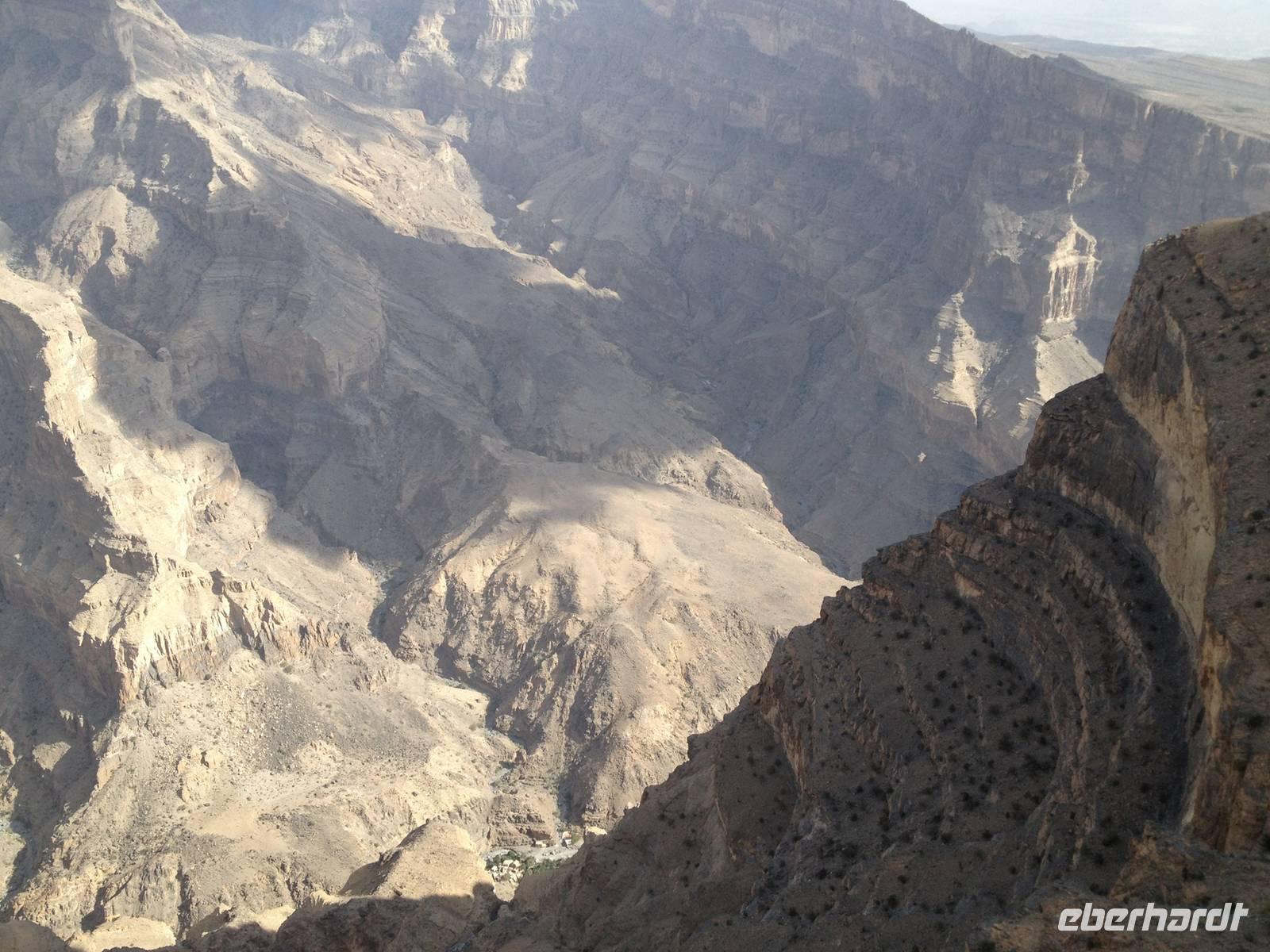 Von Weitem konnten wir schon den Ort Al-Hamra („die Rote") erblicken. Er markiert den Eingang zum Wadi Ghul und zur "Mutter aller Schluchten". Bis zu 20 Kilometer schneidet das Wadi ins Bergmassiv des Jabal Shams hinein. Wir nehmen die staubige Schotterpiste, die sich mit unzähligen Serpentinen auf den 3.009 Meter hohen Jabal Shams hinaufschraubt. Nirgends lässt sich der Querschnitt durch alle Gesteinsschichten der Erde so leicht erkennen wie hier in diesem spektakulären Gebirge! Die Fahrt auf das Hochplateau war wieder einzigartig. Oben angekommen, hatten wir einen fantastischen Rundumblick auf die Bergwelt und vor allem in die 1000 Meter tiefe Wadi-Nakhar-Schlucht, die man durchaus mit dem Grand Canyon der USA vergleichen kann. Wahnsinn! Fast 1.000 Meter tief ist diese Schlucht und zwei, drei isoliert lebende Familien bewirtschaften die kleine Fluss-Oase am Ende der Schlucht. Hierher kommen die Einheimischen gerne zur Abkühlung in den heißen Sommermonaten zum picknicken und zelten. Zum Mittagessen kehrten wir ins Jabal Shams Resort ein und ließen uns die arabische Küche in luftiger Höhe schmecken.