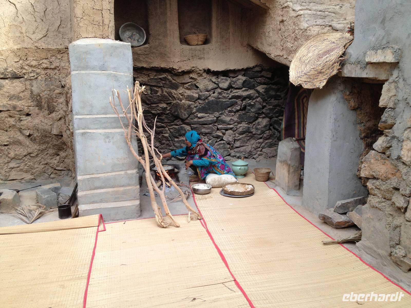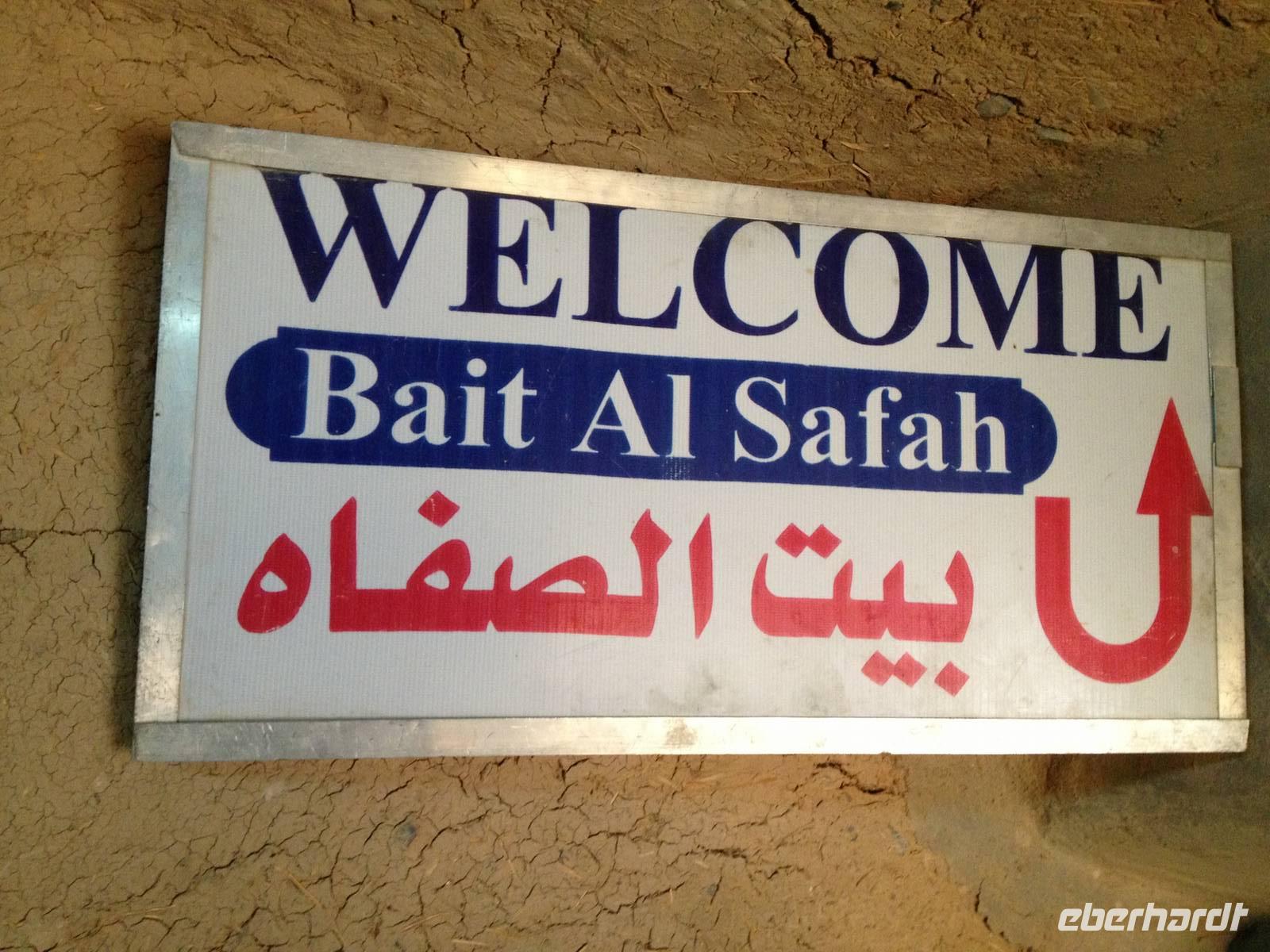 Schließlich erreichten wir wieder Al-Hamra. Die alte Lehmsiedlung von al-Hamra ist inzwischen fast vollständig verlassen. Die Ruinen der aus rötlicher Erde errichteten Häuser verfallen leider immer mehr. Wir besuchten das Bait al Safah. Ein typisches Lehmhaus, in dem wir am Leben der einheimischen Menschen teilnahmen. Frauen pressten Öl aus Datteln, mahlten Mehl und buken daraus hauchdünne Fladen, rösteten Kaffeebohnen und wir bekamen erklärt, wie schwer es ist einen Teppich zu weben. Unsere Christa war so begeistert und legte kurzum einen arabischen Tanz auf's Parkett Bewirtet wurden wir im traditionellen Majlis (Gästezimmer) mit Tee und dem typischen omanischen Kardamomkaffee und Datteln.
