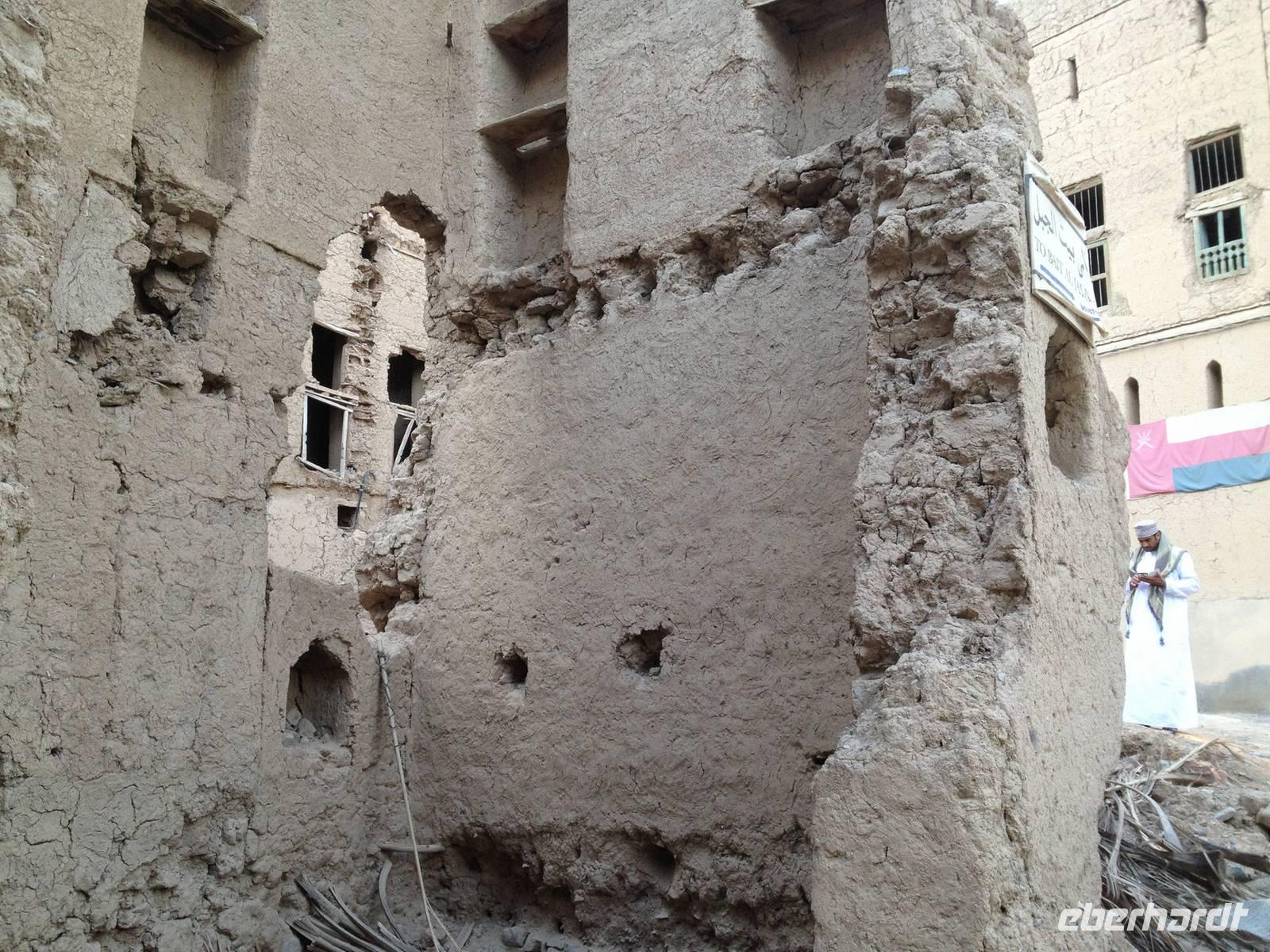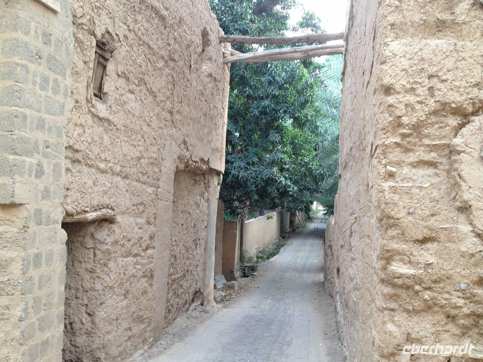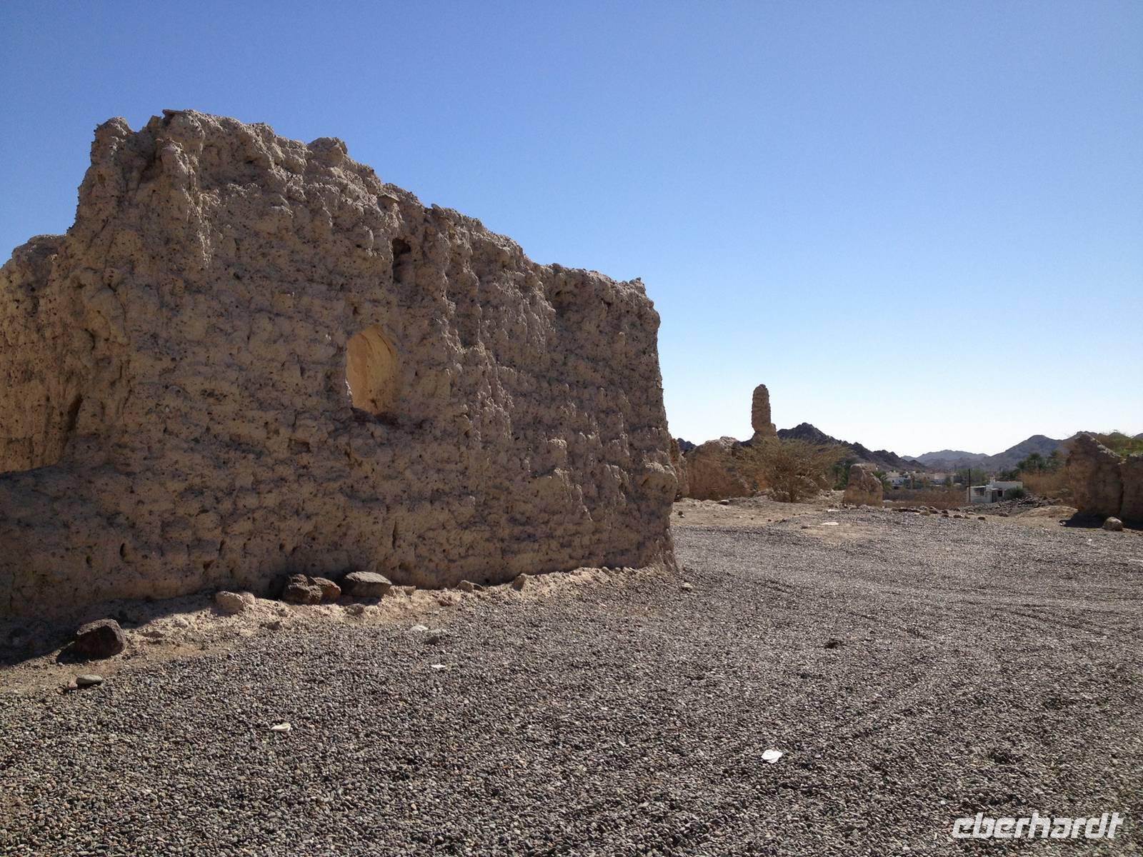 Schon von weitem sahen wir die Wachtürme auf einem kleinen Hügel, um den sich der Ort Al Mudayrib ausbreitet. Al-Mudayrib hat sich viel von seinem Erscheinungsbild und seiner Atmosphäre bewahrt. Der historische Ortskern ist umgeben von kleinen Hügeln mit weithin sichtbaren Wachtürmen. Inmitten der Senke gruppieren sich die kleinen Häuser. Die ältesten noch erhaltenen Gebäude al-Mudayribs stammen aus dem 18. Jahrhundert. Der vergleichsweise gute Zustand ihres Mauerwerks ist der soliden Bauweise zu verdanken: die Steine wurden mit einer Mischung aus Lehm und Gips verbunden.