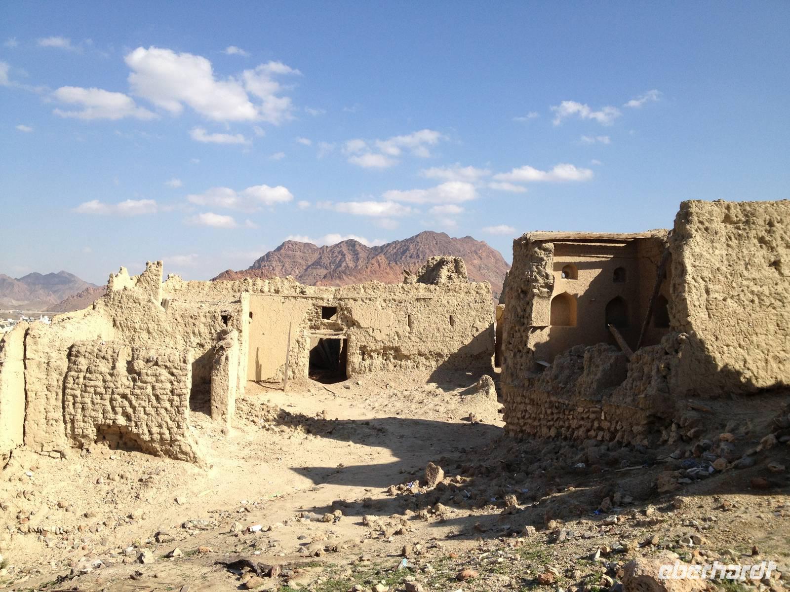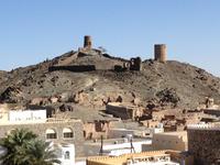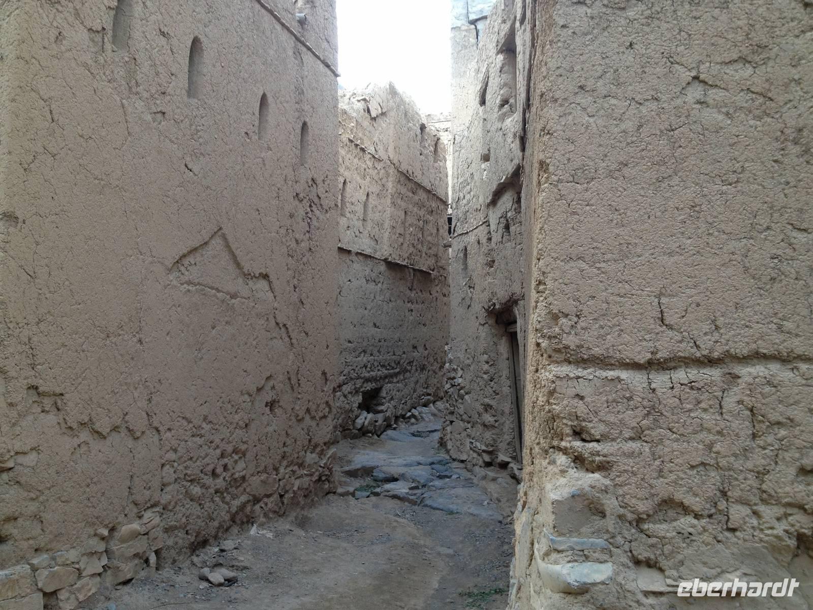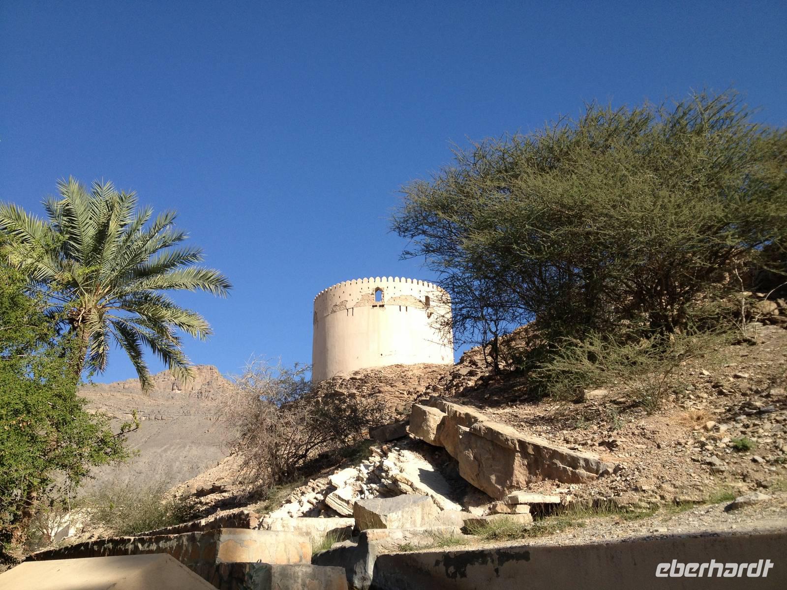 Schon von weitem sahen wir die Wachtürme auf einem kleinen Hügel, um den sich der Ort Al Mudayrib ausbreitet. Al-Mudayrib hat sich viel von seinem Erscheinungsbild und seiner Atmosphäre bewahrt. Der historische Ortskern ist umgeben von kleinen Hügeln mit weithin sichtbaren Wachtürmen. Inmitten der Senke gruppieren sich die kleinen Häuser. Die ältesten noch erhaltenen Gebäude al-Mudayribs stammen aus dem 18. Jahrhundert. Der vergleichsweise gute Zustand ihres Mauerwerks ist der soliden Bauweise zu verdanken: die Steine wurden mit einer Mischung aus Lehm und Gips verbunden.