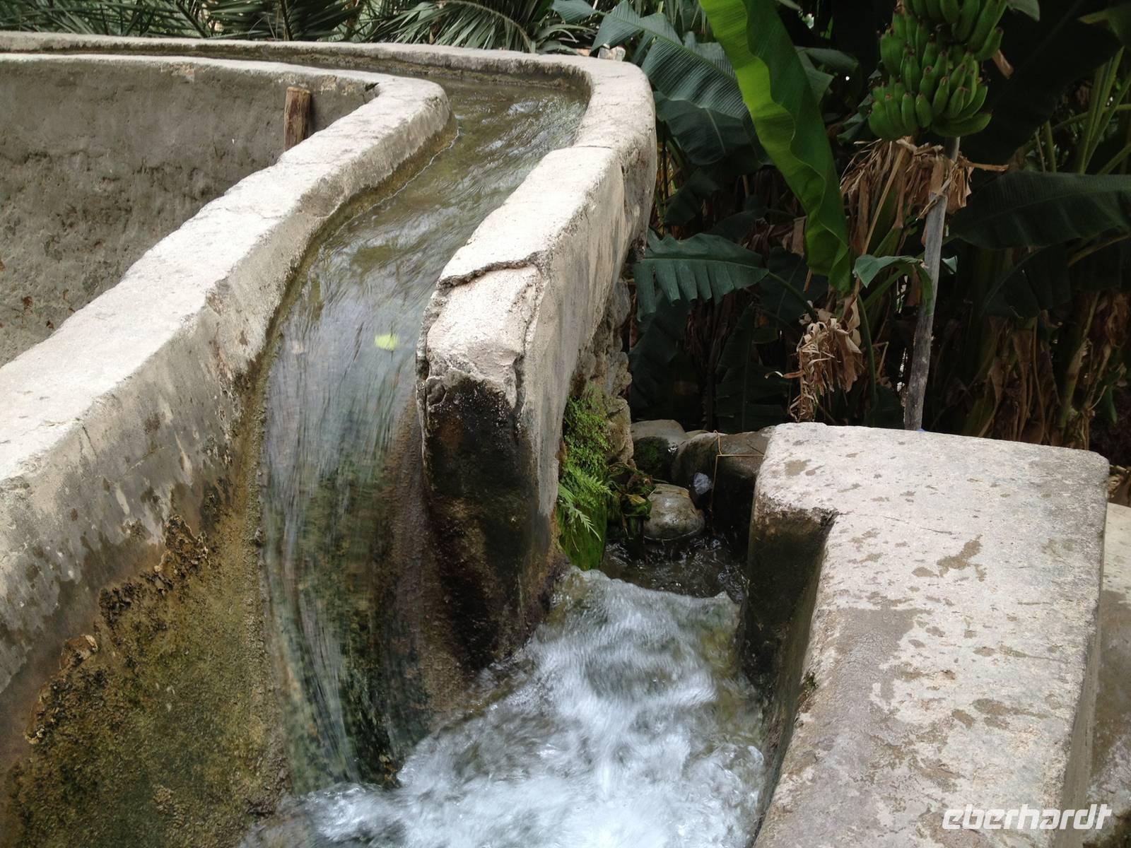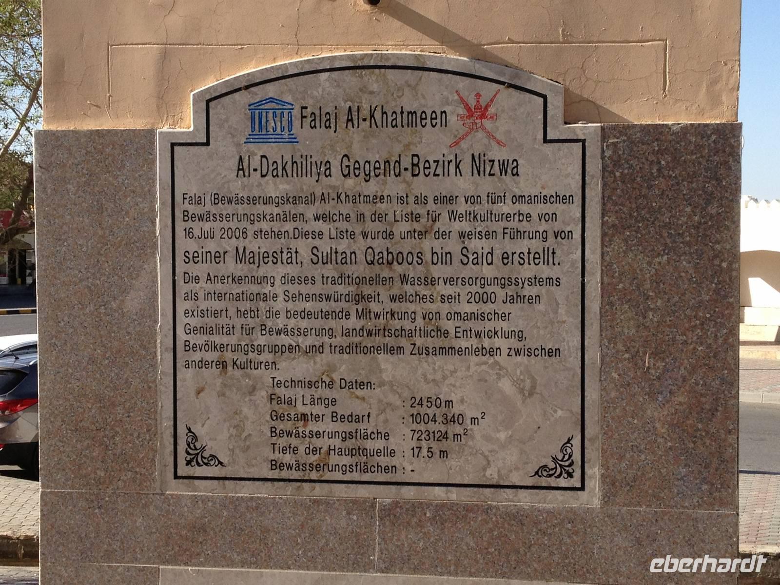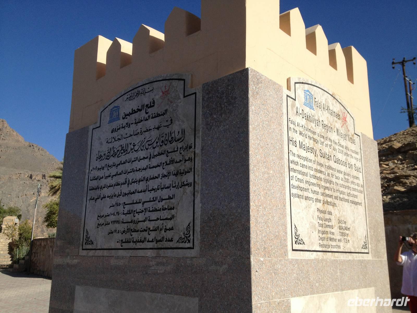Insgesamt durchzieht die unwegsame Bergwelt Omans ein dichtes Netz von über 2000 Wasserkanäle und lässt so sozusagen im "Nichts " kleine grüne Paradiese entstehen. Wir haben uns auf unserer Reise bereits einige dieser Paradiese angeschaut und staunten nicht schlecht. Die ältesten dieser "falaj " sind fast 2000 Jahre alt. Teilweise verlaufen sie viele Kilometer unter der Erde entlang oder überqueren Täler mit Aquädukten. Alles ist eine technische Meisterleistung. Dies wurde gewürdigt, indem man im Jahre 2006 insgesamt 5 solcher omanischen "falaj" in die Liste der UNESCO -Weltkuturerbe aufgenommen hat. Der Sultan Qaboos bin Said ist mächtig stolz darauf!
