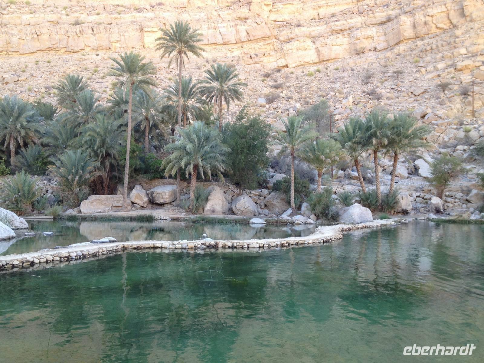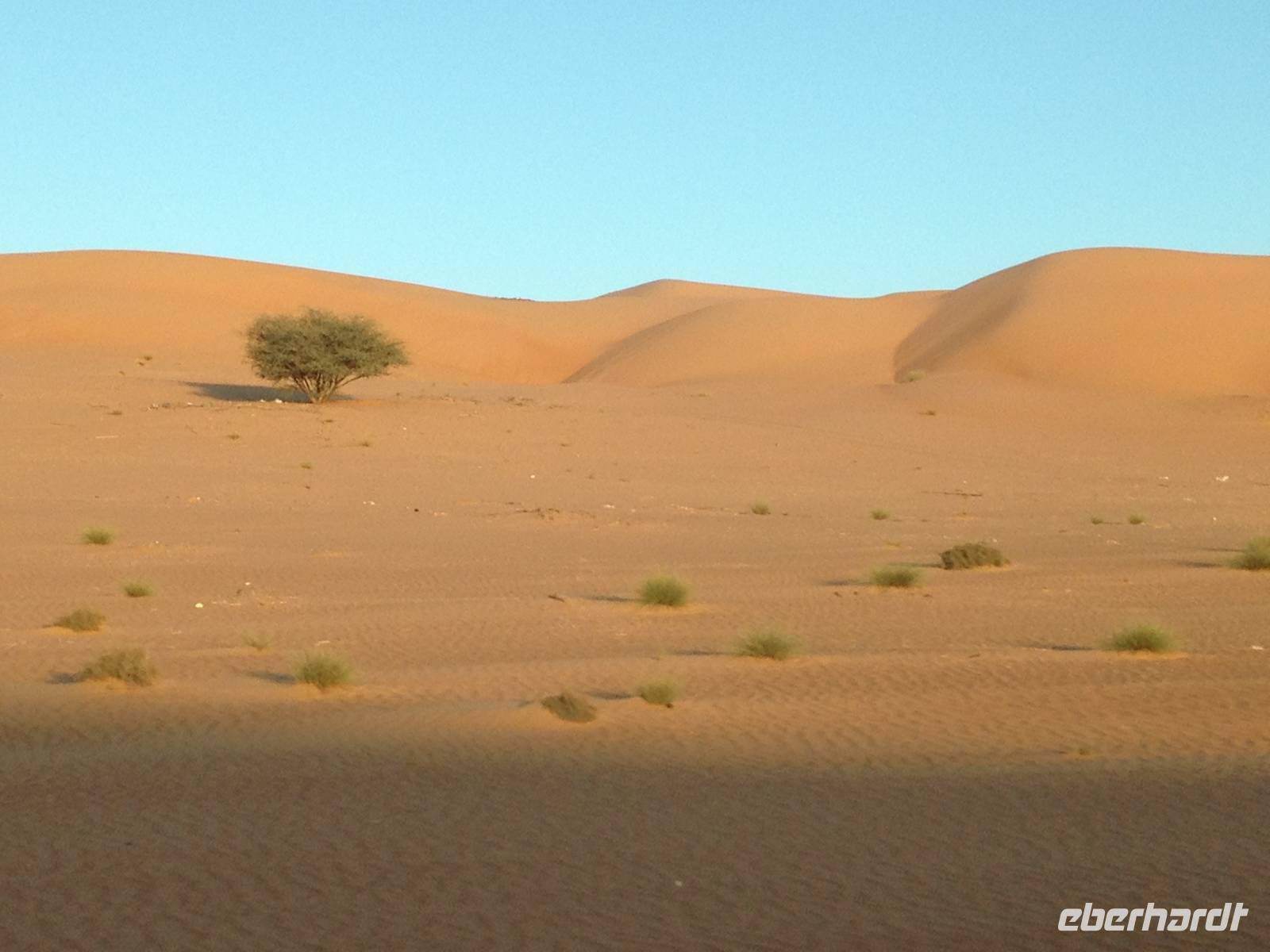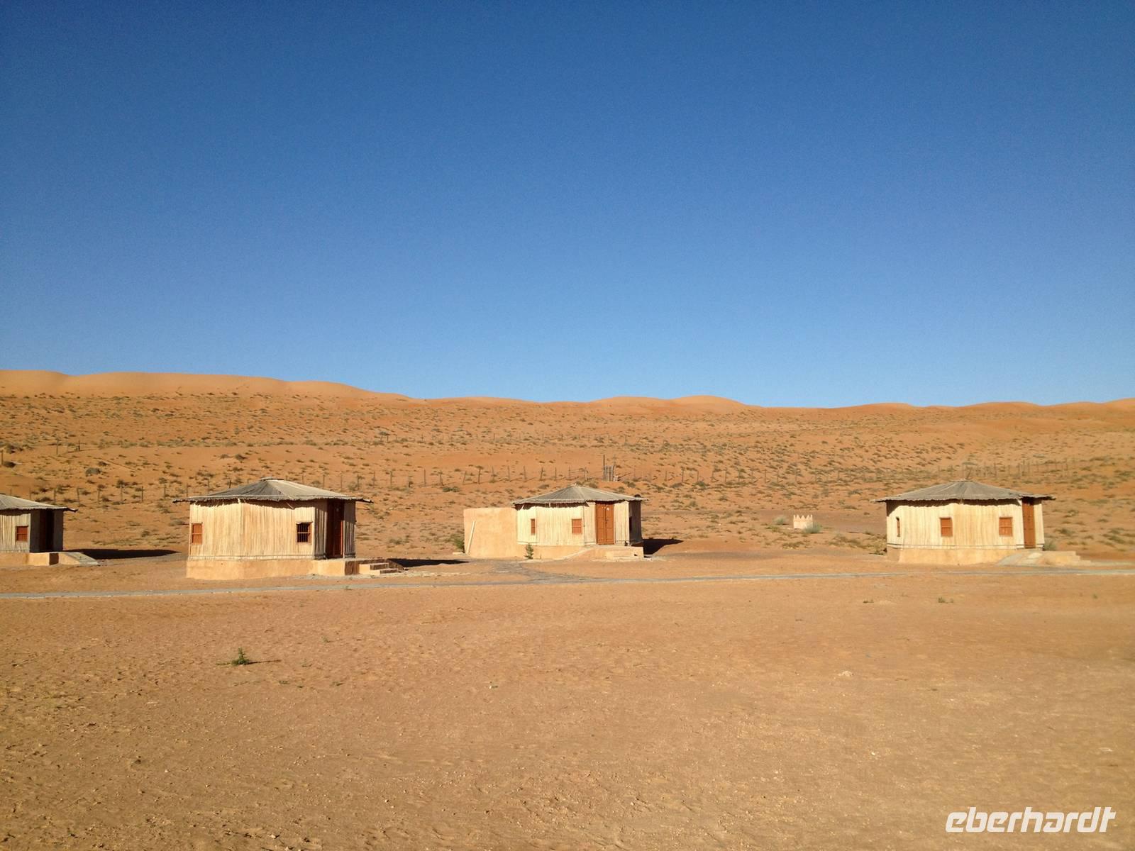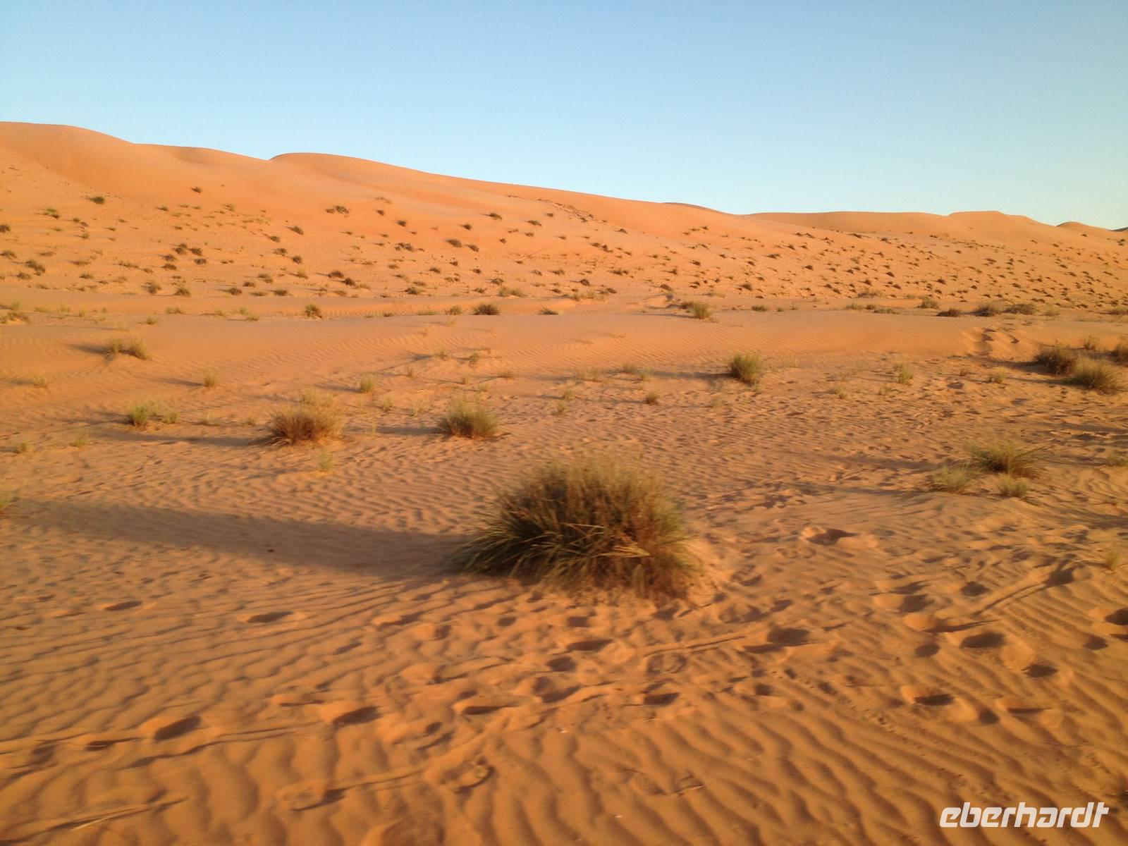Am Rande der Wahiba-Wüste in der Ortschaft Bidiyyah zweigte eine kleine Straße links ab. Es ging steil hinauf. Ein paar Häuser am Wegesrand, plötzlich immer mehr Palmen, ein ganzer Wald auf einmal. Hier muss Wasser sein, aber es war nur ein Rinnsal zu sehen. Das Rinnsal ist ein Wadi, ein Flusslauf, der mehrmals im Jahr austrocknet. Das Wadi Bani Khalid verwandelt sich viermal im Jahr vom Rinnsal zu einem reißenden Strom. Dann ist es sogar nicht ganz ungefährlich, mit dem Auto eine der Furten zu queren. Normalerweise aber ist das Flussbett trocken und staubig. Wir stiegen aus und spazierten auf einem befestigten Weg und den Wasserkanälen weiter hinauf zur Quelle der Oase. Nach einer Viertelstunde öffnete sich das enge Tal und es empfing uns ein riesiger Teich mit smaragdgrünem Wasser: das Herz der Oase. Einige nutzen gleich die Gelegenheit, im herrlichen Wasser zu schwimmen. Leider viel zu schnell verging die Zeit und wir mussten weiter in Richtung Wüste. An einer Autowerkstatt ließen die Fahrer für die Durchquerung der Wahiba Sands etwas Luft aus den Reifen, damit sie im Sand griffiger wurden. Nach wenigen Kilometern waren wir in einer anderen Welt! Dunkelgelb bis rötlich leuchteten die Sanddünen im späten Abendlicht und die langen Schatten legten sich während des Sonnenuntergangs malerisch über die vom Wind geformten Dellen. Nach Einbruch der Dunkelheit erreichten wir das Safari Desert Camp inmitten der Wüste und bezogen unsere Hütten. Zum Abendessen saßen wir wie die Beduinen auf dem Boden und ließen den ersten Abend in einer Welt von Nichts ausklingen.