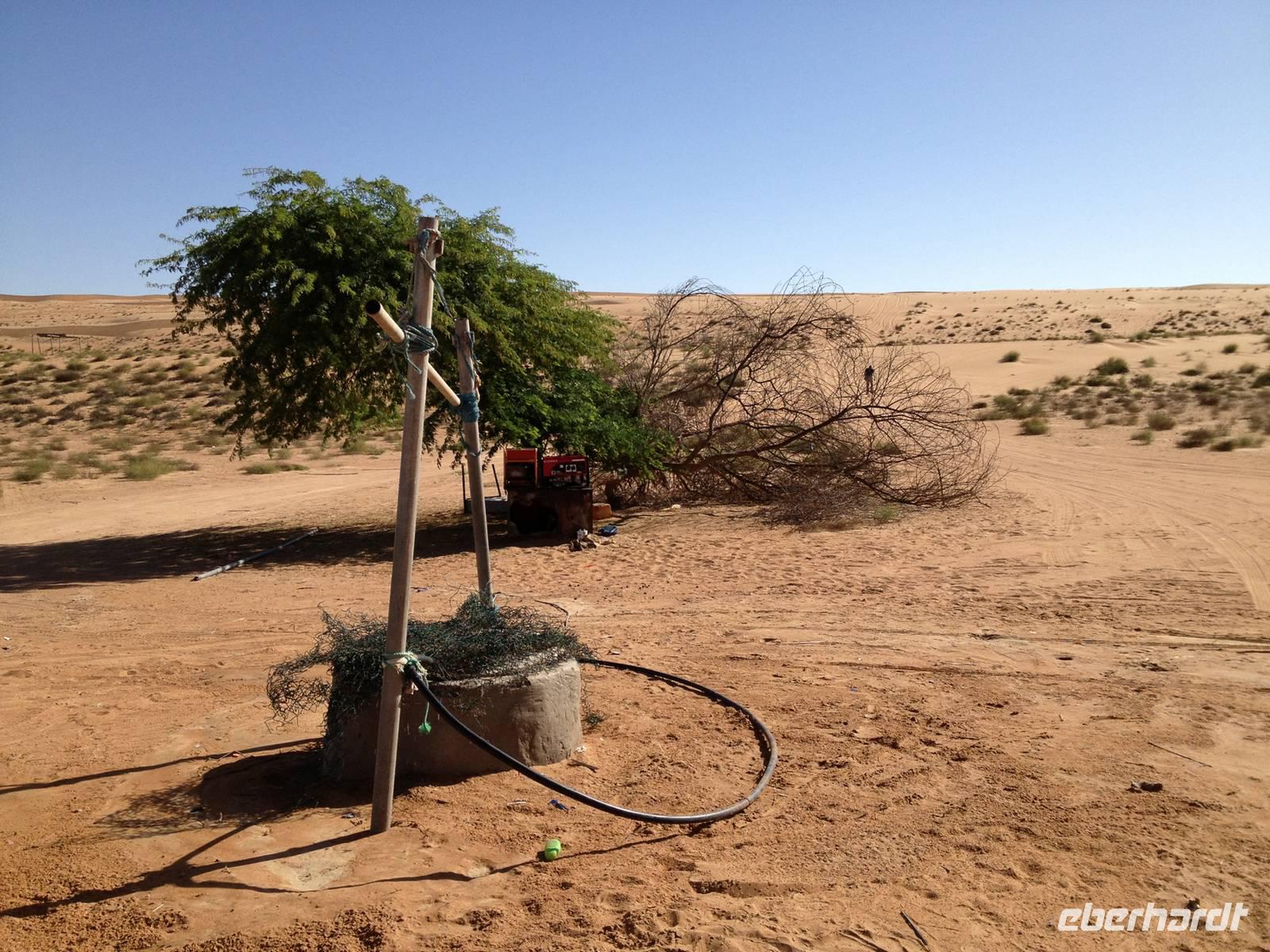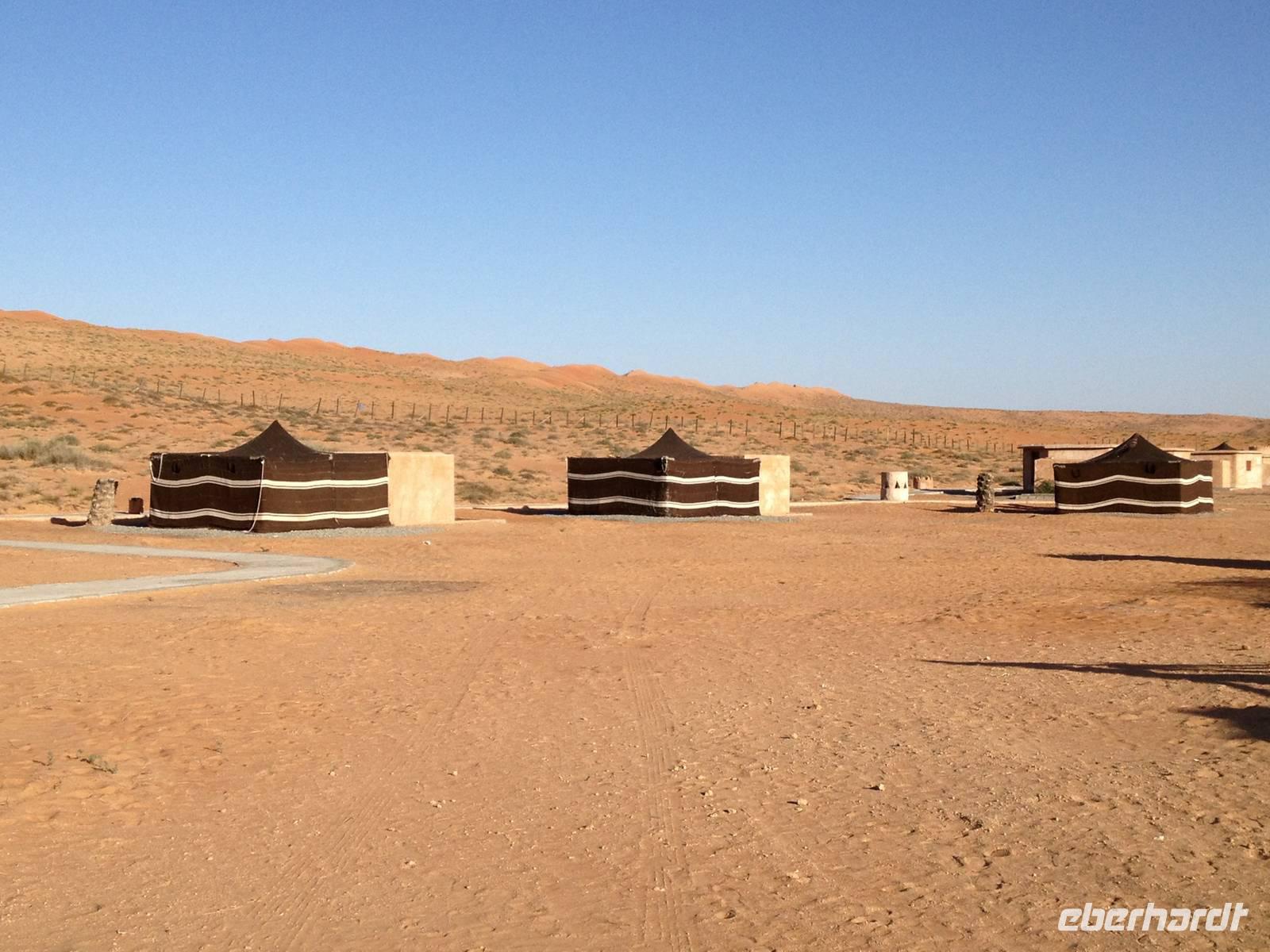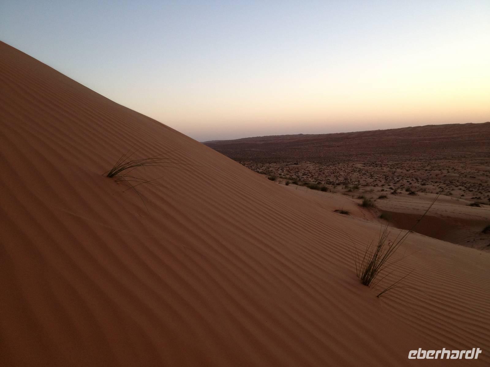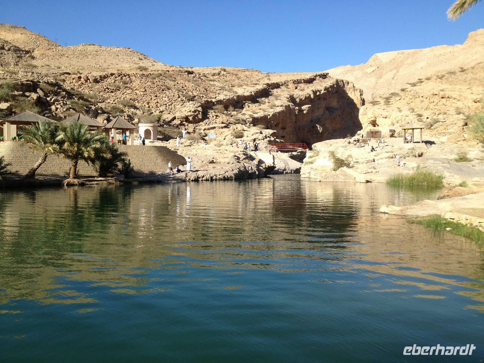 Am Rande der Wahiba-Wüste in der Ortschaft Bidiyyah zweigte eine kleine Straße links ab. Es ging steil hinauf. Ein paar Häuser am Wegesrand, plötzlich immer mehr Palmen, ein ganzer Wald auf einmal. Hier muss Wasser sein, aber es war nur ein Rinnsal zu sehen. Das Rinnsal ist ein Wadi, ein Flusslauf, der mehrmals im Jahr austrocknet. Das Wadi Bani Khalid verwandelt sich viermal im Jahr vom Rinnsal zu einem reißenden Strom. Dann ist es sogar nicht ganz ungefährlich, mit dem Auto eine der Furten zu queren. Normalerweise aber ist das Flussbett trocken und staubig. Wir stiegen aus und spazierten auf einem befestigten Weg und den Wasserkanälen weiter hinauf zur Quelle der Oase. Nach einer Viertelstunde öffnete sich das enge Tal und es empfing uns ein riesiger Teich mit smaragdgrünem Wasser: das Herz der Oase. Einige nutzen gleich die Gelegenheit, im herrlichen Wasser zu schwimmen. Leider viel zu schnell verging die Zeit und wir mussten weiter in Richtung Wüste. An einer Autowerkstatt ließen die Fahrer für die Durchquerung der Wahiba Sands etwas Luft aus den Reifen, damit sie im Sand griffiger wurden. Nach wenigen Kilometern waren wir in einer anderen Welt! Dunkelgelb bis rötlich leuchteten die Sanddünen im späten Abendlicht und die langen Schatten legten sich während des Sonnenuntergangs malerisch über die vom Wind geformten Dellen. Nach Einbruch der Dunkelheit erreichten wir das Safari Desert Camp inmitten der Wüste und bezogen unsere Hütten. Zum Abendessen saßen wir wie die Beduinen auf dem Boden und ließen den ersten Abend in einer Welt von Nichts ausklingen.