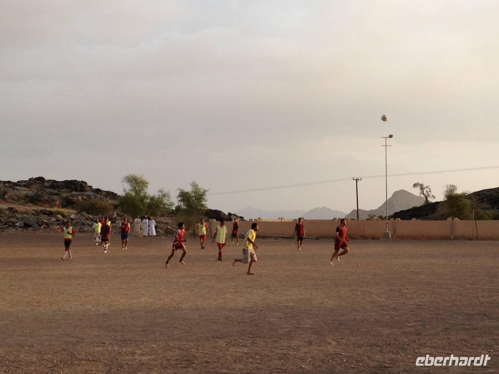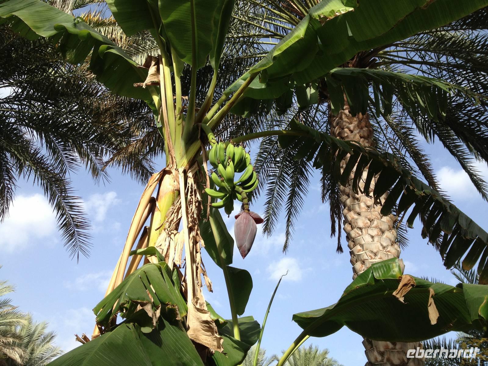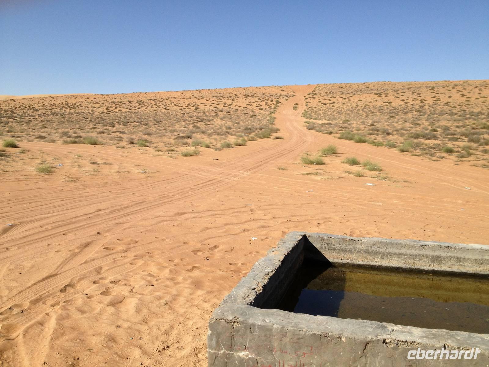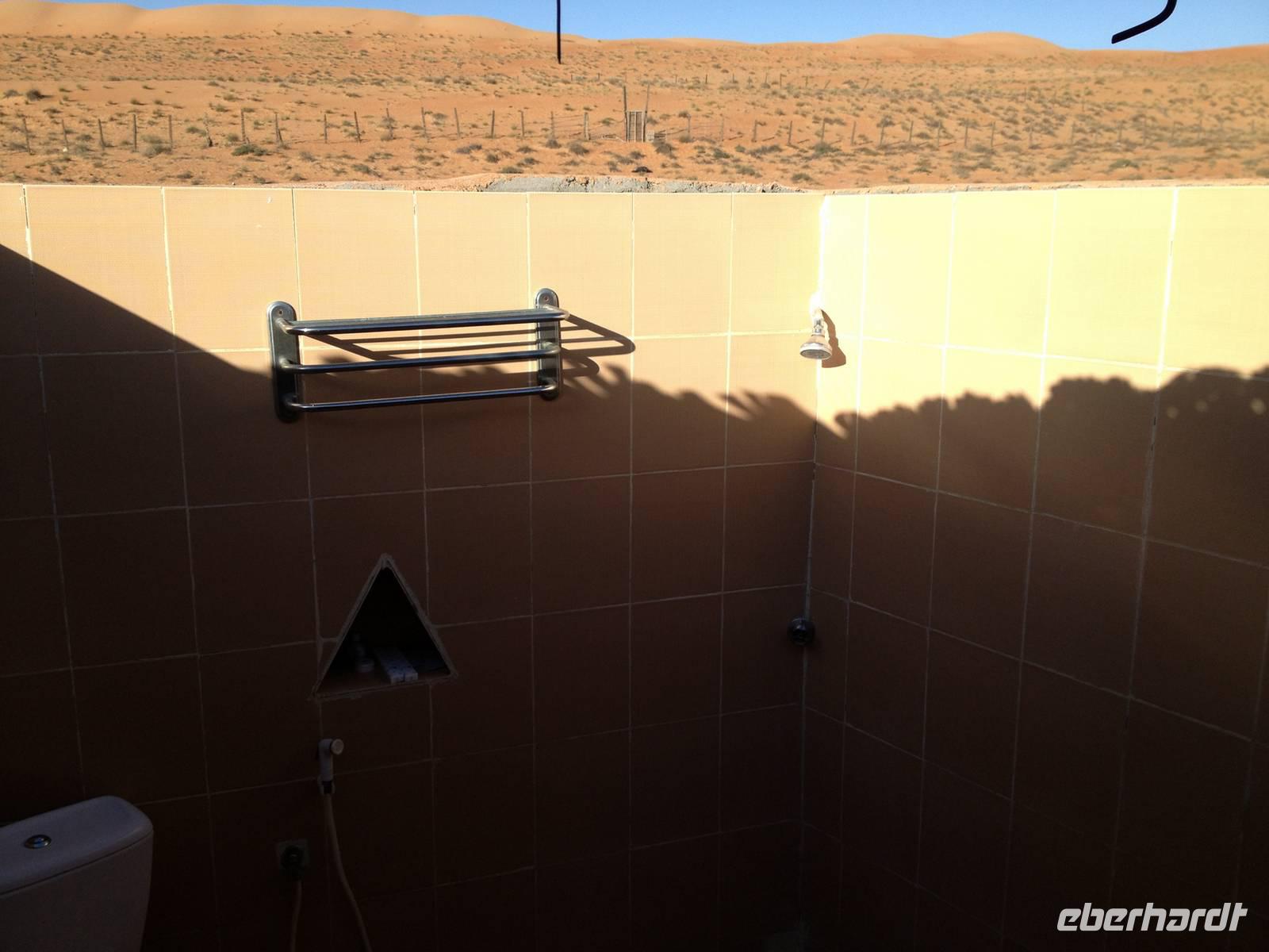 Am Rande der Wahiba-Wüste in der Ortschaft Bidiyyah zweigte eine kleine Straße links ab. Es ging steil hinauf. Ein paar Häuser am Wegesrand, plötzlich immer mehr Palmen, ein ganzer Wald auf einmal. Hier muss Wasser sein, aber es war nur ein Rinnsal zu sehen. Das Rinnsal ist ein Wadi, ein Flusslauf, der mehrmals im Jahr austrocknet. Das Wadi Bani Khalid verwandelt sich viermal im Jahr vom Rinnsal zu einem reißenden Strom. Dann ist es sogar nicht ganz ungefährlich, mit dem Auto eine der Furten zu queren. Normalerweise aber ist das Flussbett trocken und staubig. Wir stiegen aus und spazierten auf einem befestigten Weg und den Wasserkanälen weiter hinauf zur Quelle der Oase. Nach einer Viertelstunde öffnete sich das enge Tal und es empfing uns ein riesiger Teich mit smaragdgrünem Wasser: das Herz der Oase. Einige nutzen gleich die Gelegenheit, im herrlichen Wasser zu schwimmen. Leider viel zu schnell verging die Zeit und wir mussten weiter in Richtung Wüste. An einer Autowerkstatt ließen die Fahrer für die Durchquerung der Wahiba Sands etwas Luft aus den Reifen, damit sie im Sand griffiger wurden. Nach wenigen Kilometern waren wir in einer anderen Welt! Dunkelgelb bis rötlich leuchteten die Sanddünen im späten Abendlicht und die langen Schatten legten sich während des Sonnenuntergangs malerisch über die vom Wind geformten Dellen. Nach Einbruch der Dunkelheit erreichten wir das Safari Desert Camp inmitten der Wüste und bezogen unsere Hütten. Zum Abendessen saßen wir wie die Beduinen auf dem Boden und ließen den ersten Abend in einer Welt von Nichts ausklingen.