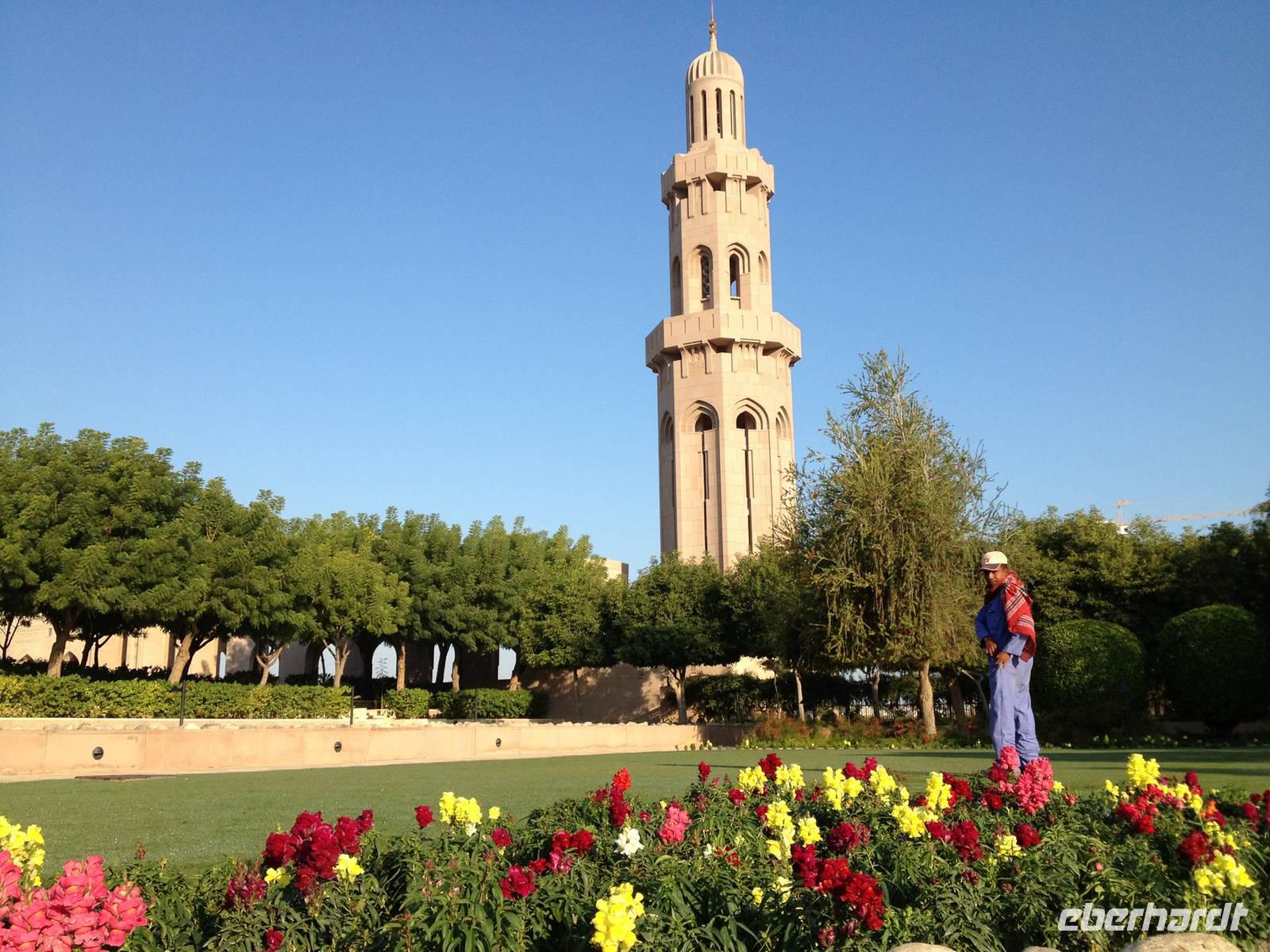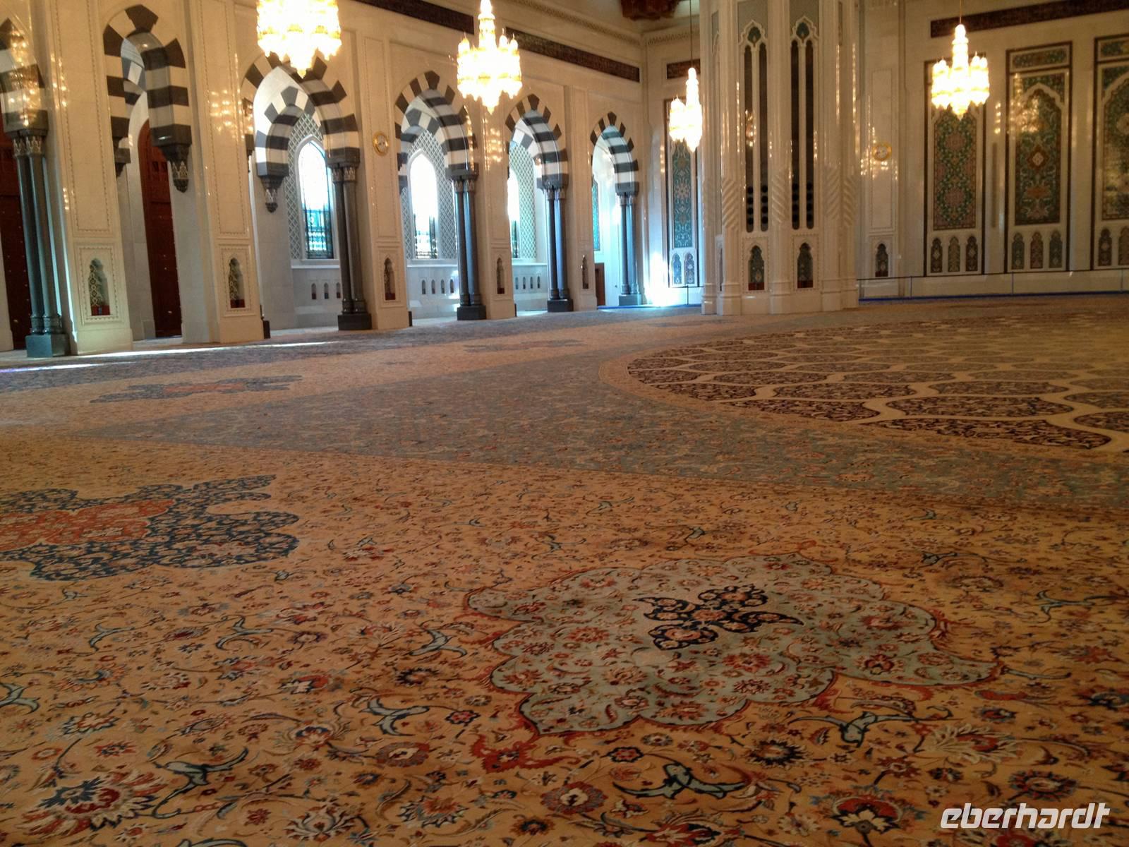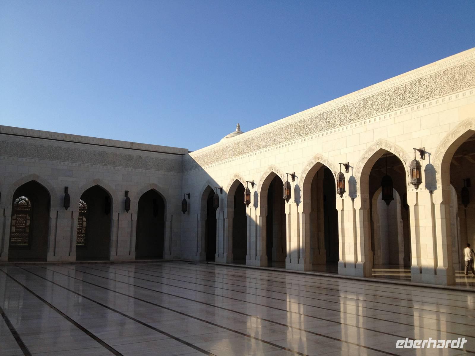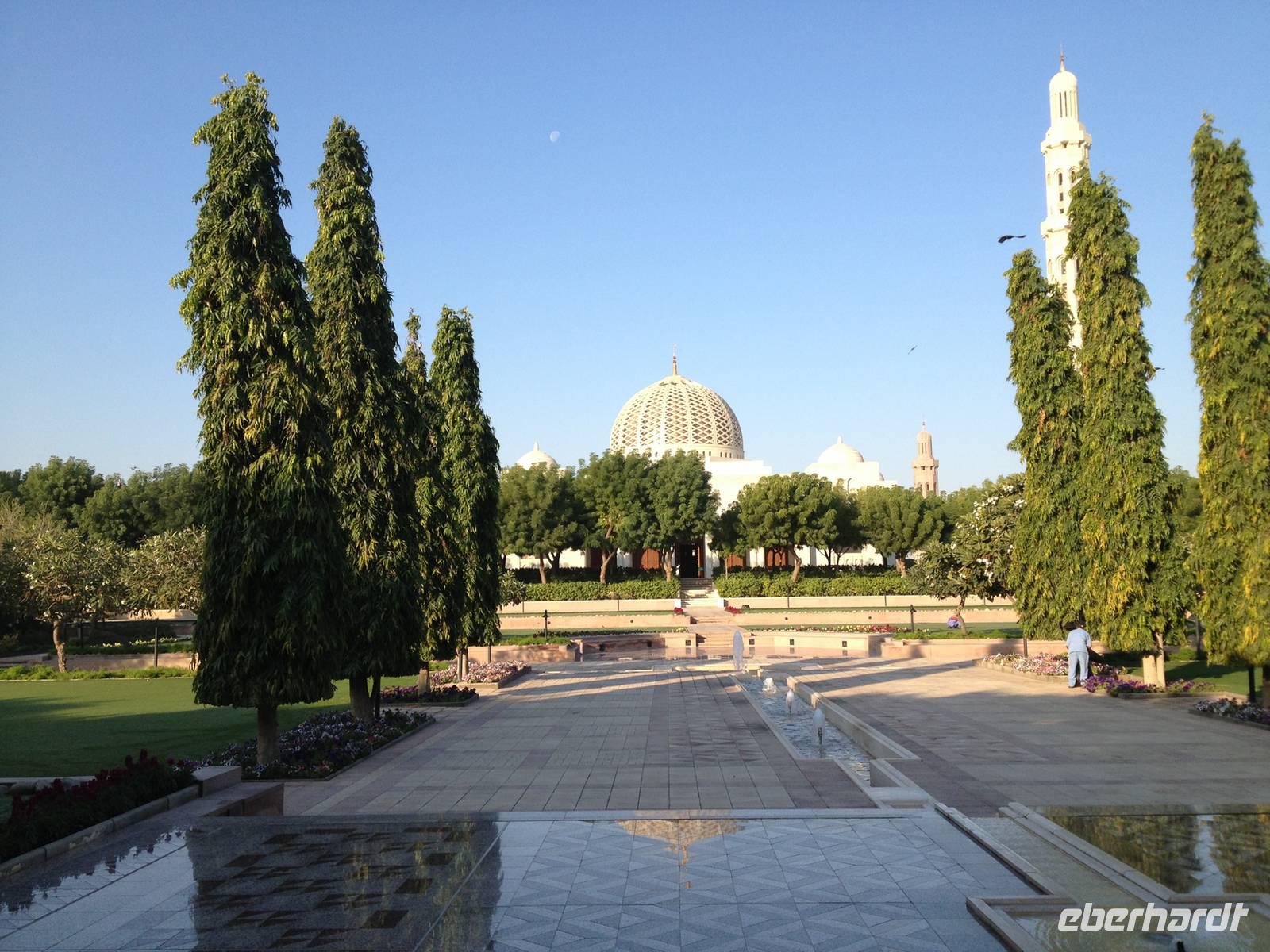 Zeitig klingelte heute der Wecker. Wir hatten viel vor! Der erste Programmpunkt war die sonnendurchflutete Sultan-Qaboos-Moschee. Sie gehört mit ihren reichen Verzierungen und dem wunderschön angelegten Park zu den prächtigsten Bauten des Sultanats. Sie ist eine Moschee der Superlative! Im Jahre 2001 wurde die Grand Mosque fertiggestellt. Der ruhigen, jedoch im Detail reichen Architektur der Moschee gelingt es, höchst unterschiedliche gestalterische islamische Traditionen verschiedenster Epochen und Regionen in großer Harmonie zusammenzuführen.Dieses Prinzip der Gestaltung ist auch Sinnbild für das Ideal der omanischen Gesellschaft, die in sich die verschiedensten islamischen Traditionen und Ausrichtungen unter dem Dach der Ibadhiyah friedlich vereint. Die 61 mal 71 Meter große Gebetshalle bietet 6.600 Gläubigen Platz für das Gebet. Sie ist mit einem 4.263 Quadratmeter großen Teppich ausgelegt, einem Meisterwerk persischer Teppichwebkunst. Das optische Gegenstück zum edlen Teppich stellt die reich mit Kalligraphien und Arabesken verzierte Holzdecke dar. Der ganze Raum wird von einer 34 Meter hohen Kuppel dominiert. In ihrer Mitte hängt ein 8 Tonnen schwerer Lüster aus Swarovski-Kristall, dessen 1.122 Lampen die Kuppel in ein magisches Licht tauchen.