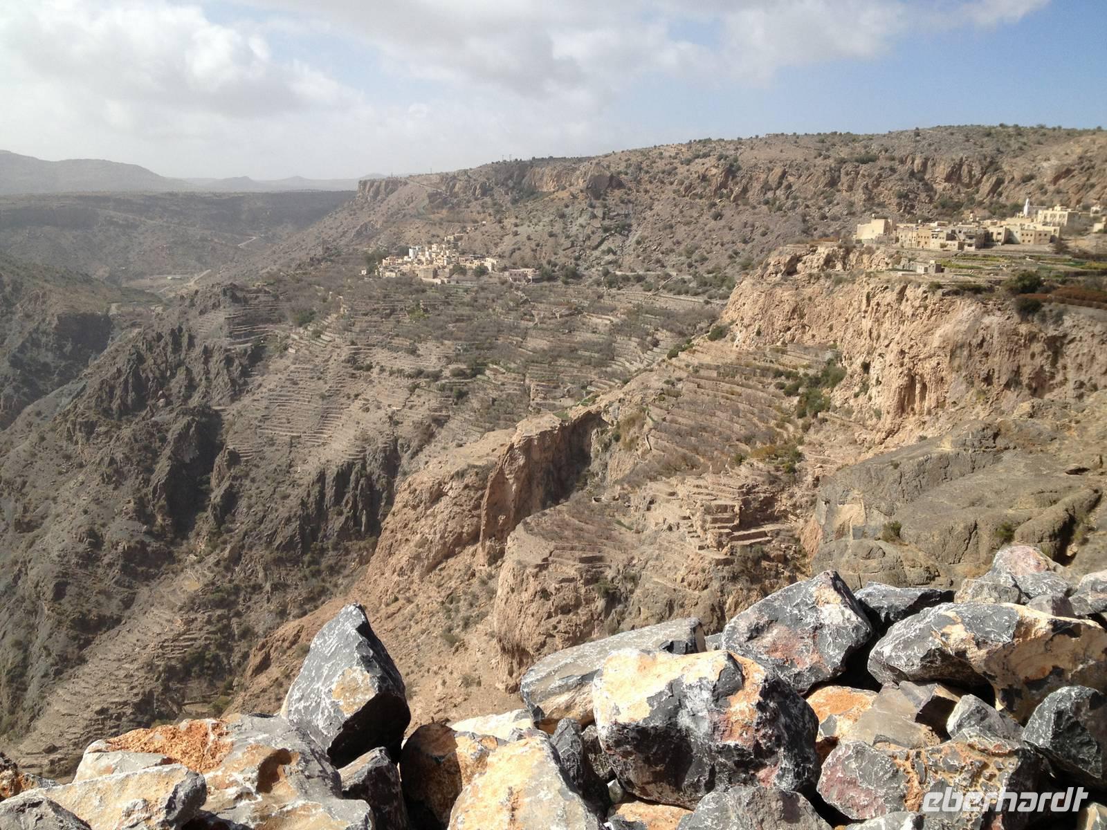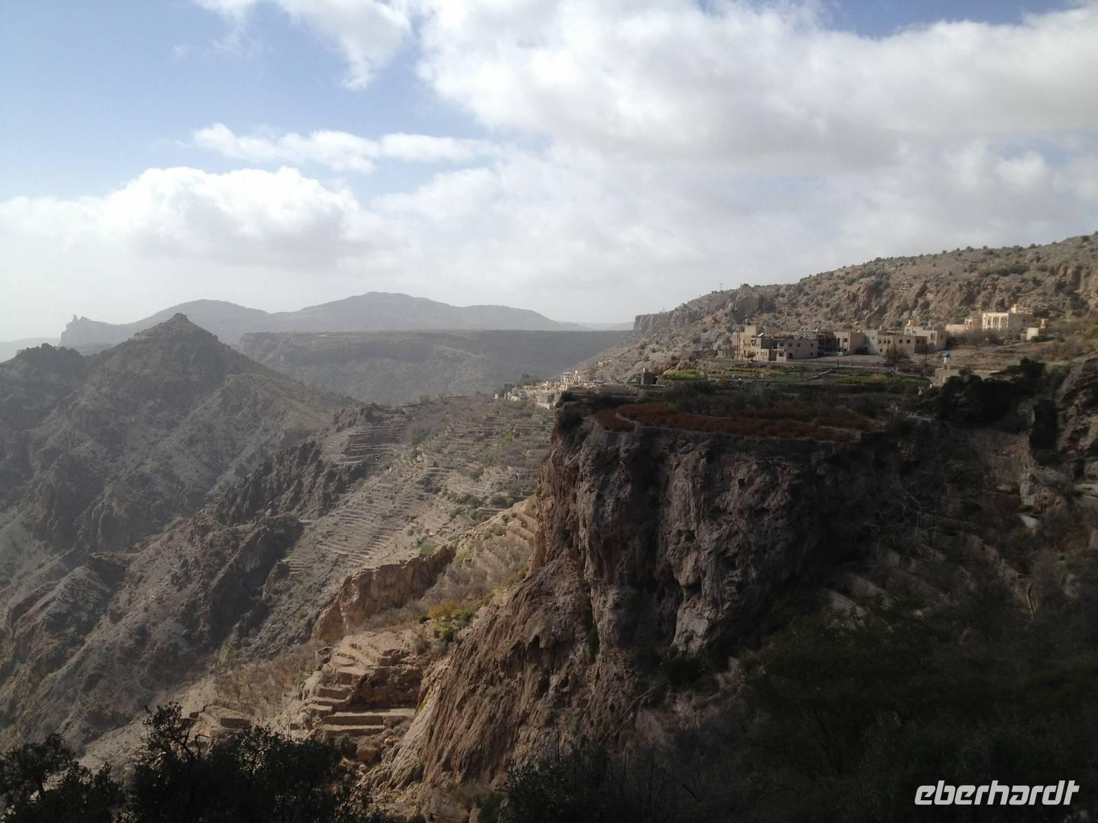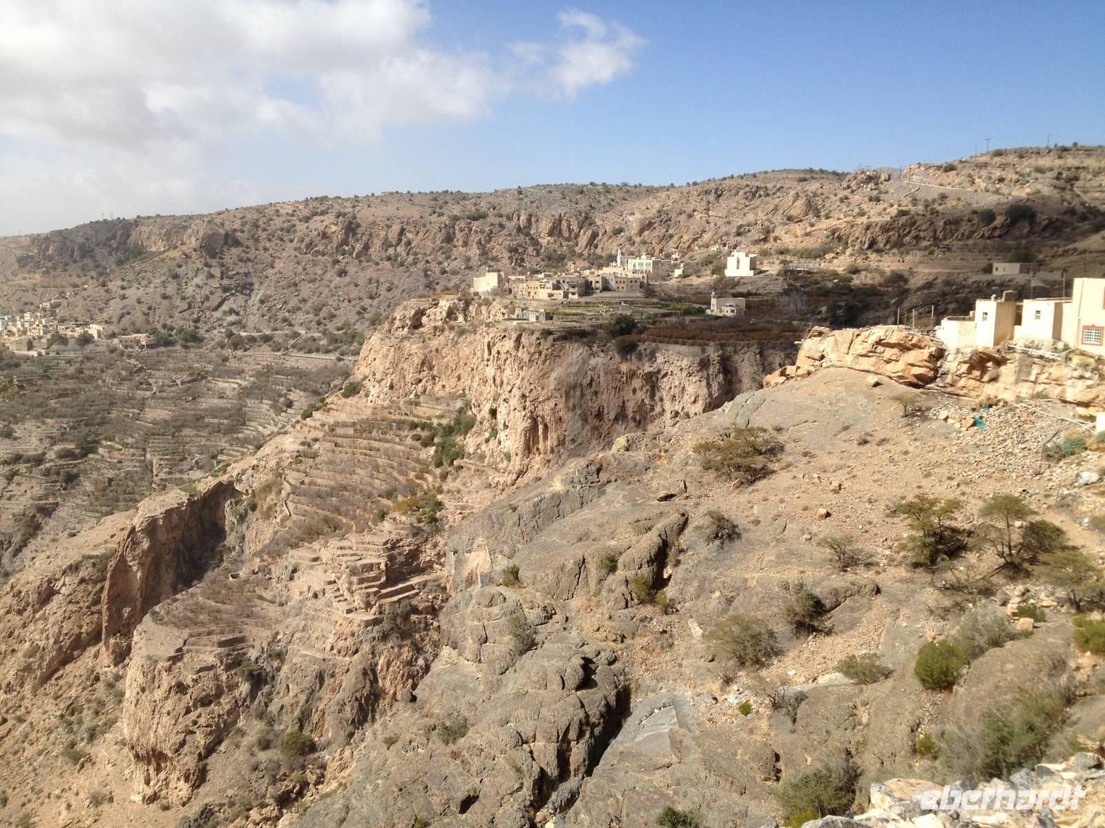 Verstreut in der Landschaft liegen kleine Ortschaften wie Saiq, Wadi Bani Habib oder Al Ayn mit einem spektakulären Blick über Berggipfel, Schluchten und Wadis. Um uns auch wieder etwas aktiv zu bewegen, unternahmen wir eine kleine Wanderung. Die enge Hauptgasse des Dorfes Al Sharjiah führte uns geradewegs durch die Gärten zu einem kleinen Wadi und schließlich nach Al Ayn. Wir wanderten auf den Falaj-Systemen und wurden stets von tollen Ausblicken über die Terrassenfelder entlang des Hanges und über den Canyon belohnt. Danach hatten wir uns das Mittagessen im Jabal Akhdar Hotel wirklich verdient!