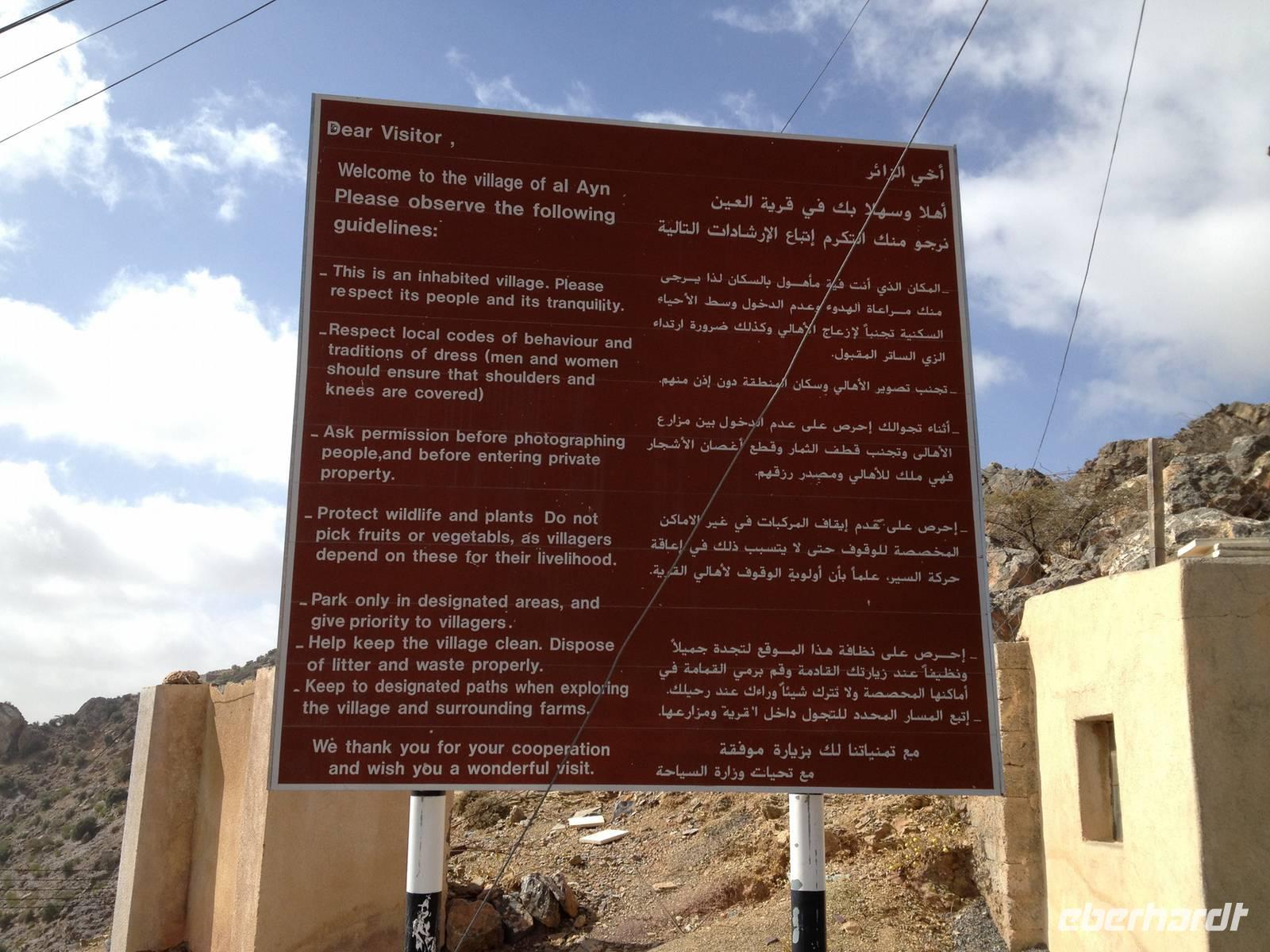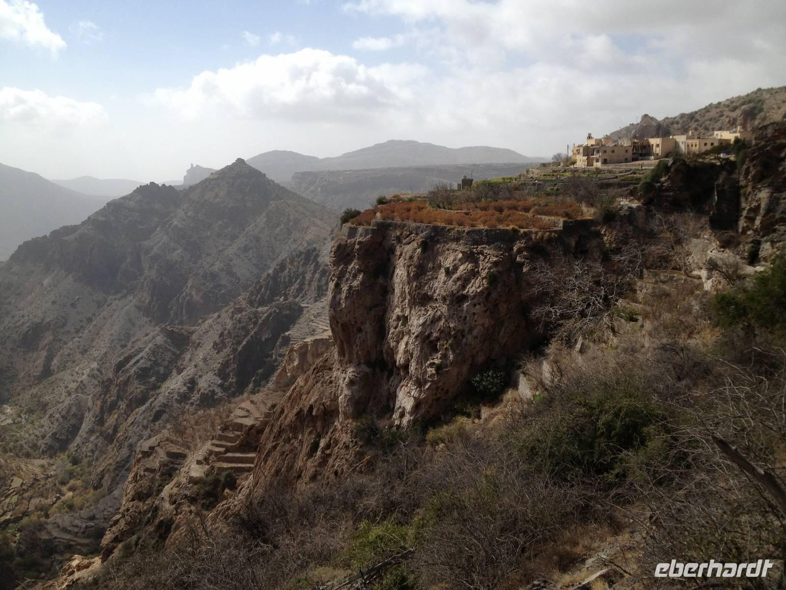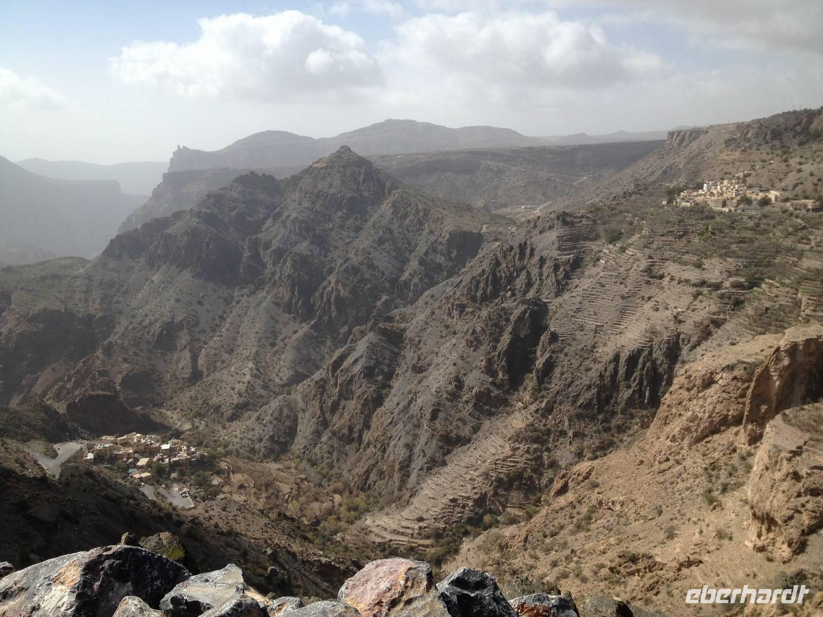 Verstreut in der Landschaft liegen kleine Ortschaften wie Saiq, Wadi Bani Habib oder Al Ayn mit einem spektakulären Blick über Berggipfel, Schluchten und Wadis. Um uns auch wieder etwas aktiv zu bewegen, unternahmen wir eine kleine Wanderung. Die enge Hauptgasse des Dorfes Al Sharjiah führte uns geradewegs durch die Gärten zu einem kleinen Wadi und schließlich nach Al Ayn. Wir wanderten auf den Falaj-Systemen und wurden stets von tollen Ausblicken über die Terrassenfelder entlang des Hanges und über den Canyon belohnt. Danach hatten wir uns das Mittagessen im Jabal Akhdar Hotel wirklich verdient!